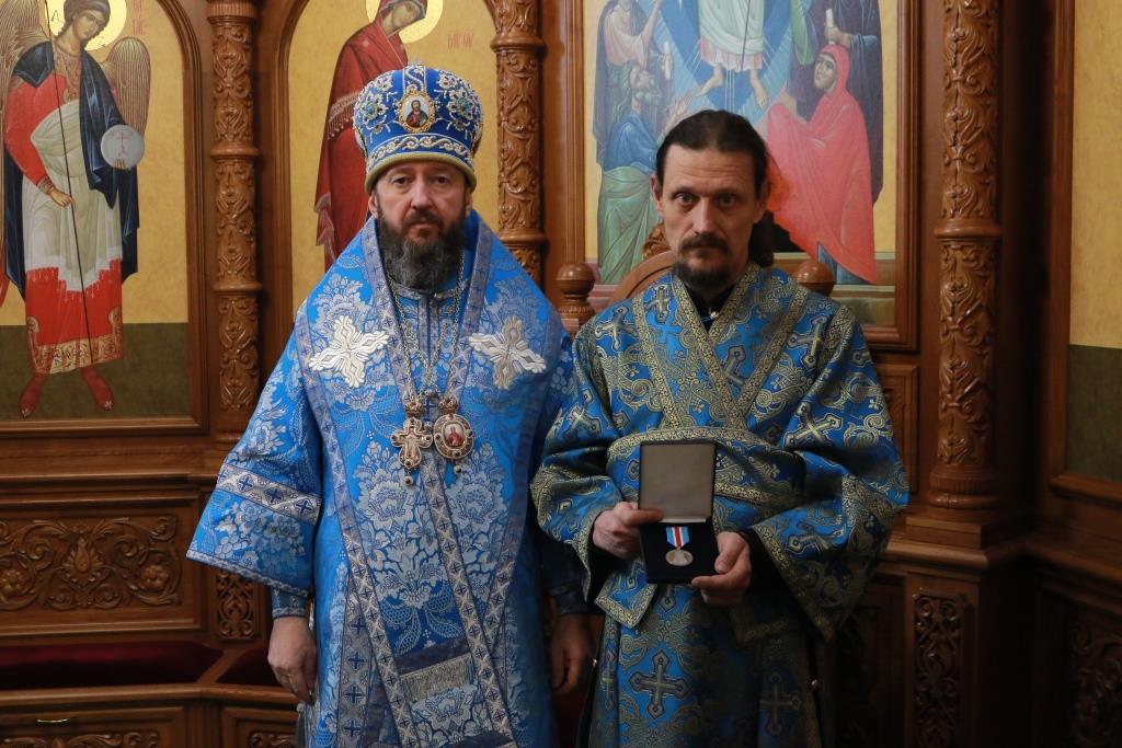 За богослужением епископ Амфилохий наградил алтарника кафедрального собора Владимира Сидехменова медалью Православной Церкви Казахстана в честь священноисповедника Николая, митрополита Алма-Атинского. Высокая церковная награда была вручена в связи с 50-летием со дня рождения.
