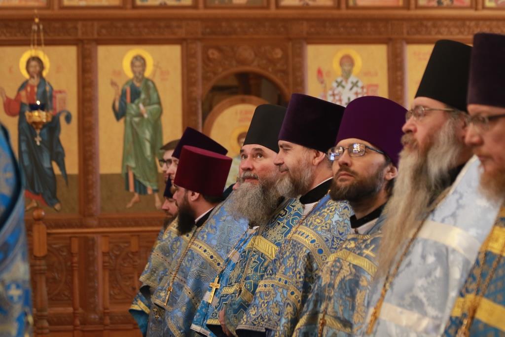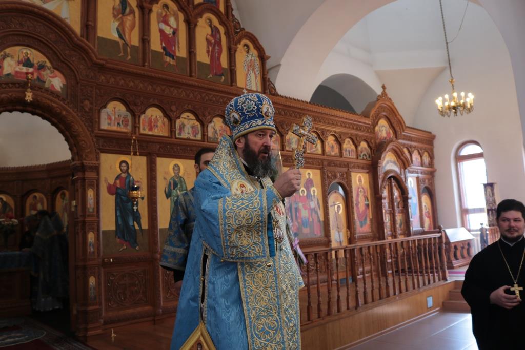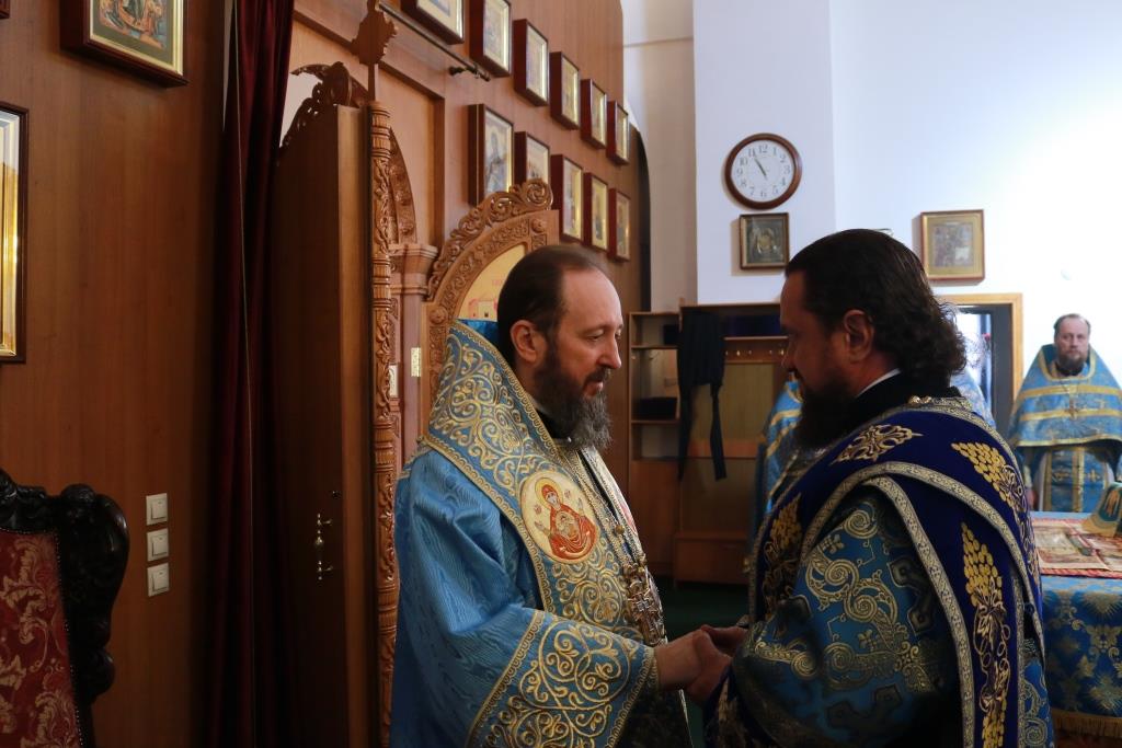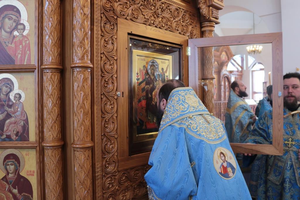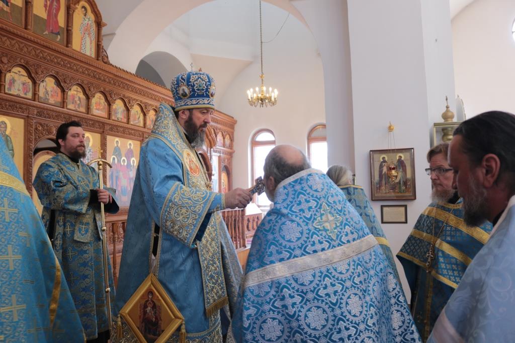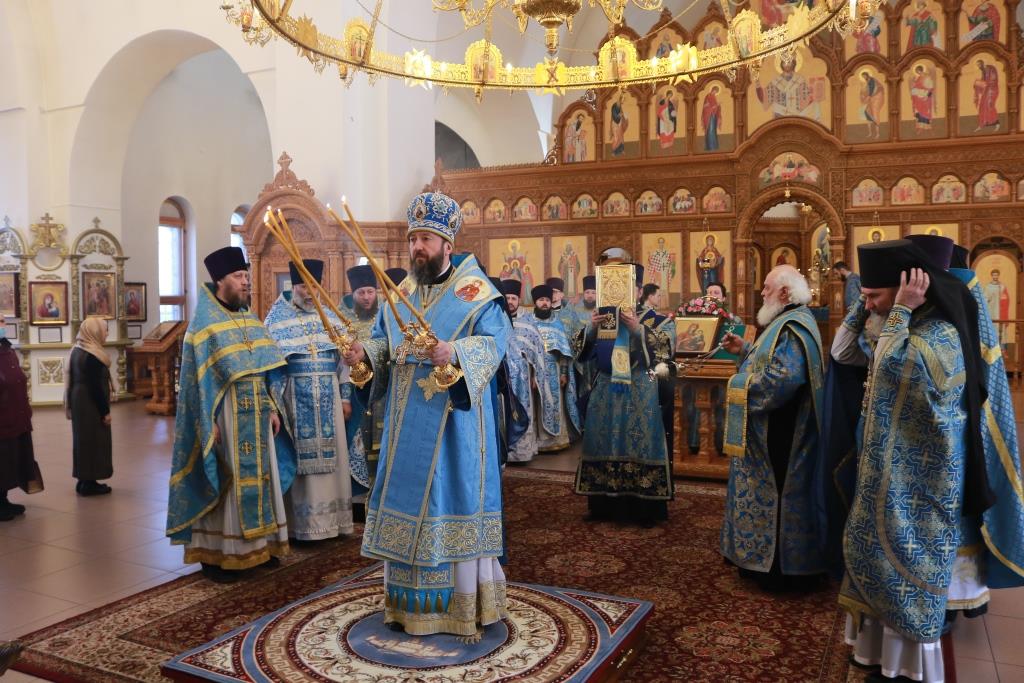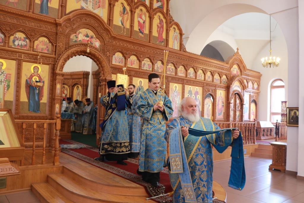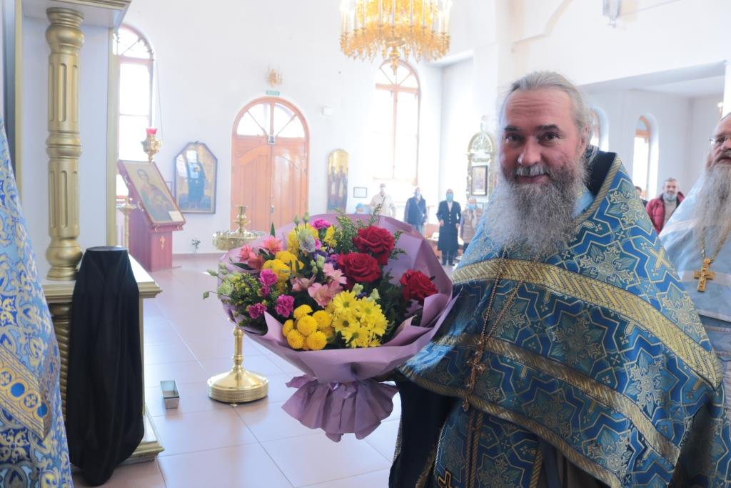 После заамвонной молитвы епископ Амфилохий с духовенством совершил славление пред Иверским образом Царицы Небесной, после чего благочинный Усть-Каменогорского церковного округа иерей Алексий Анищенко от лица духовенства и паствы огласил поздравительное слово епископу Амфилохию. Затем Владыка епископ обратился к собравшимся со словами поучения.