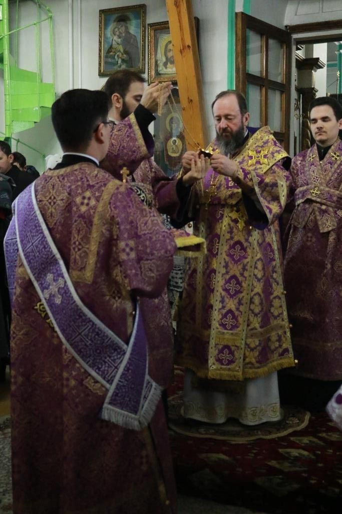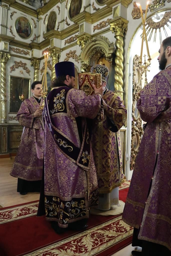 Его Преосвященству сослужили: благочинный Семипалатинского церковного округа иерей Вячеслав Гутов, клирики храма протоиерей Александр Юркин, иерей Евгений Хохряков и иерей Иоанн Толмачев; клирики Андреевского кафедрального собора иерей Роман Подрезов и иеромонах Мефодий (Шевчук), секретарь епархии диакон Илья Кван, протодиакон Андрей Дудник, диакон Николай Белоконь. Песнопения Литургии и Недели Крестопоклонной исполнял хор Воскресенского собора (регента – Ю. Хохрякова). На сугубой ектении Архипастырь вознес молитву о мире на Украине.