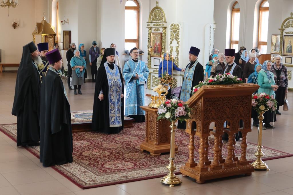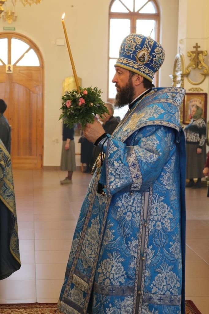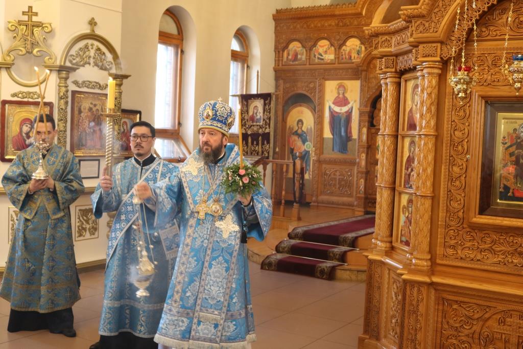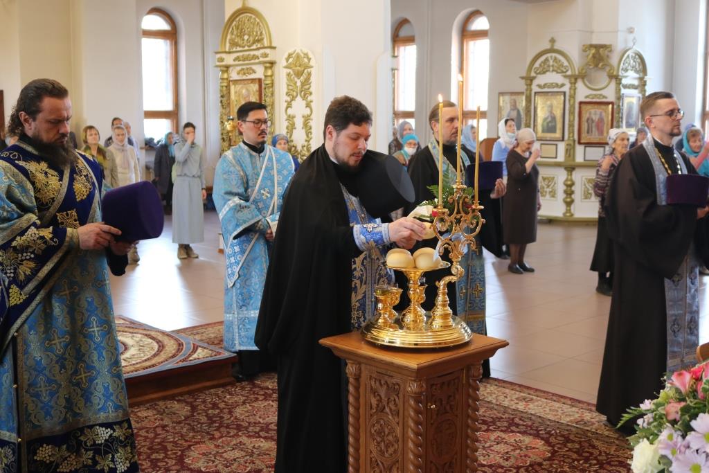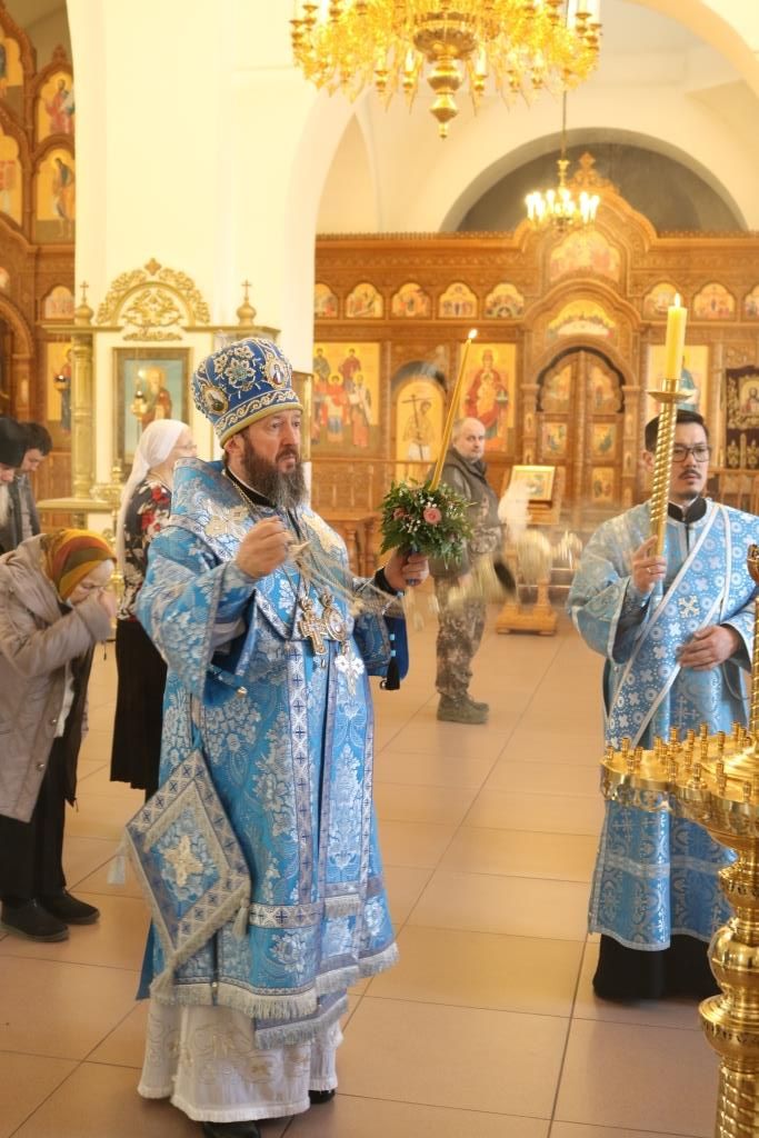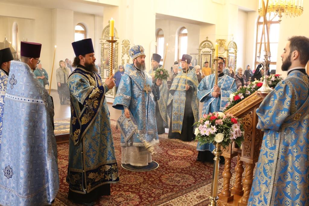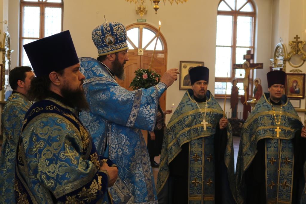 Его Преосвященству сослужили: ключарь собора иеромонах Никодим (Авдеев), клирики собора иерей Алексий Клепиков, иеромонах Силуан (Магилев), иерей Роман Подрезов, иерей Константин Дьяков, секретарь епархии диакон Илия Кван, протодиакон Андрей Дудник. Песнопения праздника Благовещения исполнял хор под управлением регента Н. Романцовой. За вечерним богослужением совершалась лития – сугубо моление с освящением пшеницы, хлеба, вина и елея.