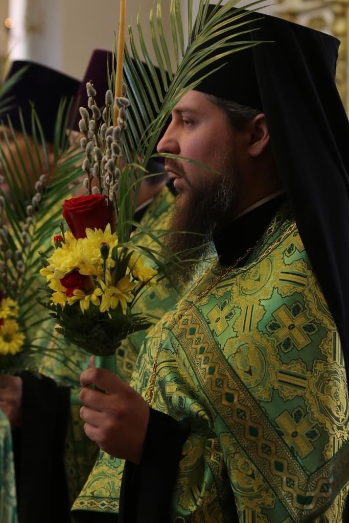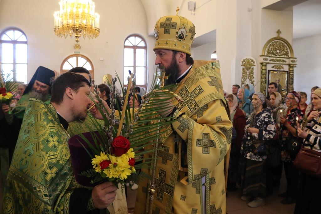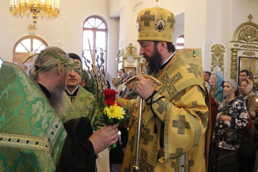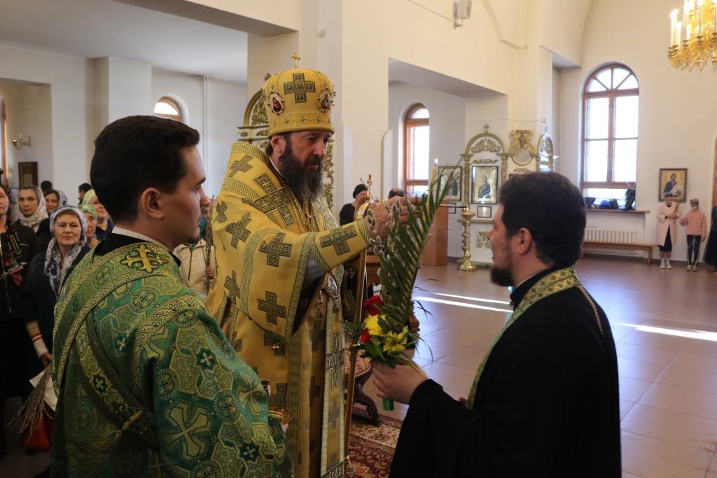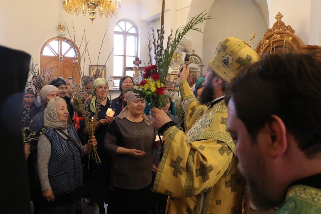Его Преосвященству сослужили: ключарь собора иеромонах Никодим (Авдеев) и духовенство главного храма епархии. Песнопения праздника Входа Господня в Иерусалим исполнял хор под управлением регента Н. Романцовой. За вечерним богослужением совершалась лития – сугубое моление с освящением пшеницы, хлеба, вина и елея.