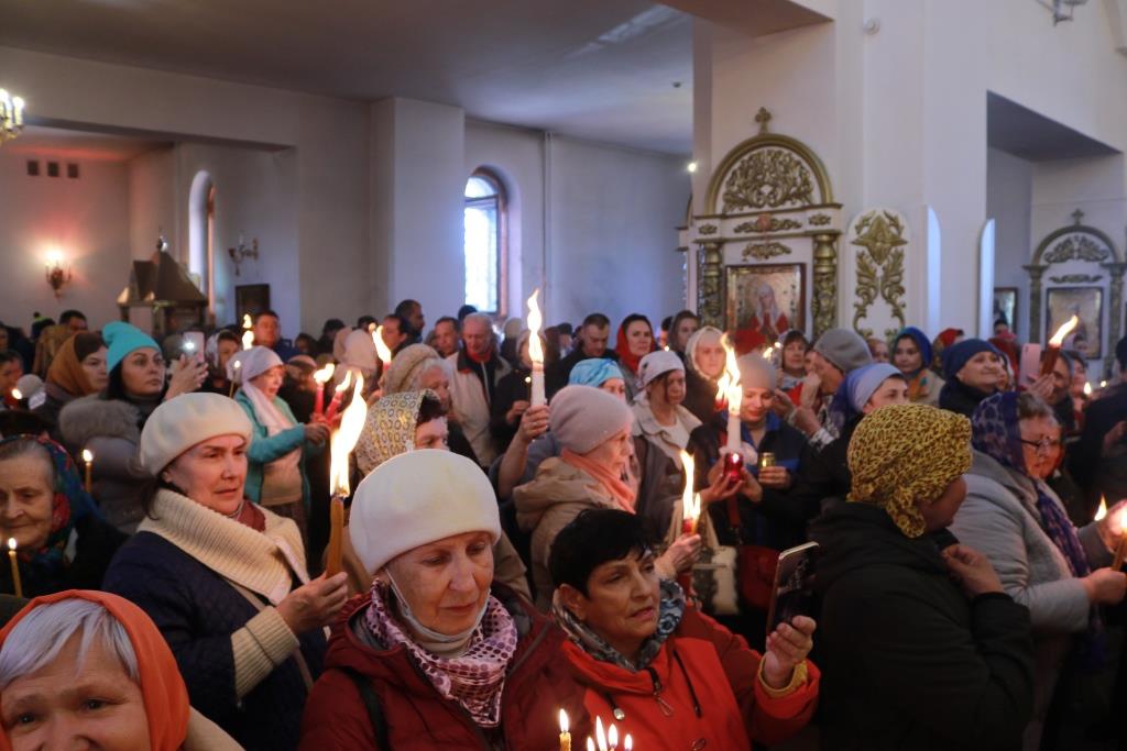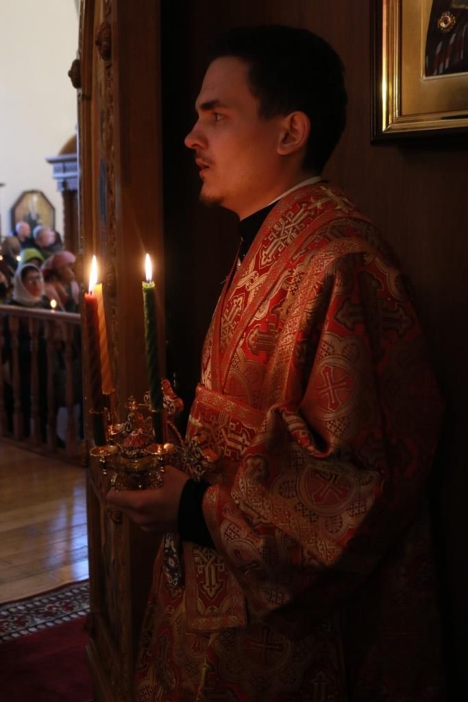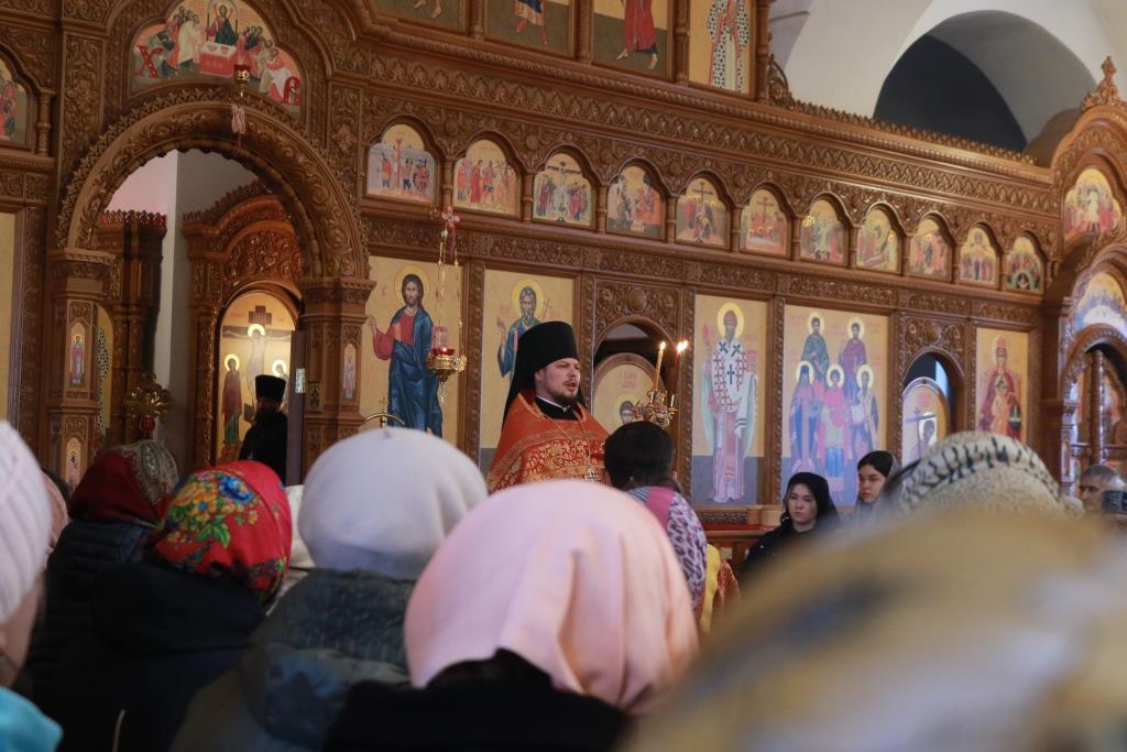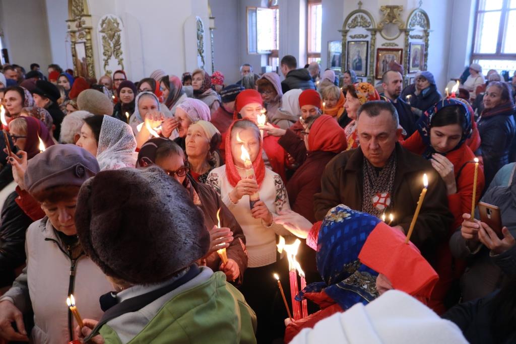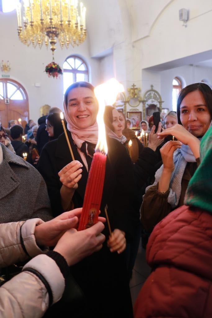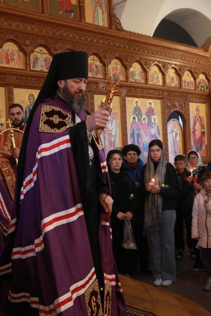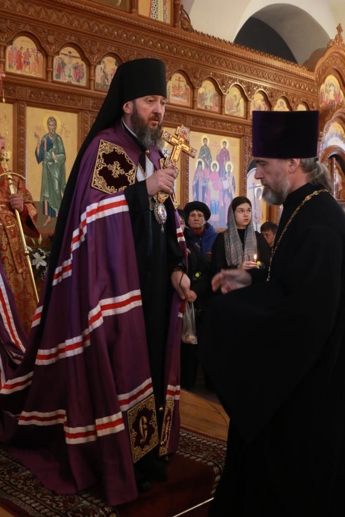 На вечернем богослужении молились сотрудники епархиального управления, братия Свято-Троицкой мужской обители города Усть-Каменогорска и прихожане кафедрального собора. За богослужением епископ Амфилохий прочитал Евангельское зачало о явлении Воскресшего Христа ученикам (Ин. 20:19-25).
