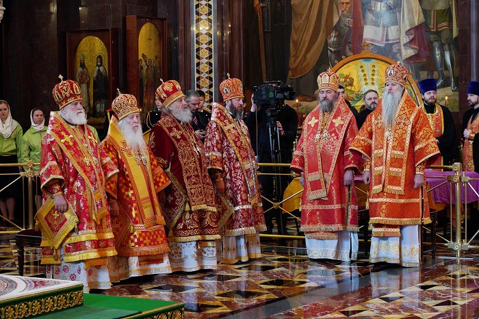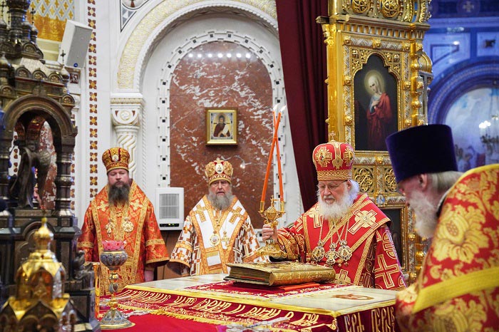 Его Литургией Святейшеству сослужили: митрополит Астанайский и Казахстанский Александр, Глава Православной Церкви Казахстана; митрополит Крутицкий и Коломенский Павел, Патриарший наместник Московской митрополии; митрополит Воскресенский Дионисий, управляющий делами Московской Патриархии, первый викарий Патриарха Московского и всея Руси по городу Москве; архиепископ Уральский и Атырауский Антоний; епископ Каскеленский Геннадий, управляющий делами Казахстанского Митрополичьего округа; епископ Павлодарский и Экибастузский Варнава; епископ Карагандинский и Шахтинский Севастиан; епископ Усть-Каменогорский и Семипалатинский Амфилохий; епископ Павлово-Посадский Силуан, заместитель управляющего делами Московской Патриархии; епископ Кокшетауский и Акмолинский Серапион; епископ Петропавловский и Булаевский Владимир; епископ Актюбинский и Кызылординский Игнатий; протопресвитер Владимир Диваков, секретарь Патриарха Московского и всея Руси по городу Москве; протоиерей Михаил Рязанцев, ключарь храма Христа Спасителя; архимандрит Алексий (Туриков), личный секретарь Святейшего Патриарха Кирилла; иерей Георгий Сидоров, руководитель административного секретариата Главы Казахстанского Митрополичьего округа; клирики Митрополичьего округа в Республике Казахстан, клирики Патриарших подворий, клирики и насельники ставропигиальных монастырей и подворий, московское духовенство.