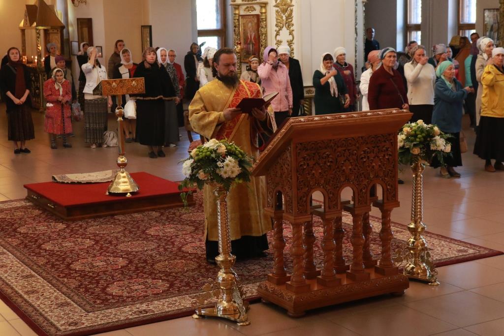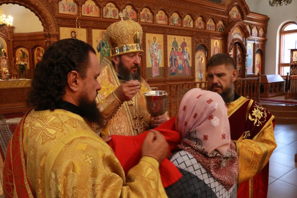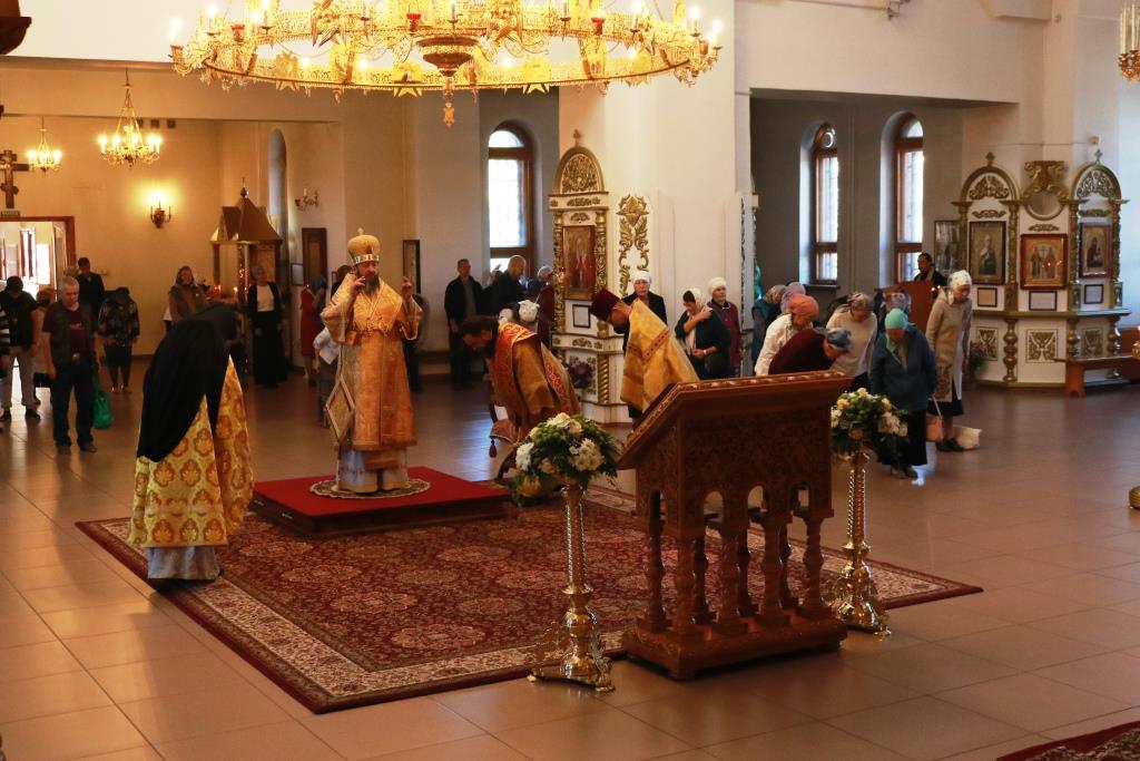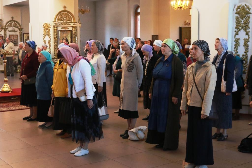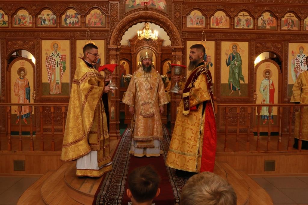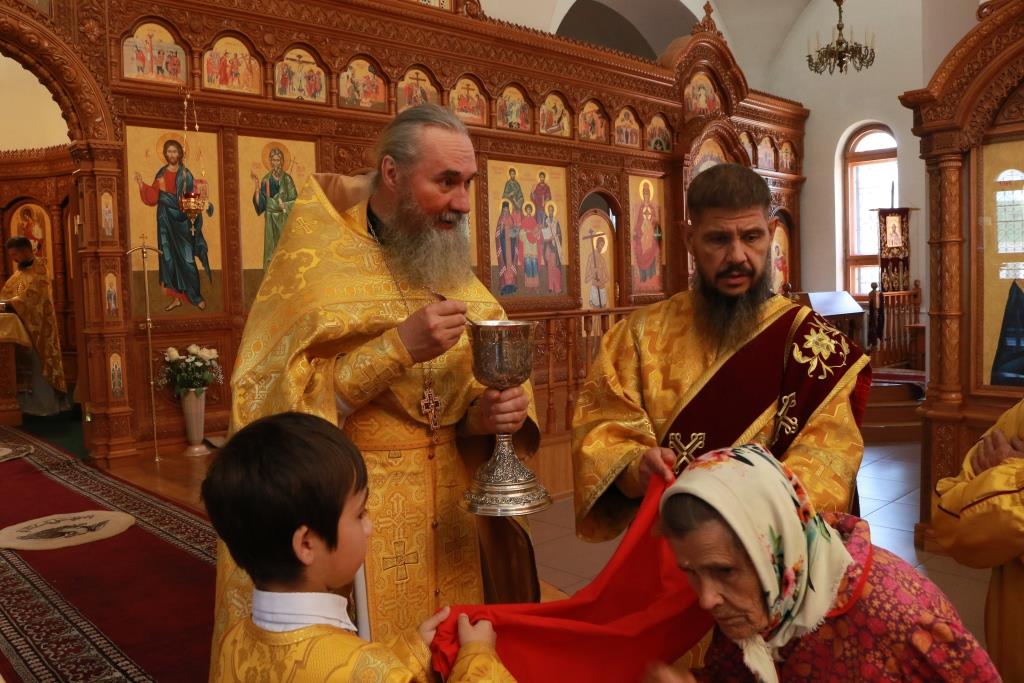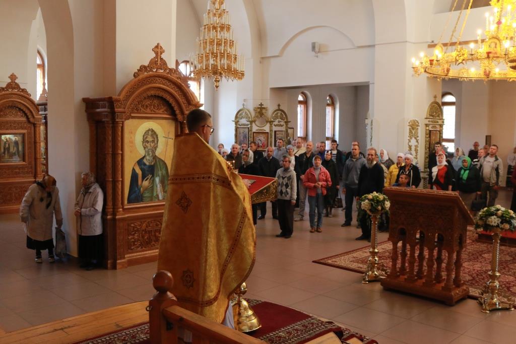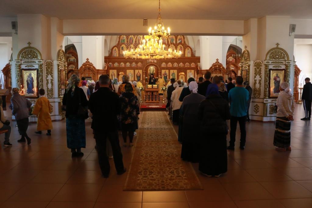 Песнопения Божественной Литургии исполнял хор кафедрального собора под управлением регента Н. Романцовой. За воскресным богослужением молились сотрудники епархиального управления, насельники Свято-Троицкого мужского монастыря города Усть-Каменогорска, паломники и прихожане Андреевского собора. Перед причастием мирян проповедовал иерей Константин Дьяков.
