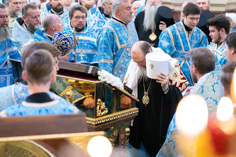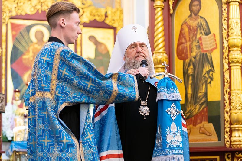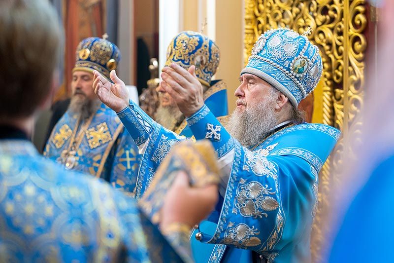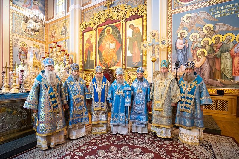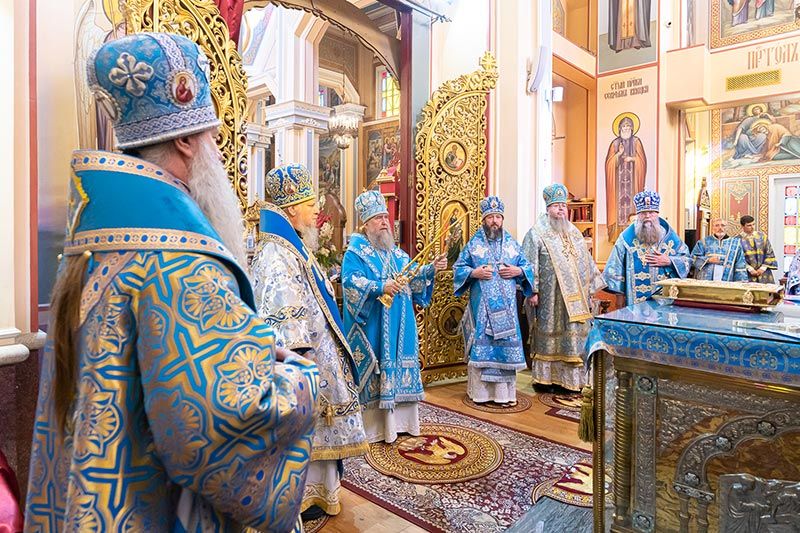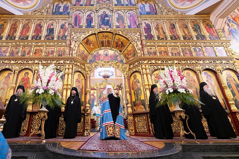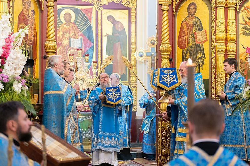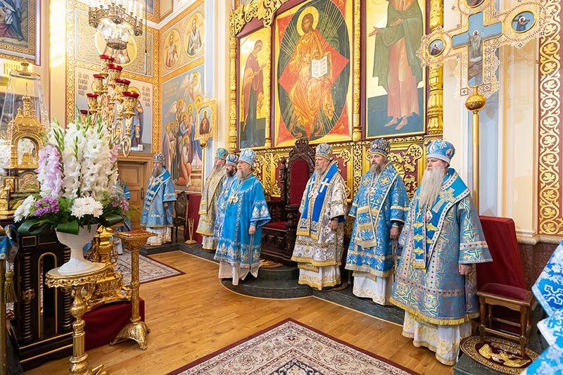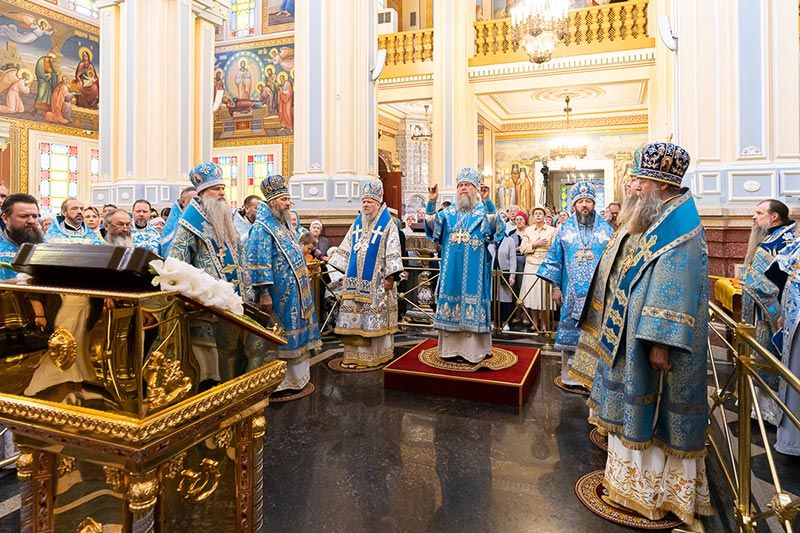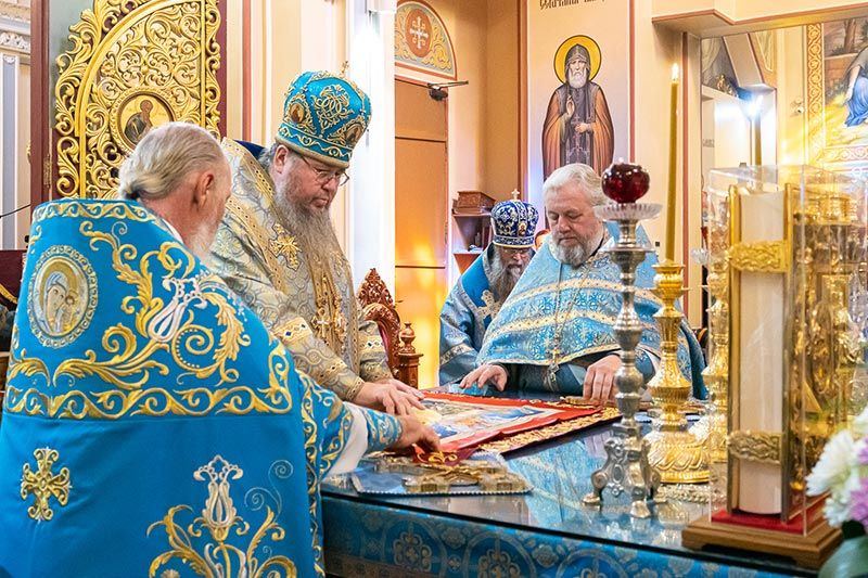 Богослужение завершилось славлением Пресвятой Богородице перед изображением Плащаницы Царицы Небесной и Феодоровским образом, после чего митрополит Александр сердечно поздравил архипастырей, духовенство, монашествующих и мирян с сугубыми торжествами, посвященными Божией Матери. В своей проповеди владыка митрополит рассказал собравшимся об истории обретения Феодоровской иконы Пресвятой Богородицы, благодатной помощи и чудесах, явленных от этого образа.