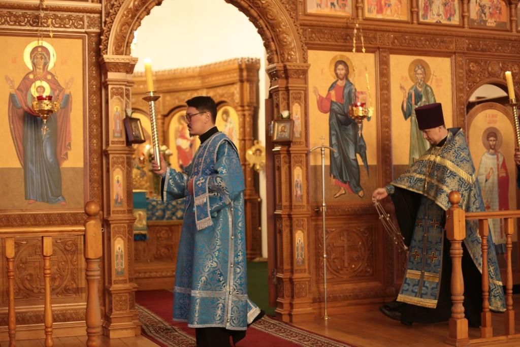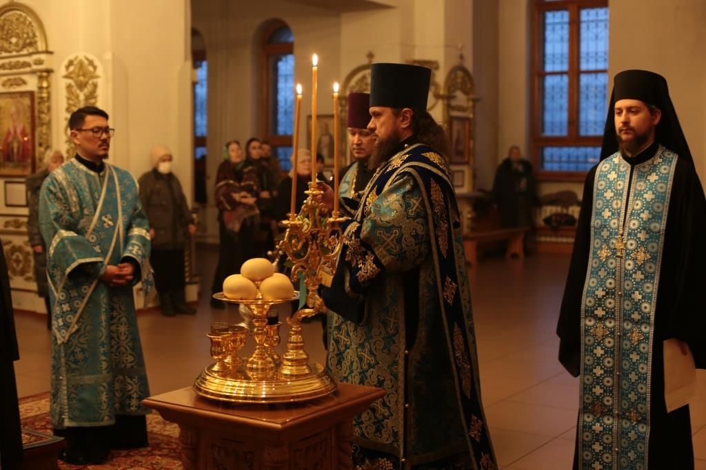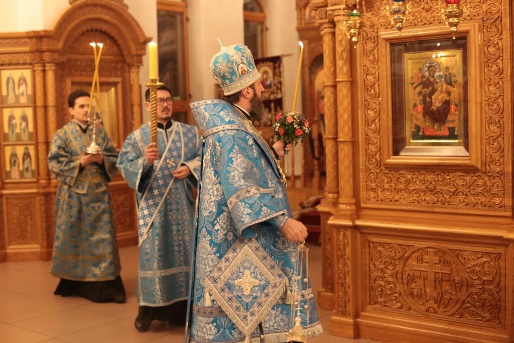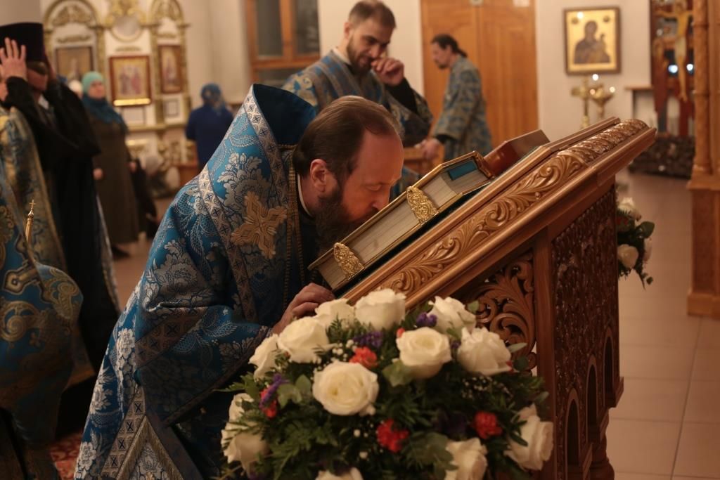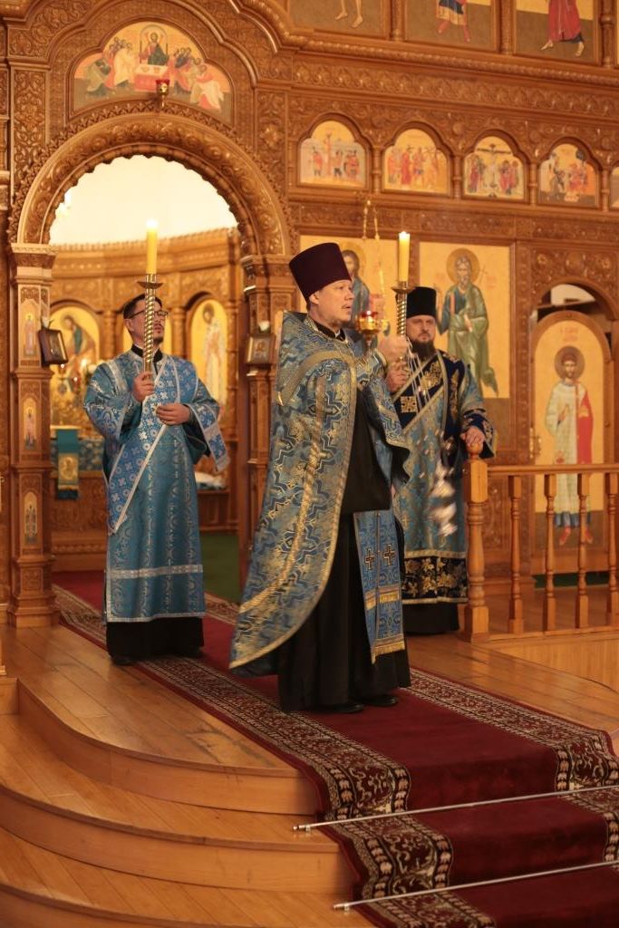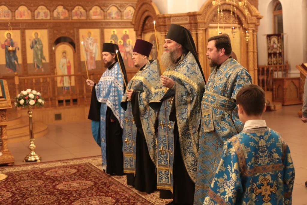 За вечерним богослужением молились прихожане и паломники кафедрального собора, насельники Свято-Троицкого мужского монастыря города Усть-Каменогорска, сотрудники епархиального управления. Песнопения всенощного бдения и праздника Божией Матери исполнял хор Андреевского собора, регент – Н. Романцова.