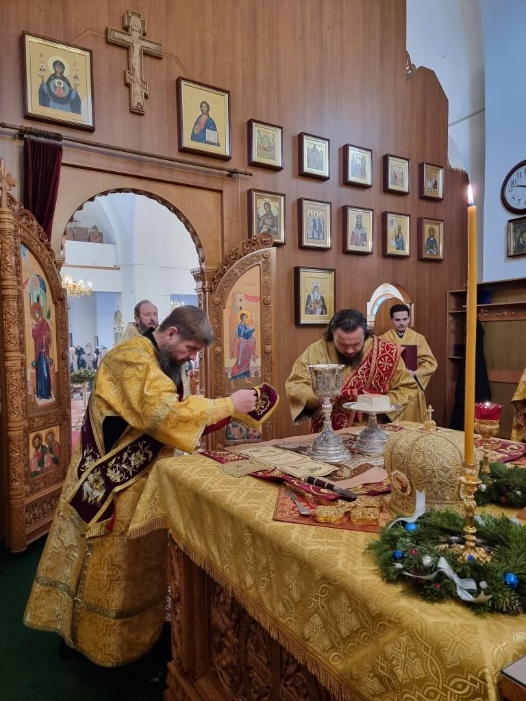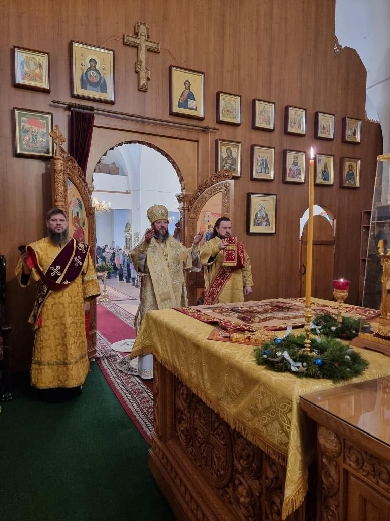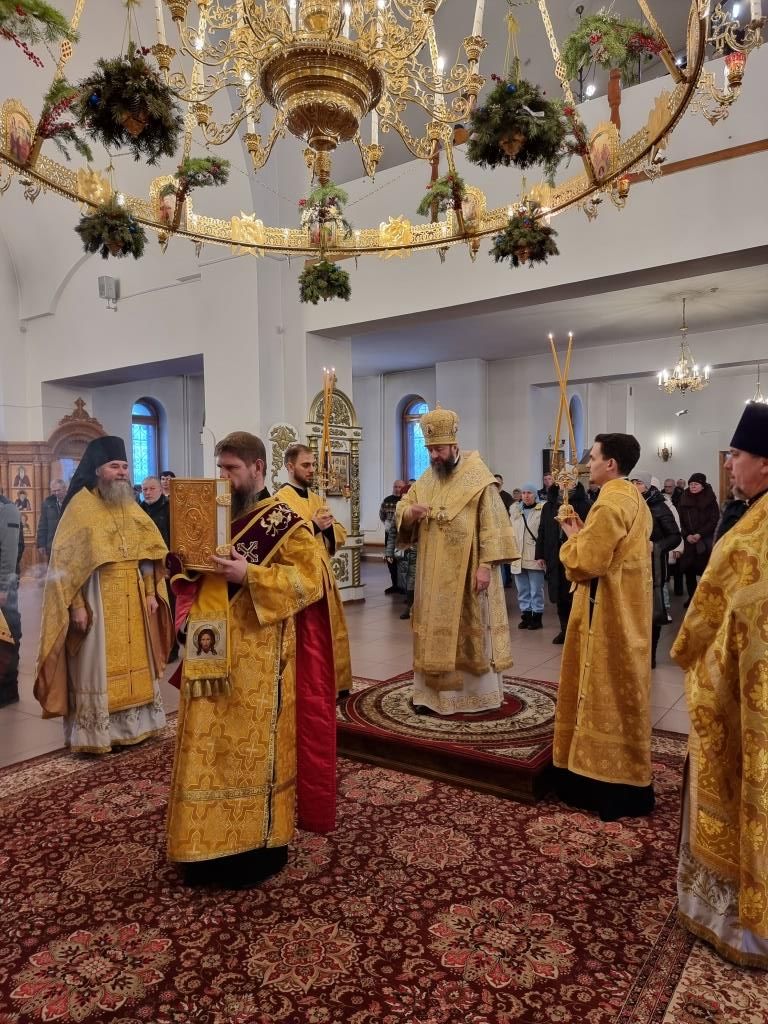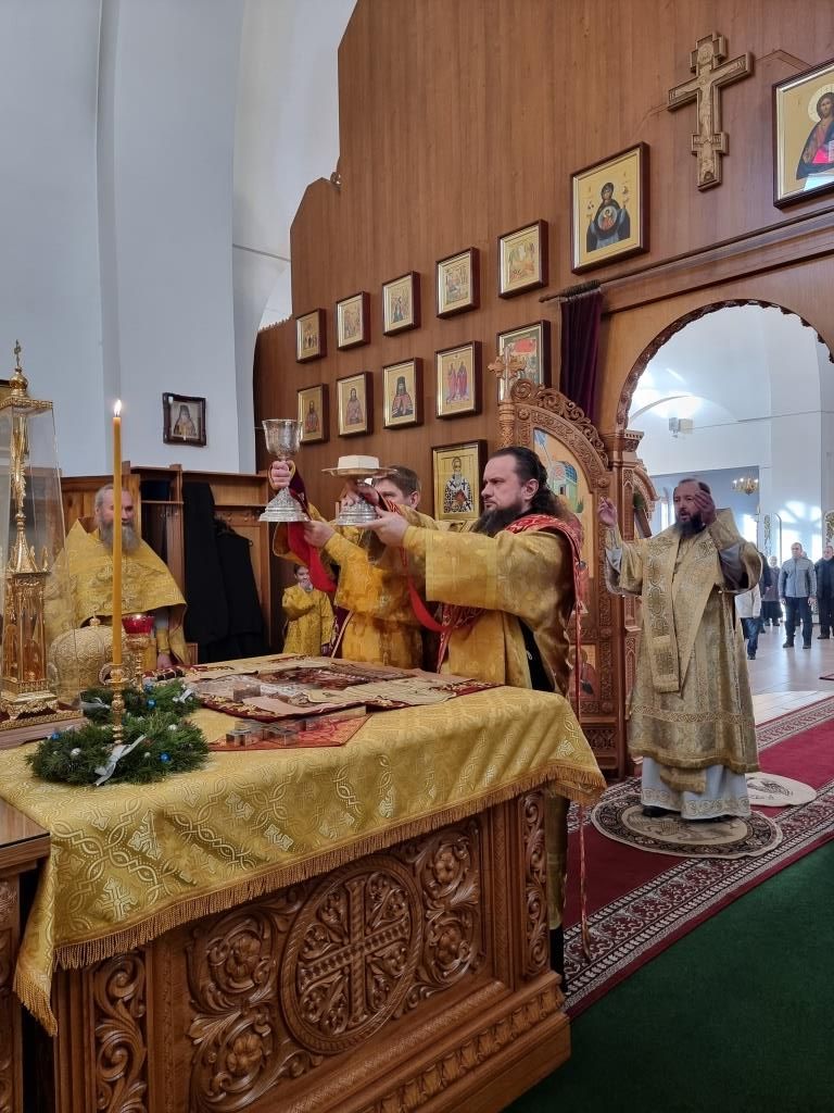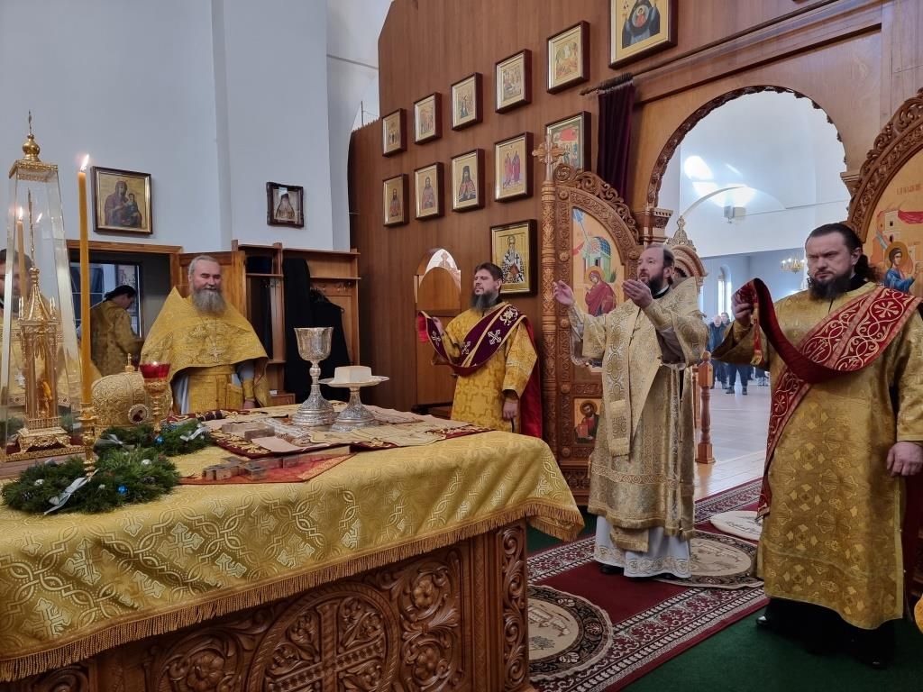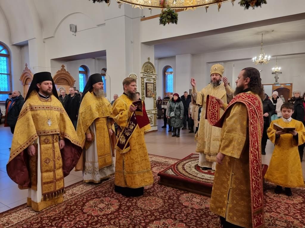 Архипастырю сослужили: ключарь кафедрального собора иеромонах Никодим (Авдеев), клирики собора иерей Алексий Клепиков, иеромонах Мефодий (Шевчук), протодиаконы Георгий Засыпкин и Андрей Дудник. Песнопения Божественной Литургии исполнял хор кафедрального собора под управлением регента Н. Романцовой.