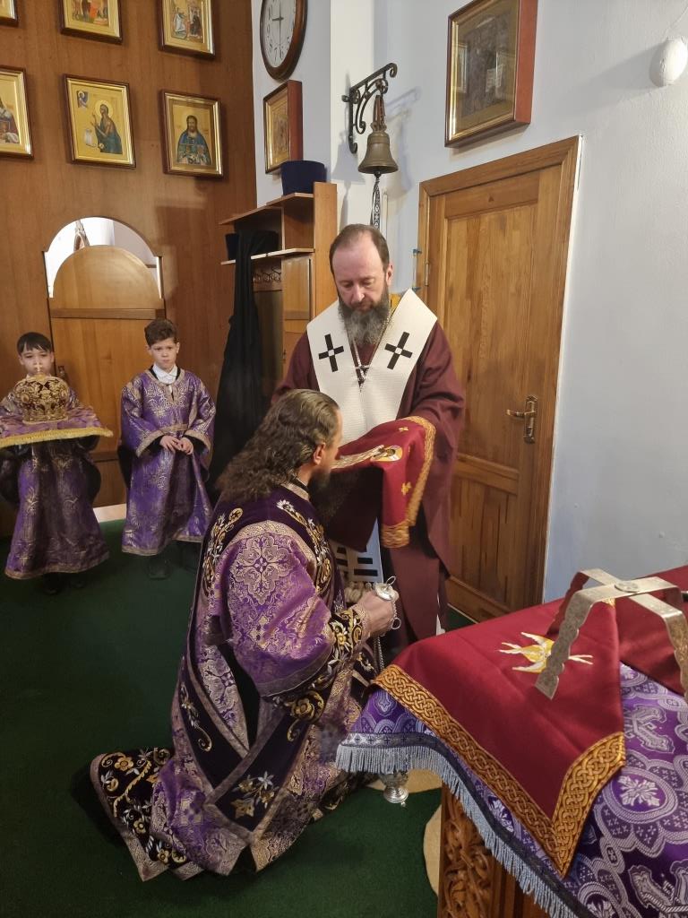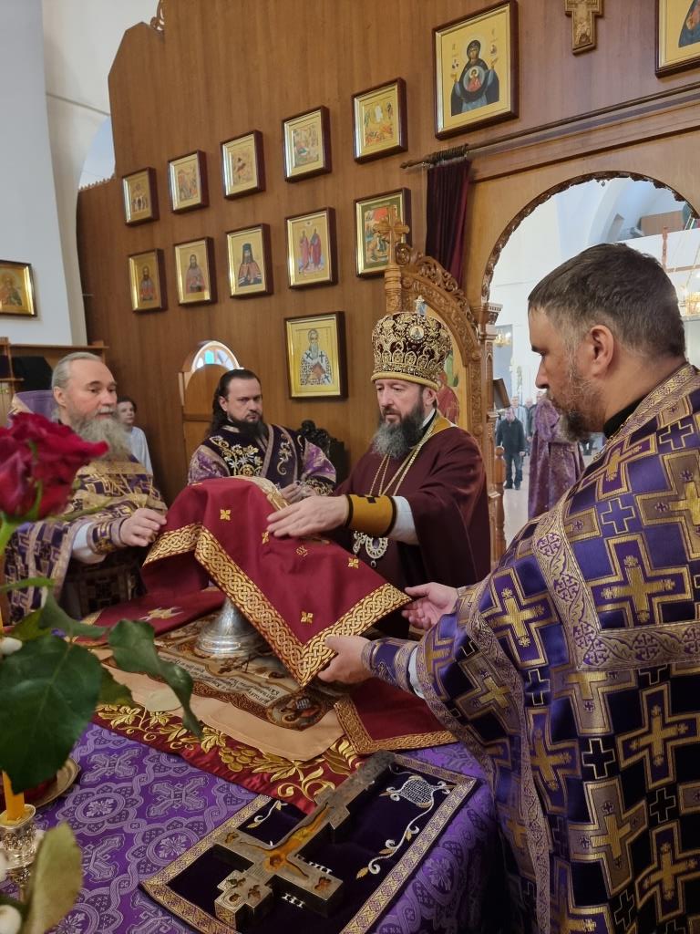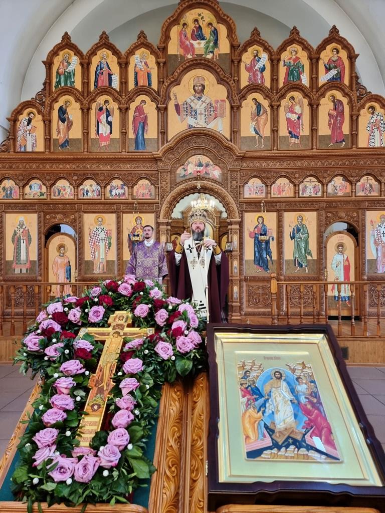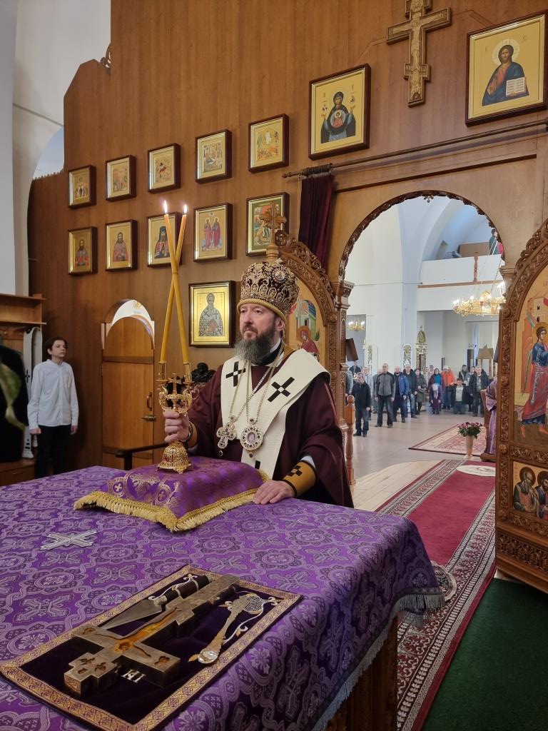 После окончания Божественной Литургии было совершено поклонение Честному Кресту Господню, затем Владыка архиепископ поздравил молящихся с праздником и обратился к народу Божию со словами поучения.