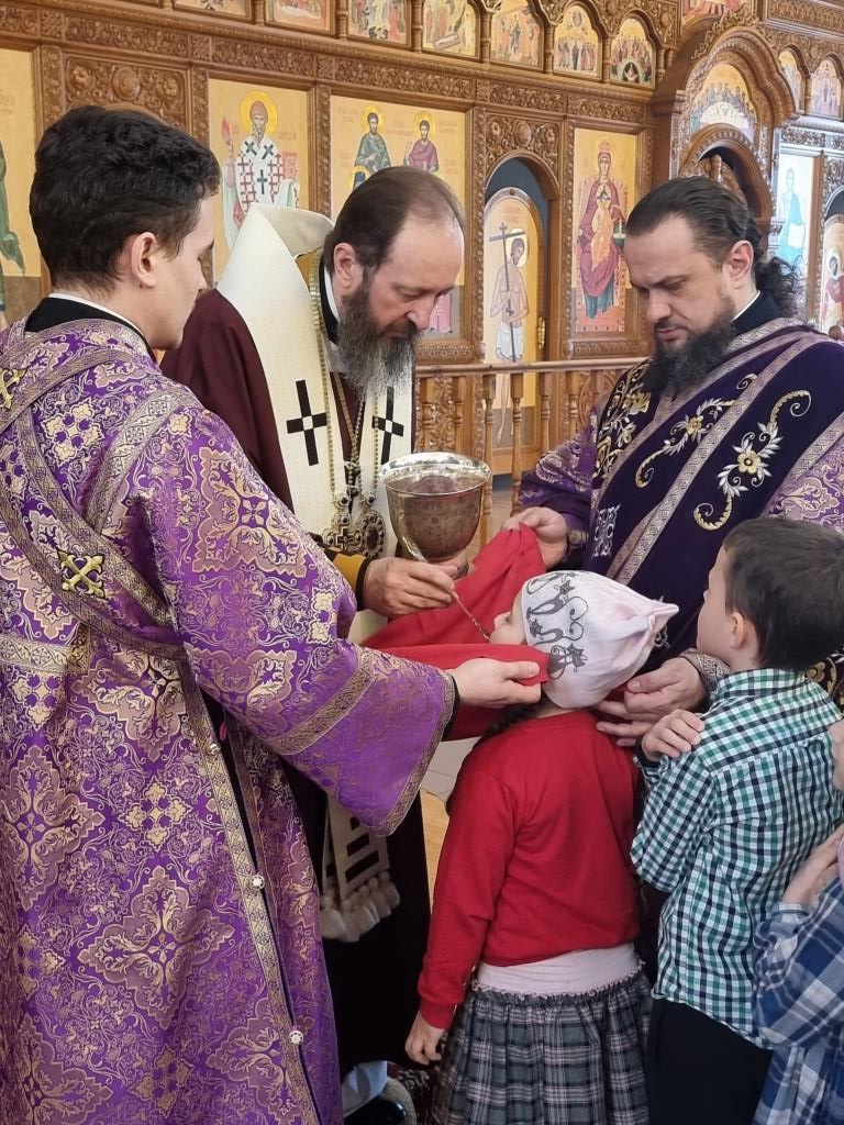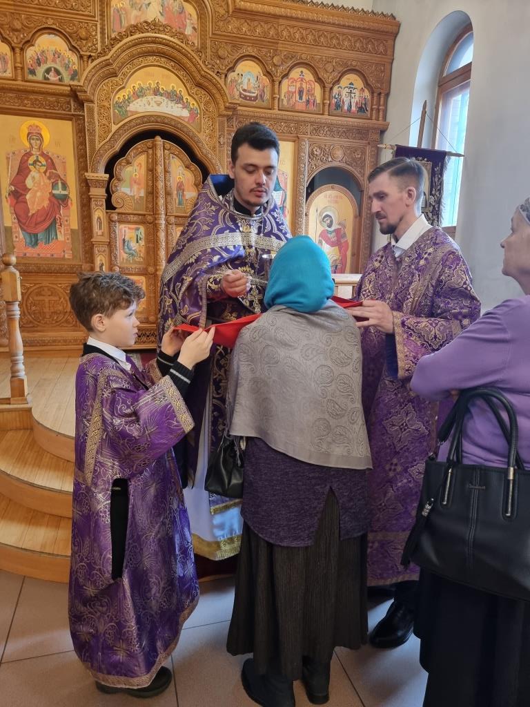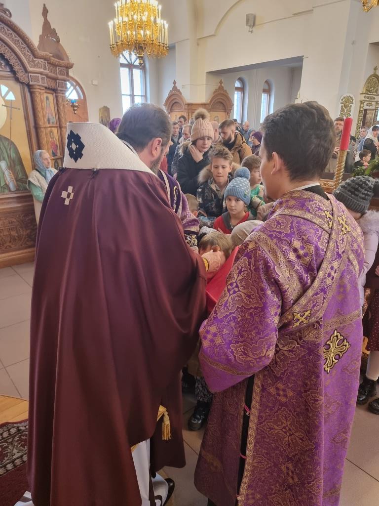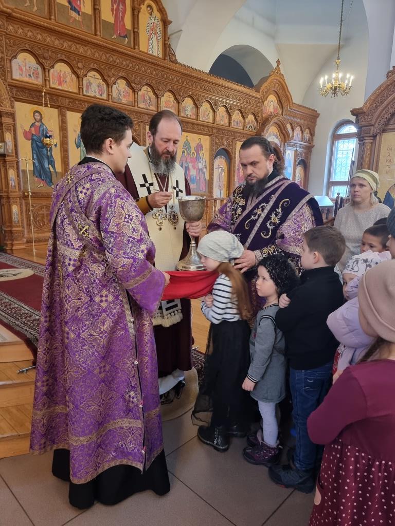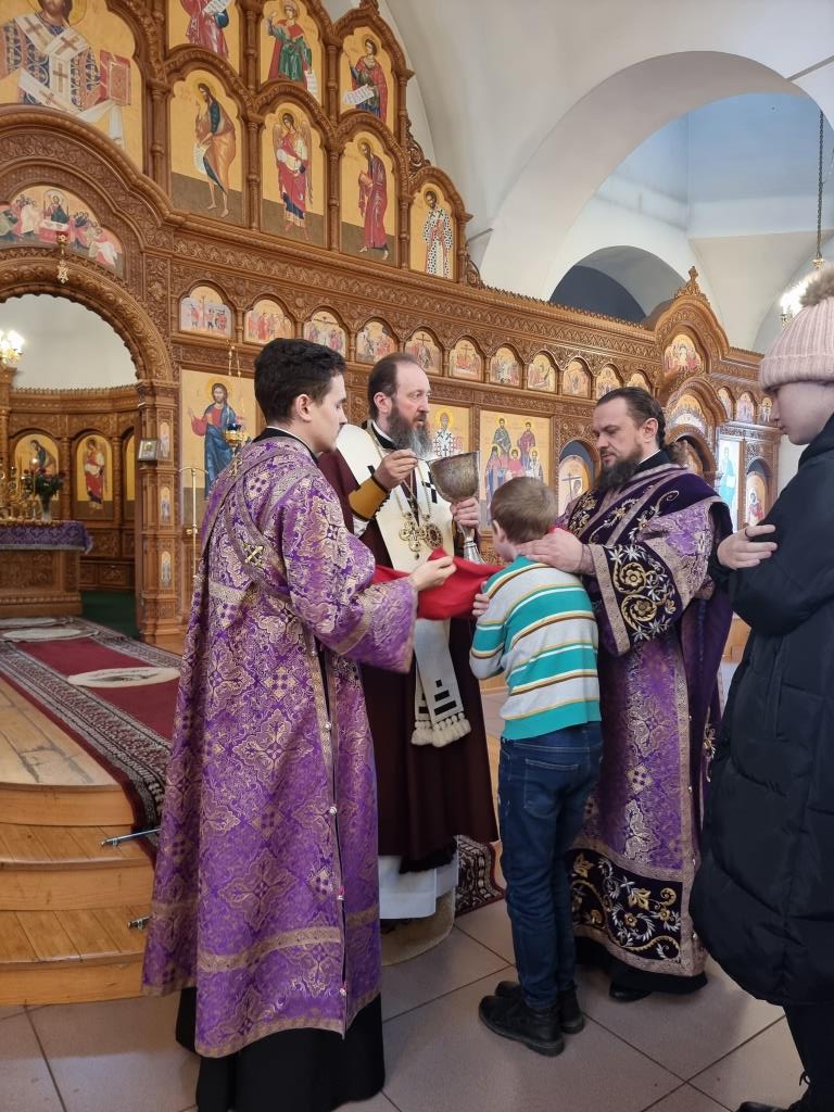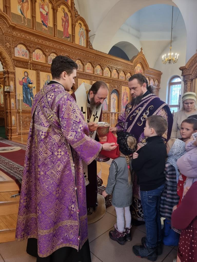 За богослужением молились: прихожане кафедрального собора, преподаватели и воспитанники Центральной воскресной школы, насельники Свято-Троицкого мужского монастыря города Усть-Каменогорска и сотрудники епархиального управления. Проповедь перед причастием мирян произнёс священник Константин Дьяков.