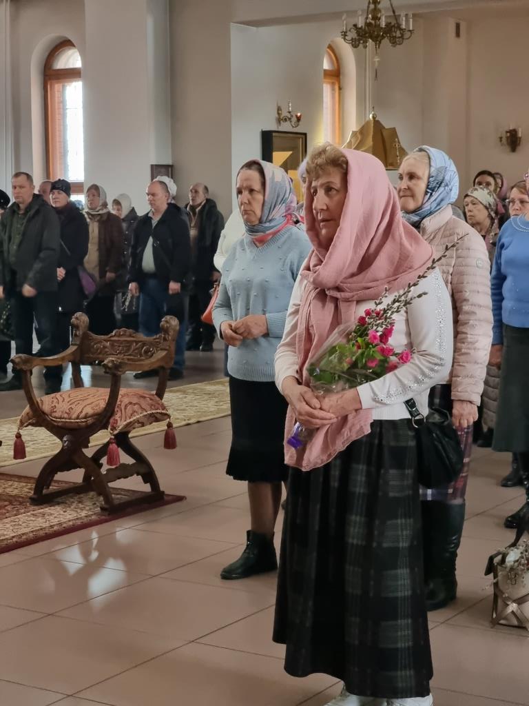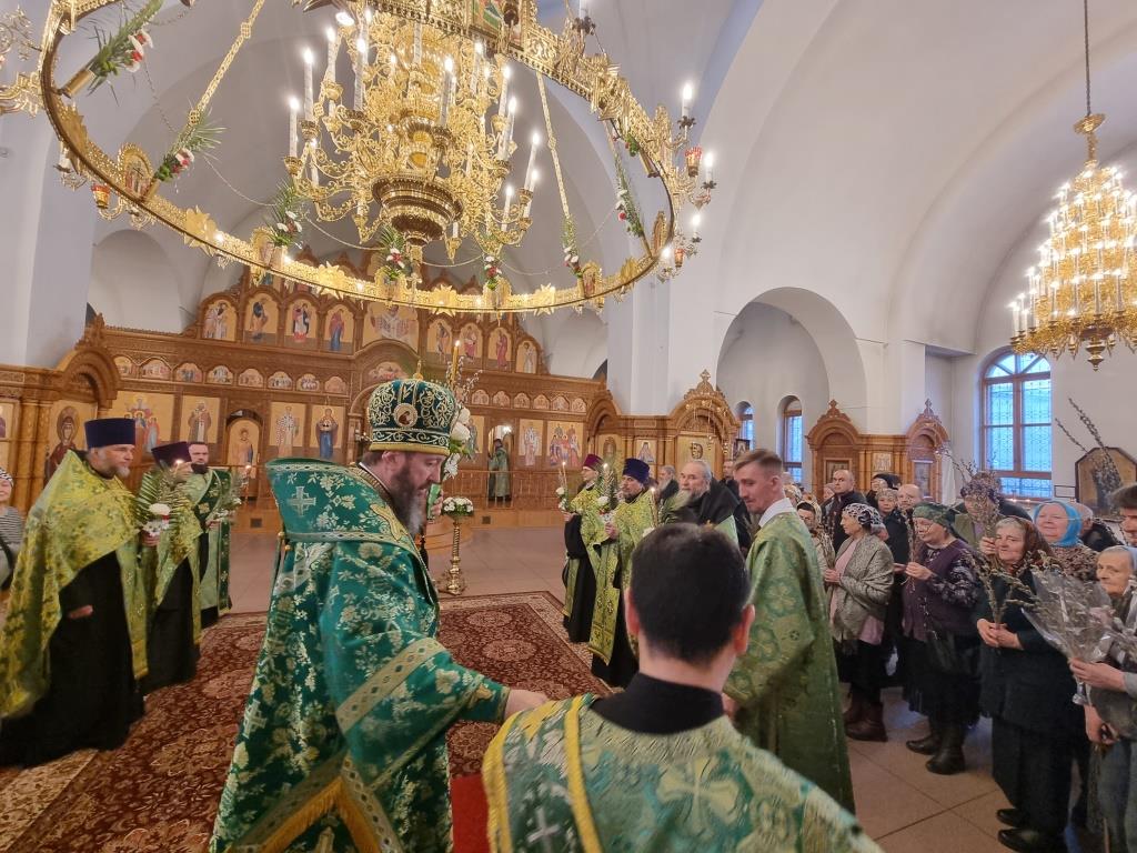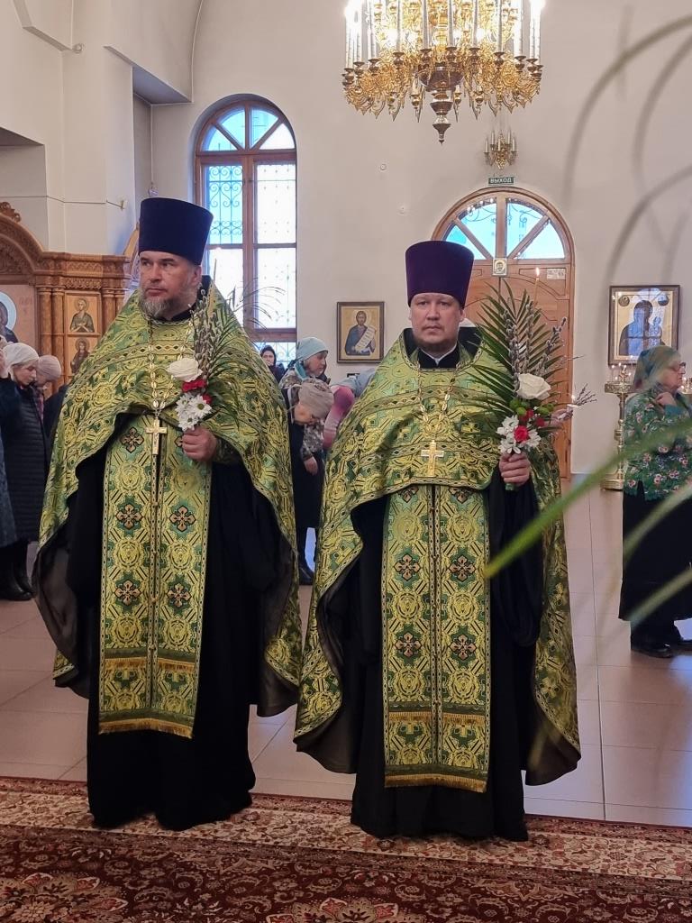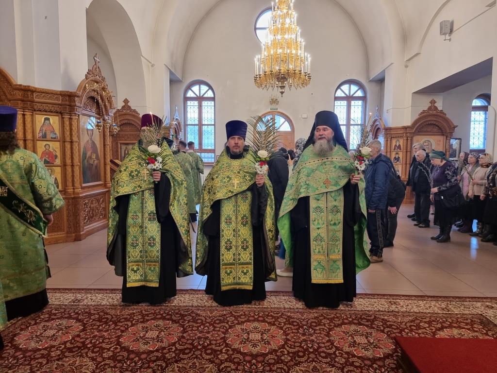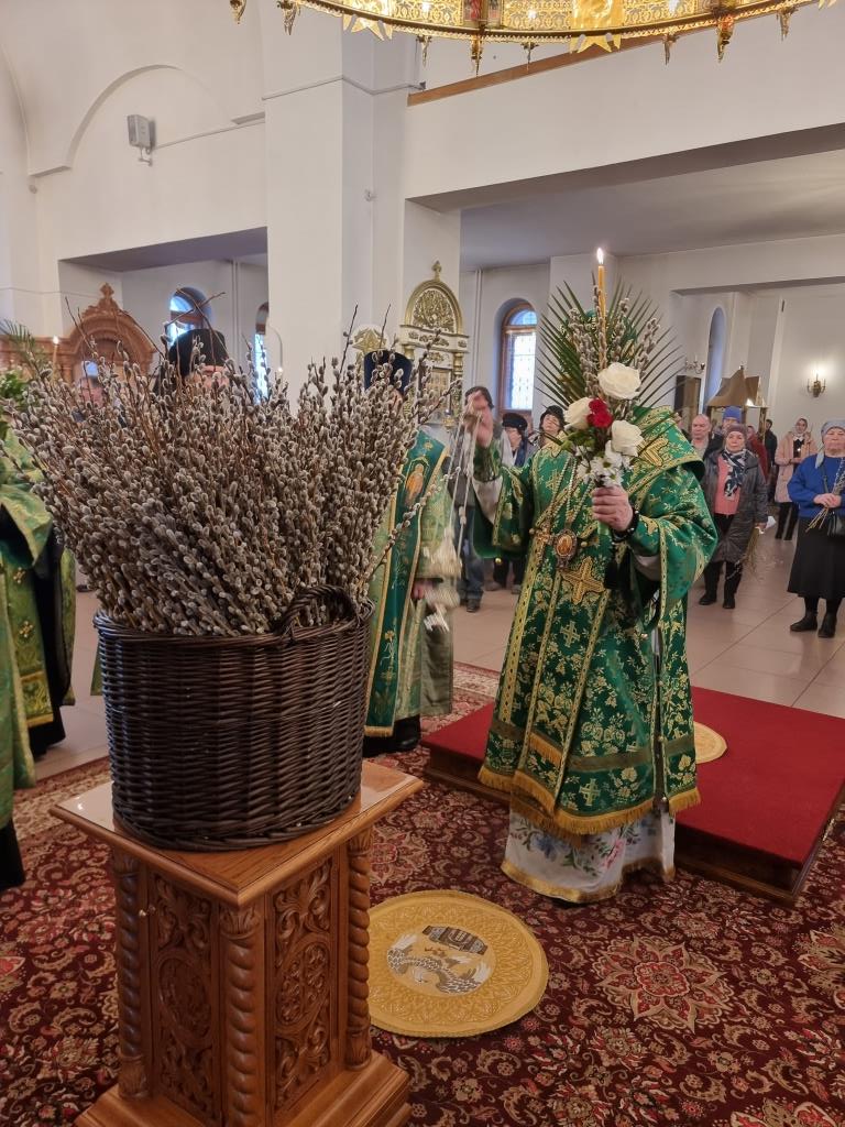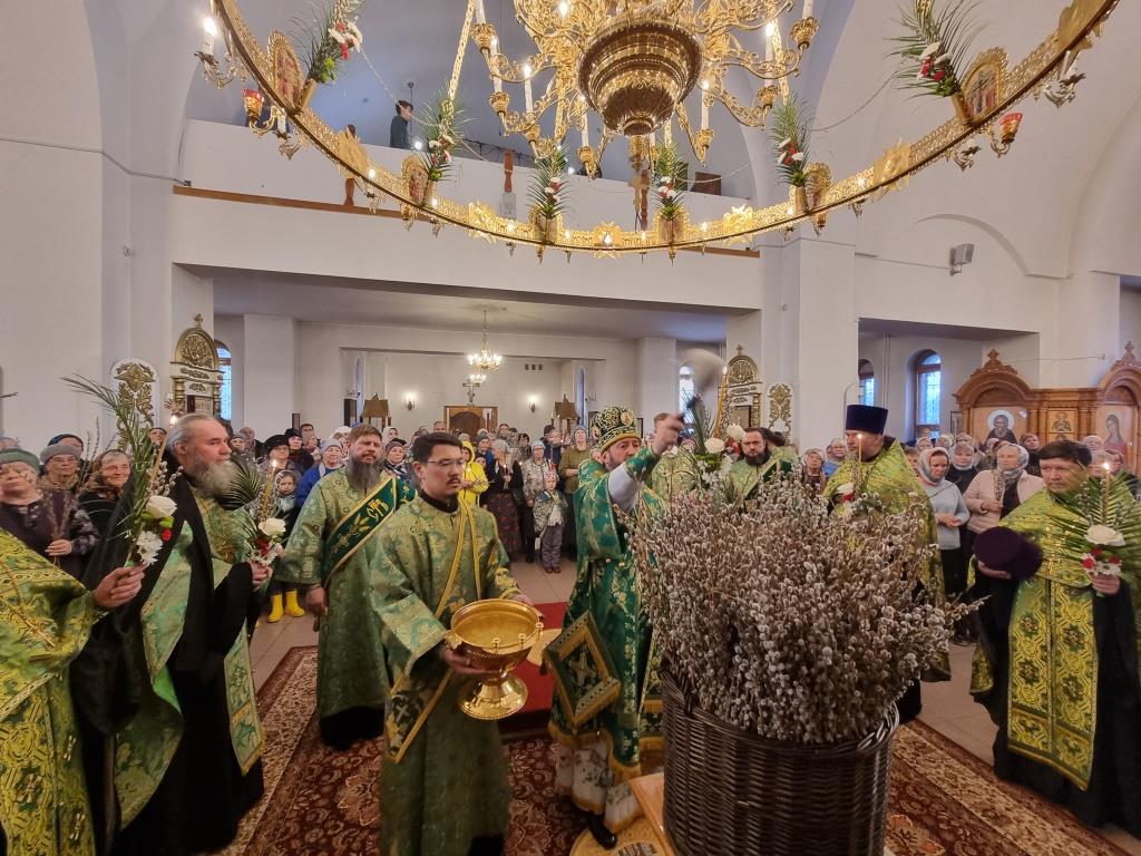 За богослужением пел хор кафедрального собора, регент Н. Романцова. На утрене, после чтения Евангельского зачала Владыка архиепископ совершил чин освящения ветвей верб и ваий. Затем Архипастырь помазал духовенство и прихожан освященным елеем.