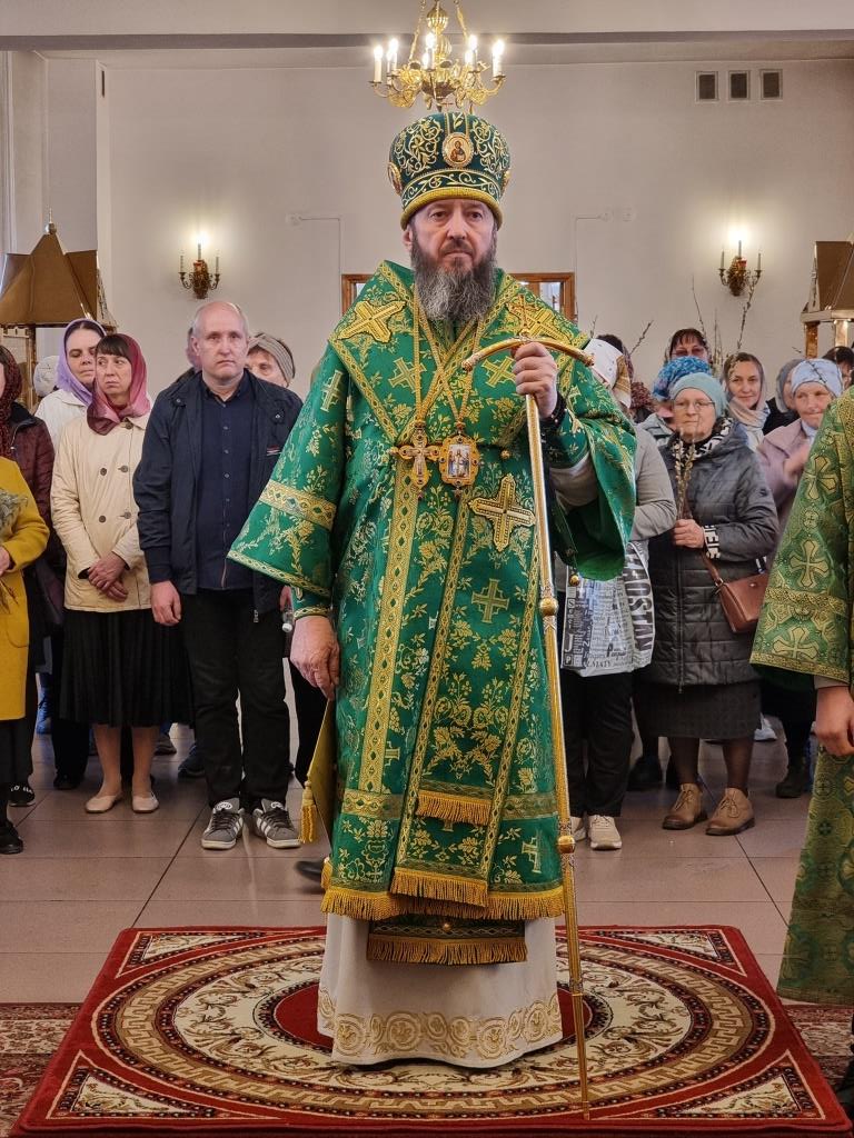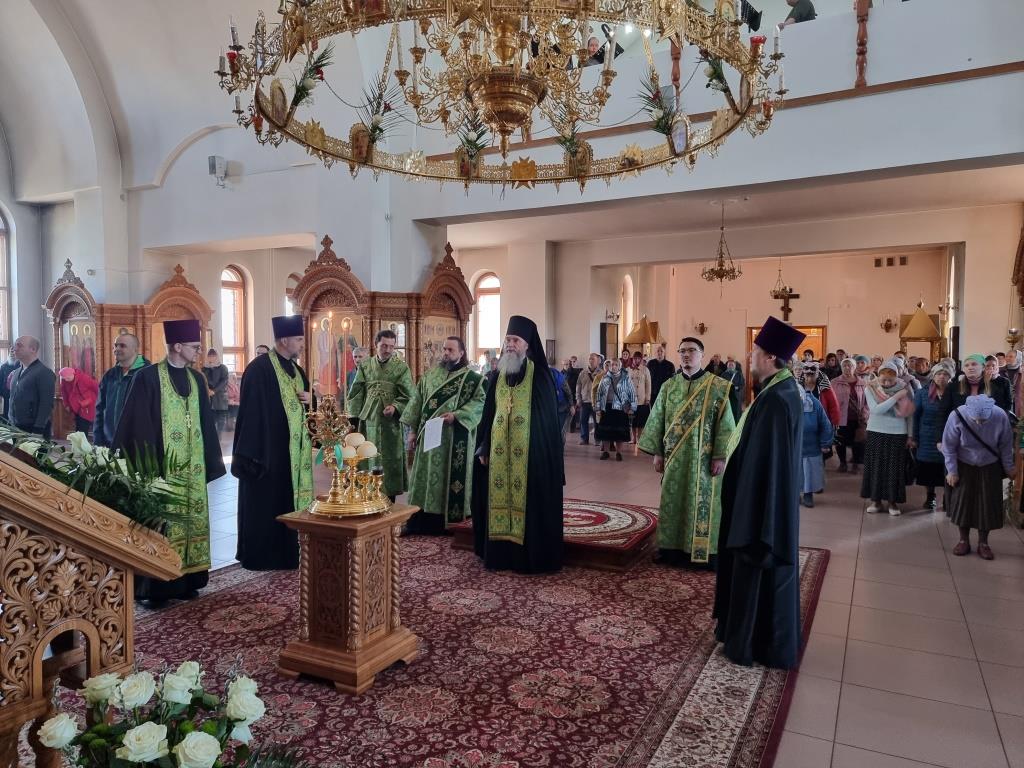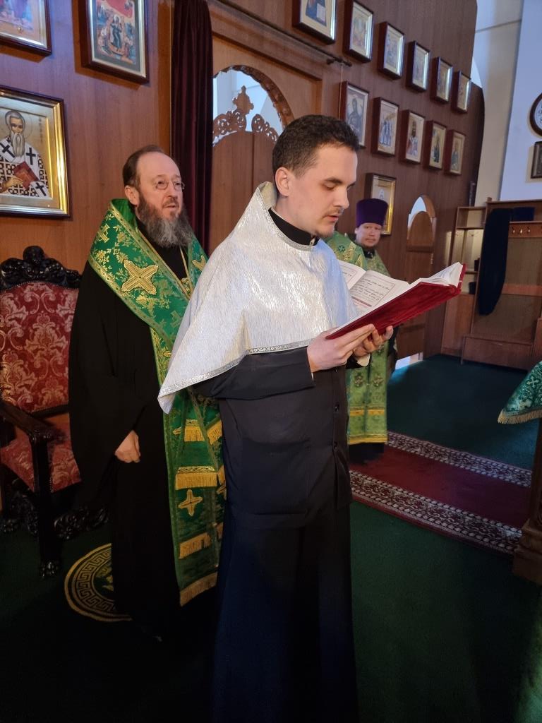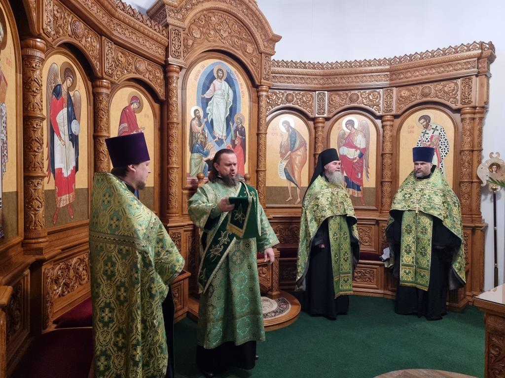 Его Высокопреосвященству сослужили: ключарь Андреевского собора иеромонах Никодим (Авдеев), клирики собора иерей Виталий Адаменков, иерей Роман Подрезов, иерей Константин Дьяков, секретарь епархии диакон Илия Кван, протодиакон Андрей Дудник. Хор под управлением регента Н. Романцовой исполнял богослужебные песнопения Всенощного бдения и праздника. За богослужением совершалась линия – сугубое моление с освящением хлеба, пшеницы, вина и елея. На вечерне архиепископ Амфилохий совершил хиротесию Кирилла Рамазанова во чтеца.
