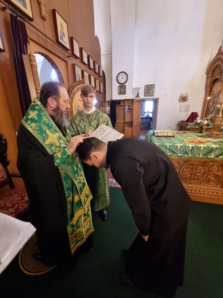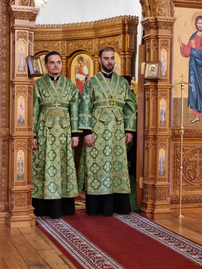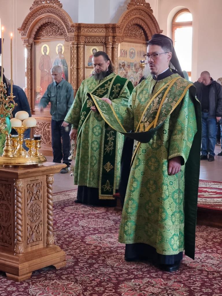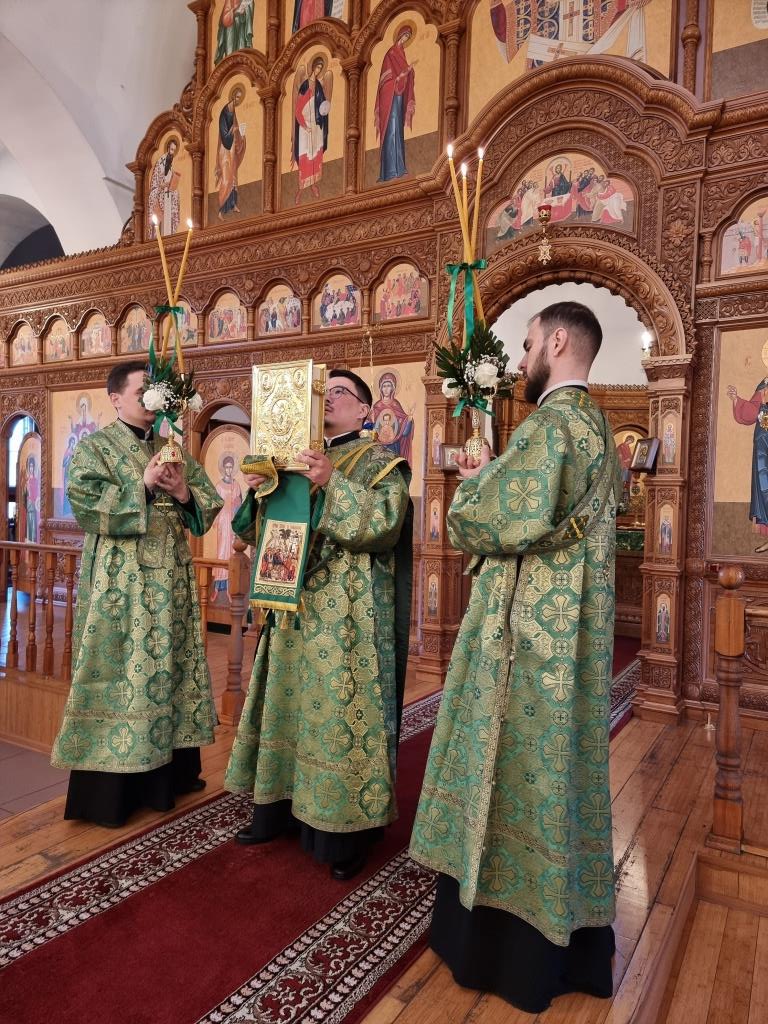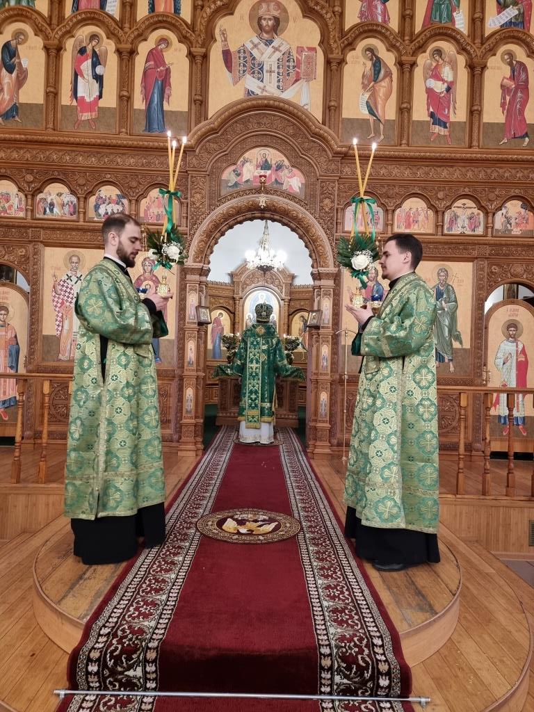 Его Высокопреосвященству сослужили: ключарь Андреевского собора иеромонах Никодим (Авдеев), клирики собора иерей Виталий Адаменков, иерей Роман Подрезов, иерей Константин Дьяков, секретарь епархии диакон Илия Кван, протодиакон Андрей Дудник. Хор под управлением регента Н. Романцовой исполнял богослужебные песнопения Всенощного бдения и праздника. За богослужением совершалась линия – сугубое моление с освящением хлеба, пшеницы, вина и елея. На вечерне архиепископ Амфилохий совершил хиротесию Кирилла Рамазанова во чтеца.