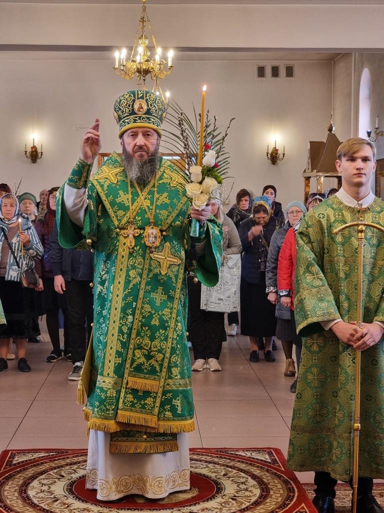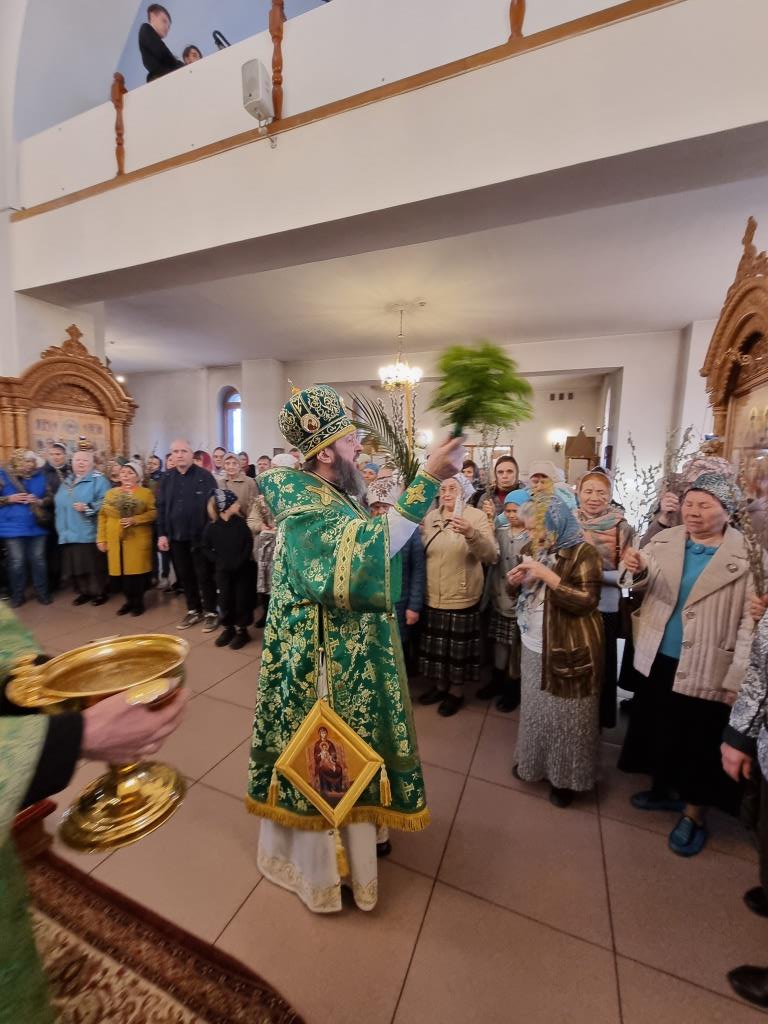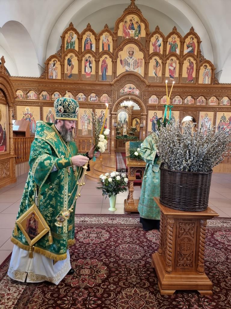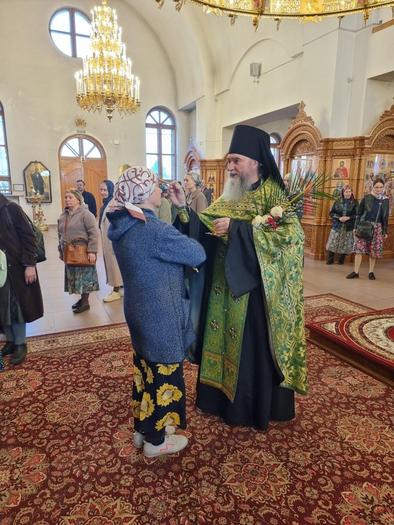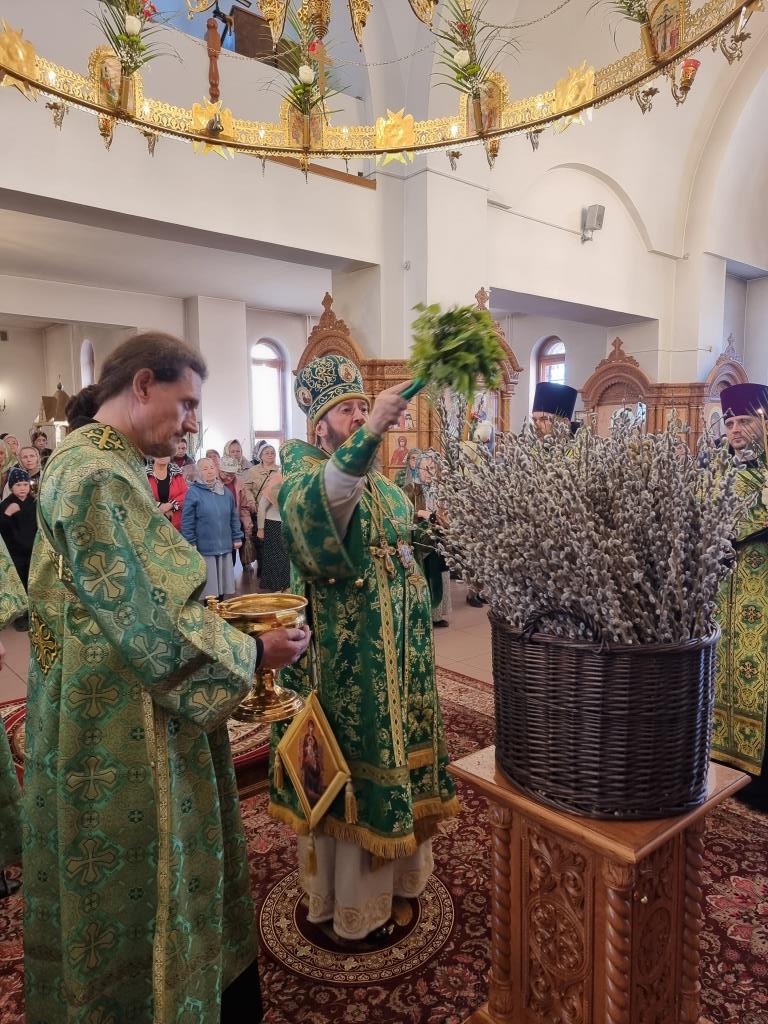 На полиелее читался отрывок из Евангелия от Матфея, повествующий о торжественном входе Господа Иисуса Христа в Иерусалим на осленке. После чтения Евангелия и 50-го псалма Владыка архиепископ вознес особую молитву и окропил ветви верб святой водой, после чего помазал клир и паству освященным елеем.