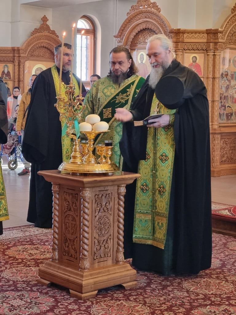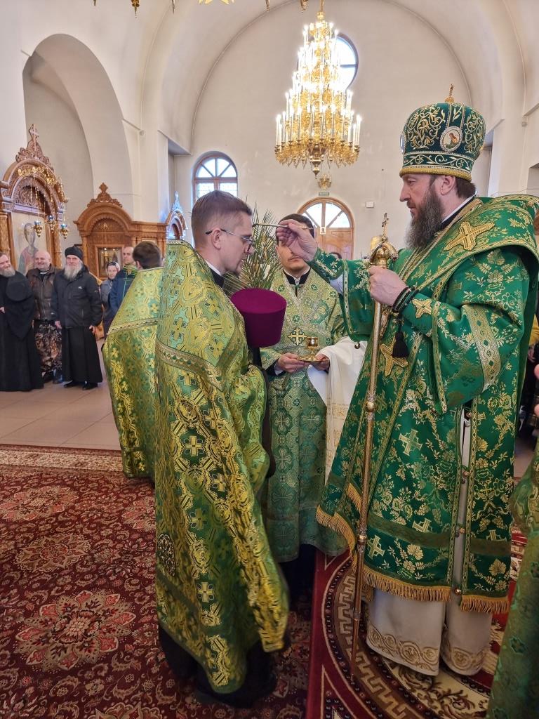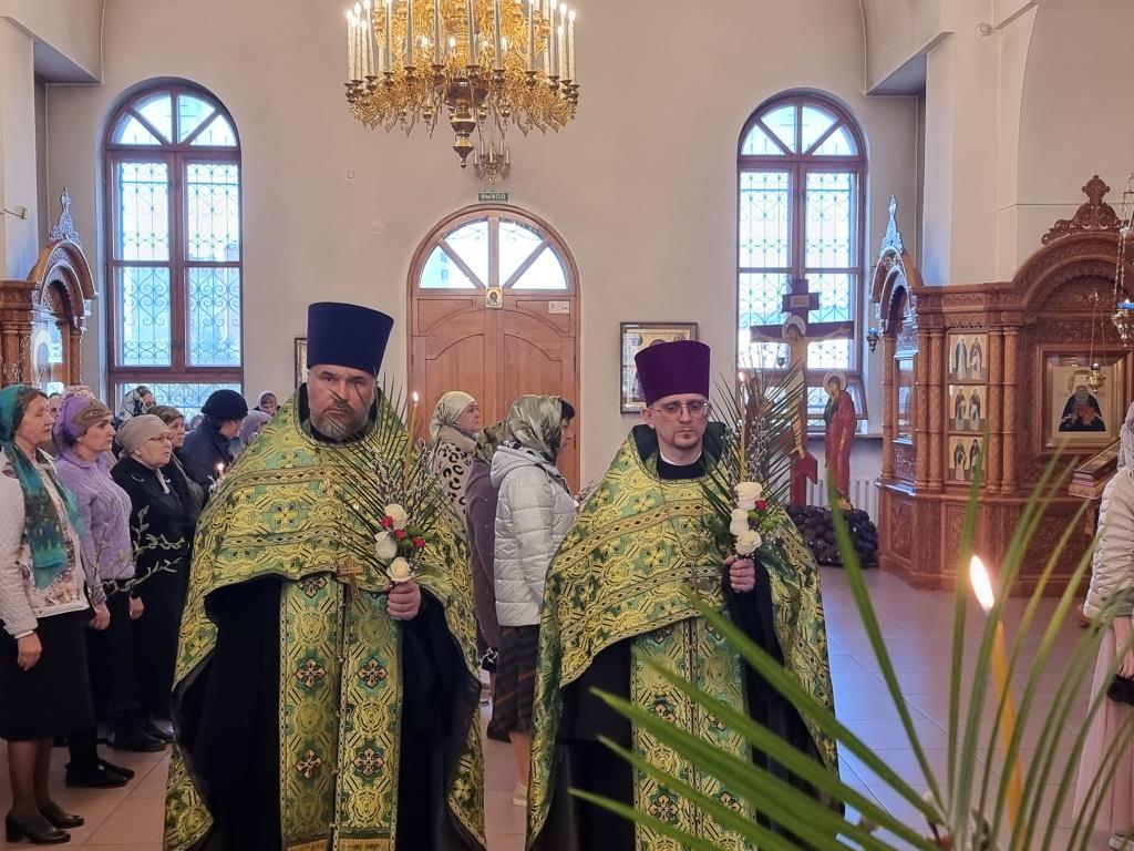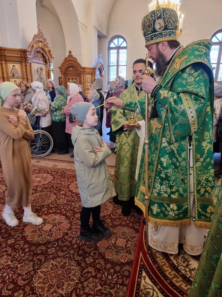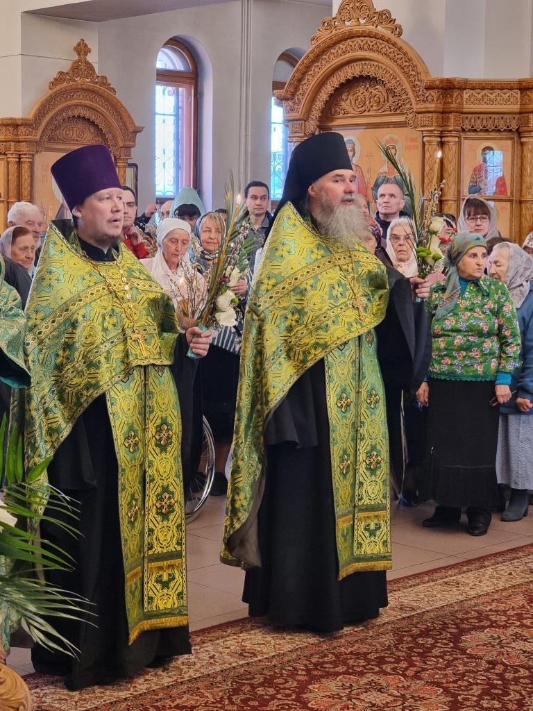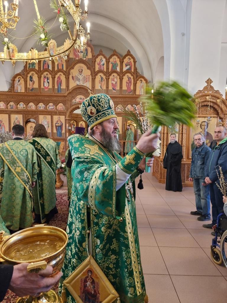 На полиелее читался отрывок из Евангелия от Матфея, повествующий о торжественном входе Господа Иисуса Христа в Иерусалим на осленке. После чтения Евангелия и 50-го псалма Владыка архиепископ вознес особую молитву и окропил ветви верб святой водой, после чего помазал клир и паству освященным елеем.