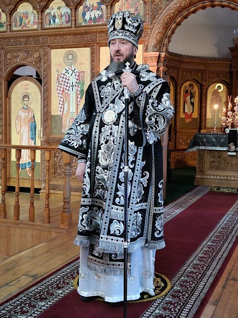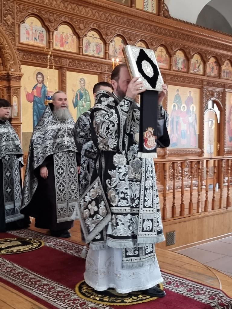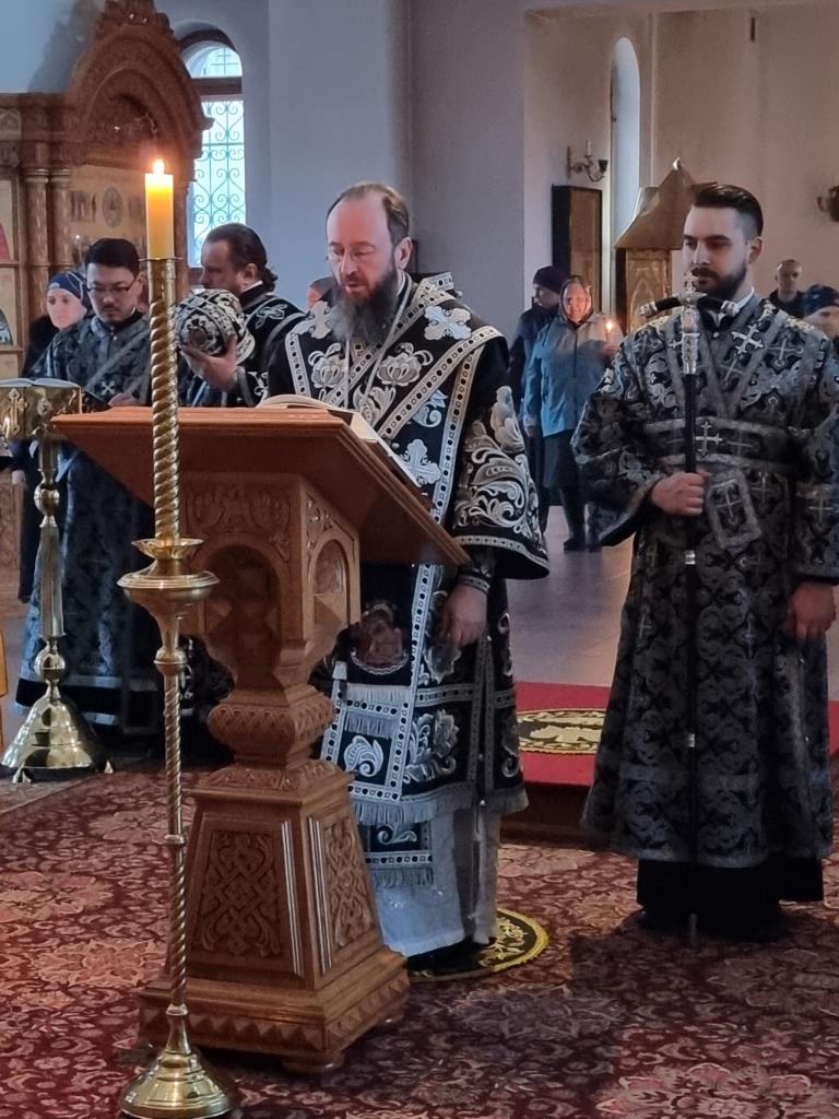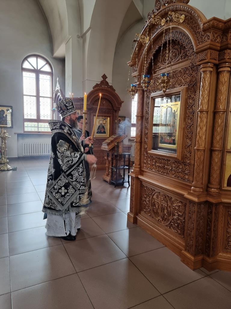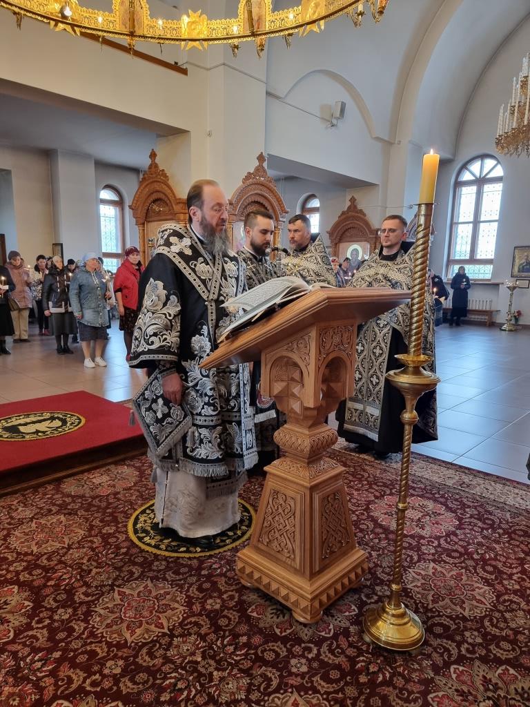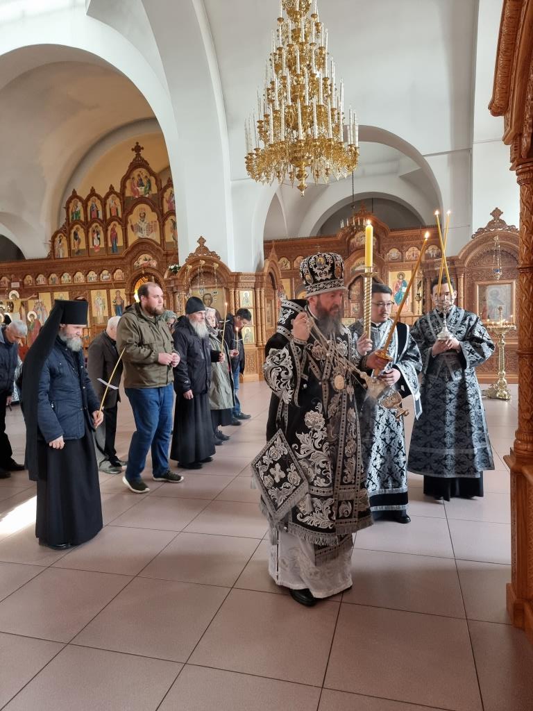 Архипастырю сослужили: ключарь кафедрального собора иеромонах Никодим (Авдеев), клирики собора иерей Виталий Адаменков, иерей Роман Подрезов, иерей Константин Дьяков, секретарь епархии диакон Илия Кван, протодиакон Андрей Дудник.