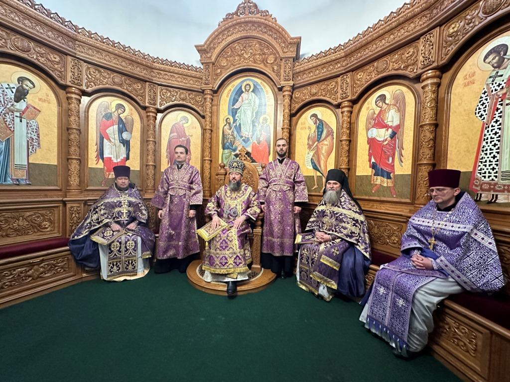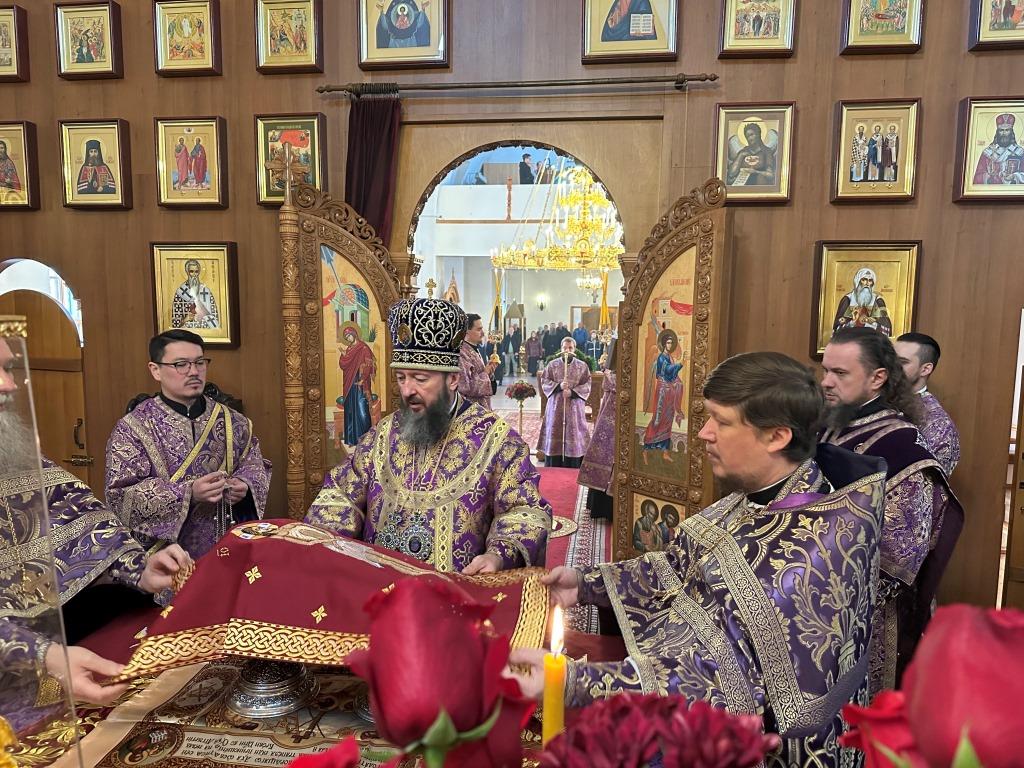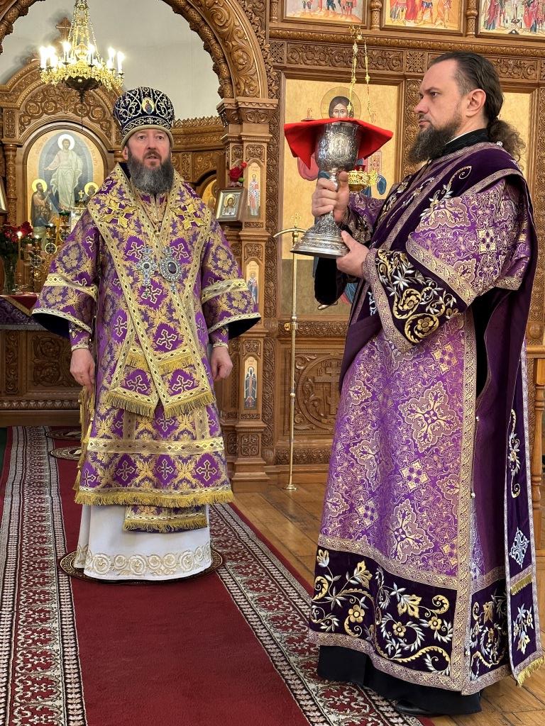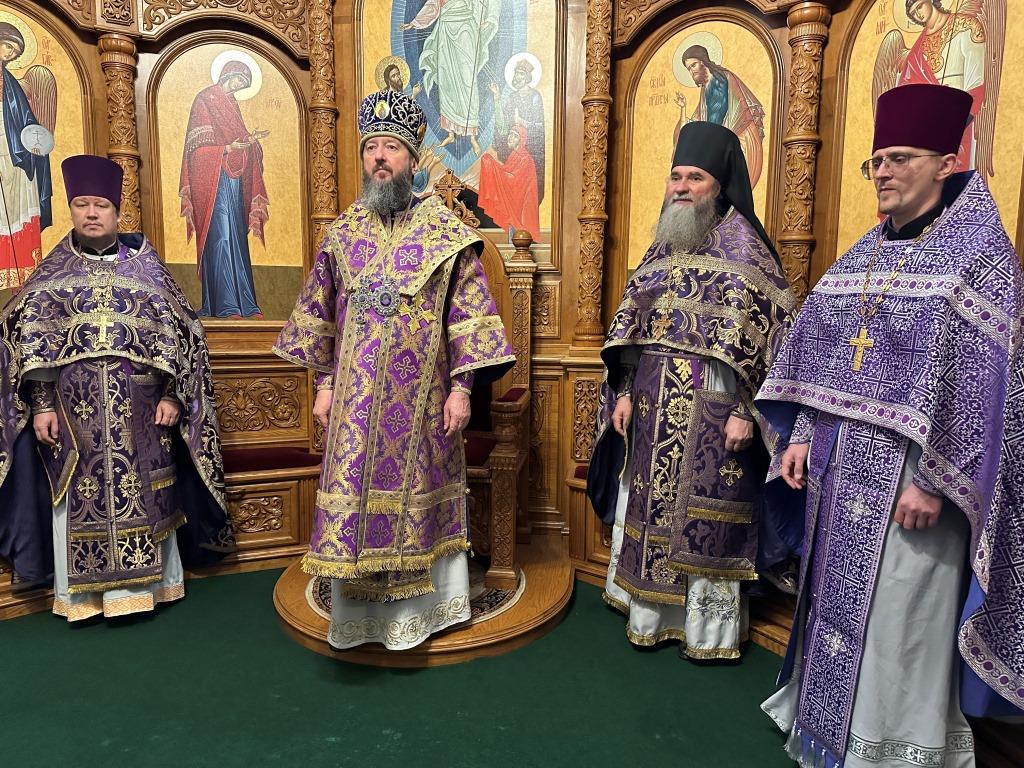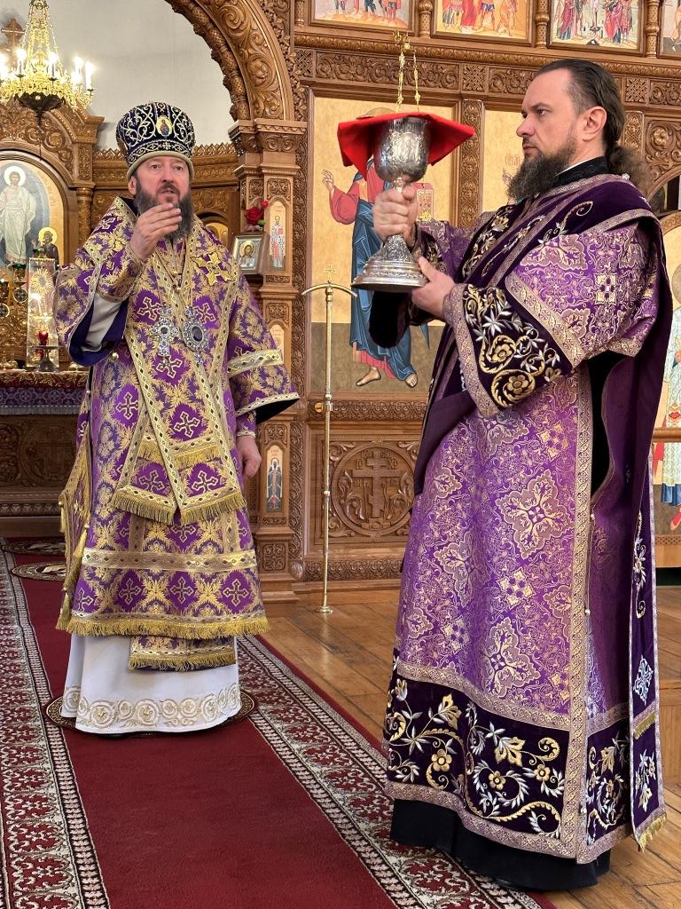 Его Высокопреосвященству сослужили: ключарь кафедрального собора иеромонах Никодим (Авдеев), клирики собора иерей Роман Подрезов и иерей Константин Дьяков, протодиакон Андрей Дудник, секретарь епархии диакон Илия Кван.