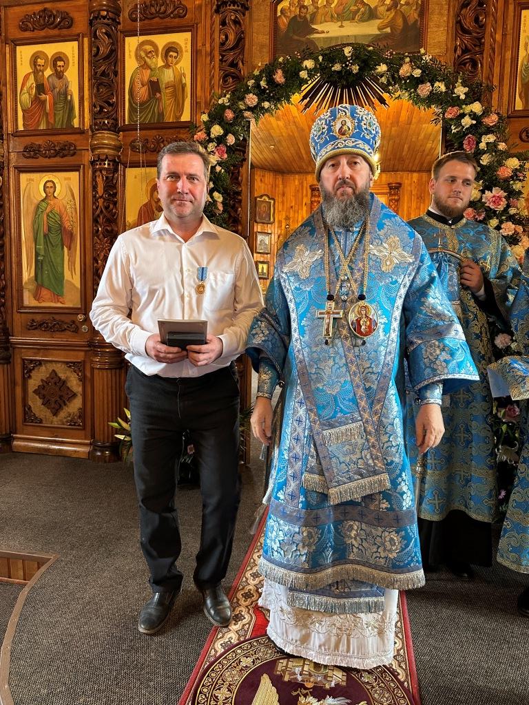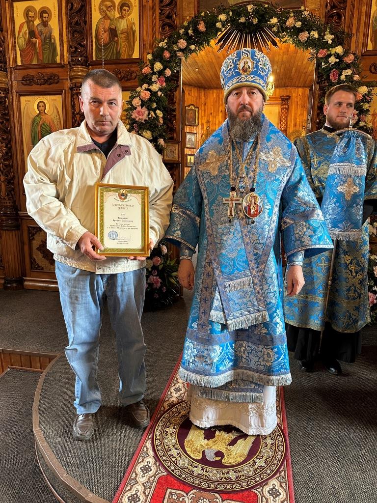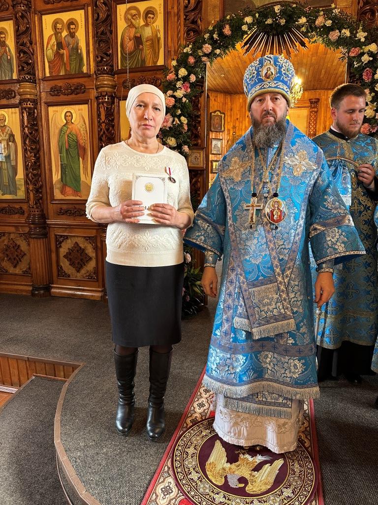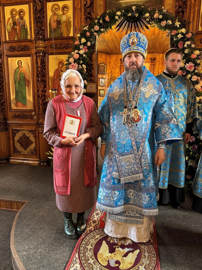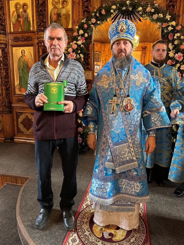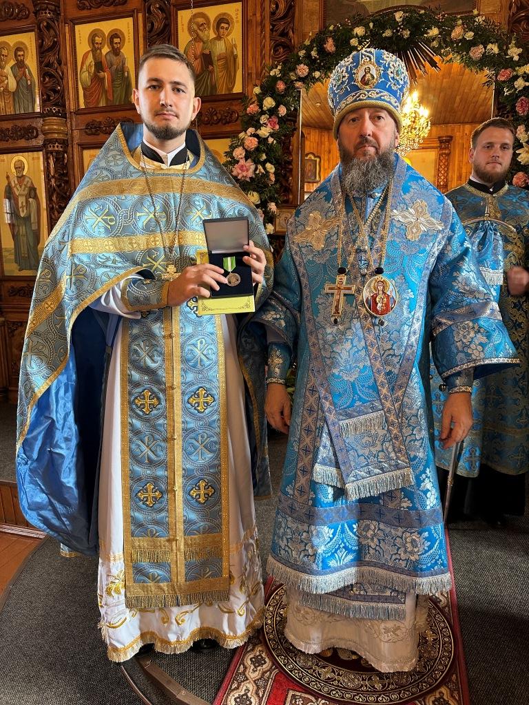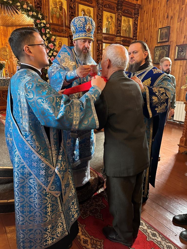В ответном слове настоятель Покровского собора иеромонах Силуан (Магилев) поблагодарил Владыку Амфилохия за радость совместной молитвы и участия в Евхаристии. Затем состоялось награждение благодетелей и сотрудников Покровского собора знаками отличия Православной Церкви Казахстана и Архиерейскими грамотами. В этот праздничный день свято-Покровскому храму была передана в дар икона Равноапостольного князя Владимира, которая раннее находилась в разрушенном дореволюционном Покровском соборе города Усть- Каменогорска.