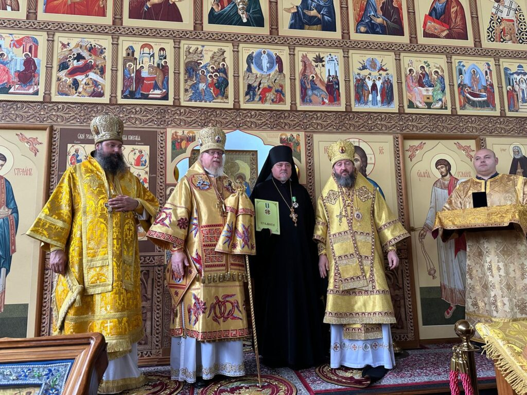 В завершение Литургии управляющий епархией поздравил настоятеля храма с 55-летием и подарил ему наперсный крест с украшениями ручной работы. Архиепископ Тихон также вручил Патриарший орден Материнства (II степени) Галине Михайловне Порхачевой.