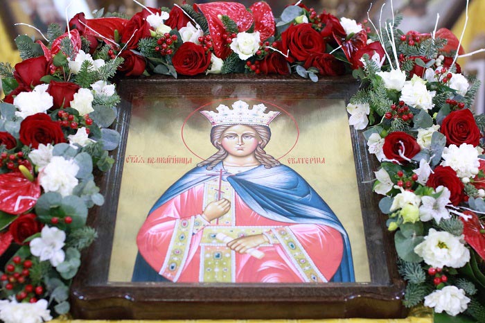 Святая Екатерина родилась в столице Египта – городе Александрии во второй половине III столетия. Происходила она из знатного рода и отличалась светлым умом, ученостью и красотой. Многие богатые и знатные женихи искали ее руки, а мать и родные уговаривали ее согласиться на брак. Но Екатерина медлила с ответом и говорила своим близким: «Если хотите, чтобы я вышла замуж, то найдите мне юношу, подобного мне по красоте и учености». Бог так устроил, что Екатерина познакомилась с одним старцем-пустынником, человеком большой мудрости и праведной жизни. Обсуждая с Екатериной достоинства ее поклонников, старец сказал: «Я знаю Жениха, который во всем превосходит тебя. Нет Ему подобного». Потом он дал ей икону Пресвятой Богородицы, и пообещал, что Она поможет ей увидеть необыкновенного Жениха. В ближайшую ночь представилось Екатерине в легком сне, что Небесная Царица, окруженная ангелами, стоит перед ней и держит на руках Отрока, сияющего как солнце. Напрасно старалась Екатерина взглянуть на Его лицо: Он отворачивался от нее. «Не презирай Твоего создания, — молила Божия Матерь своего Сына, — скажи ей, что она должна сделать, чтобы увидеть Твой светлый лик». «Пусть она вернется к старцу и узнает от него», — ответил Отрок. Чудный сон глубоко поразил девушку. Как только настало утро, она поспешила к старцу, припала к ногам его и просила у него совета. Старец подробно объяснил ей истинную веру, рассказал о райском блаженстве праведников и о гибели грешников. Мудрая дева поняла превосходство христианской веры над языческой, поверила в Иисуса Христа как Сына Божия и приняла святое Крещение. После Крещения божественный свет проник в ее душу и наполнил ее великой радостью. Когда Екатерина с обновленной душой возвратилась домой, она долго молилась, благодаря Бога за милость, оказанную ей. Заснув во время молитвы, она снова увидела Матерь Божию. Теперь Божественный Отрок милостиво взирал на нее. Пресвятая Дева взяла правую руку девицы, а Отрок надел ей чудный перстень, сказав: «Не знай жениха земного». Екатерина поняла, что с этого момента она обручена Христу и проснулась с еще большей радостью на сердце. После этого она совершенно переменилась – стала скромной, кроткой и милостивой. Она стала часто молиться Богу, прося руководства и помощи. Одна цель воодушевляла ее: жить для Христа. В скором времени в Александрию прибыл Максимиан, соправитель императора Диоклетиана. Он разослал вестников по городам Египта созвать народ на праздник в честь языческих богов. Екатерина скорбела, что царь, вместо того, чтобы содействовать просвещению народа, еще больше насаждает языческие суеверия. Когда наступил праздник, она пришла в капище, где собирались жрецы, знать и народ и безбоязненно сказала правителю: «Не стыдно ли тебе, царь, молиться мерзким идолам! Познай истинного Бога, безначального и бесконечного; им цари царствуют и мир стоит. Он сошел на землю и сделался человеком для спасения нашего».