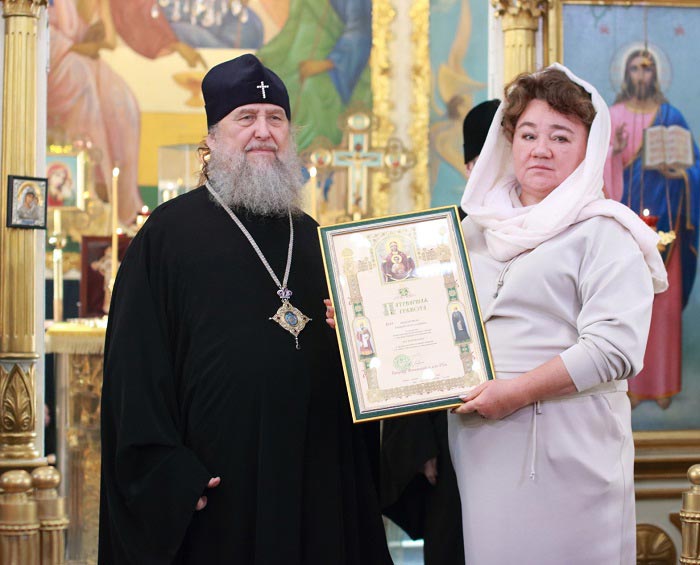Во исполнение благословения Предстоятеля Русской Православной Церкви владыка митрополит вручил – Патриаршие награды – мирянам, совершающим служение в старейшем храме столицы Республики. Во внимание к трудам на благо Святой Церкви знаками внимания были отмечены: