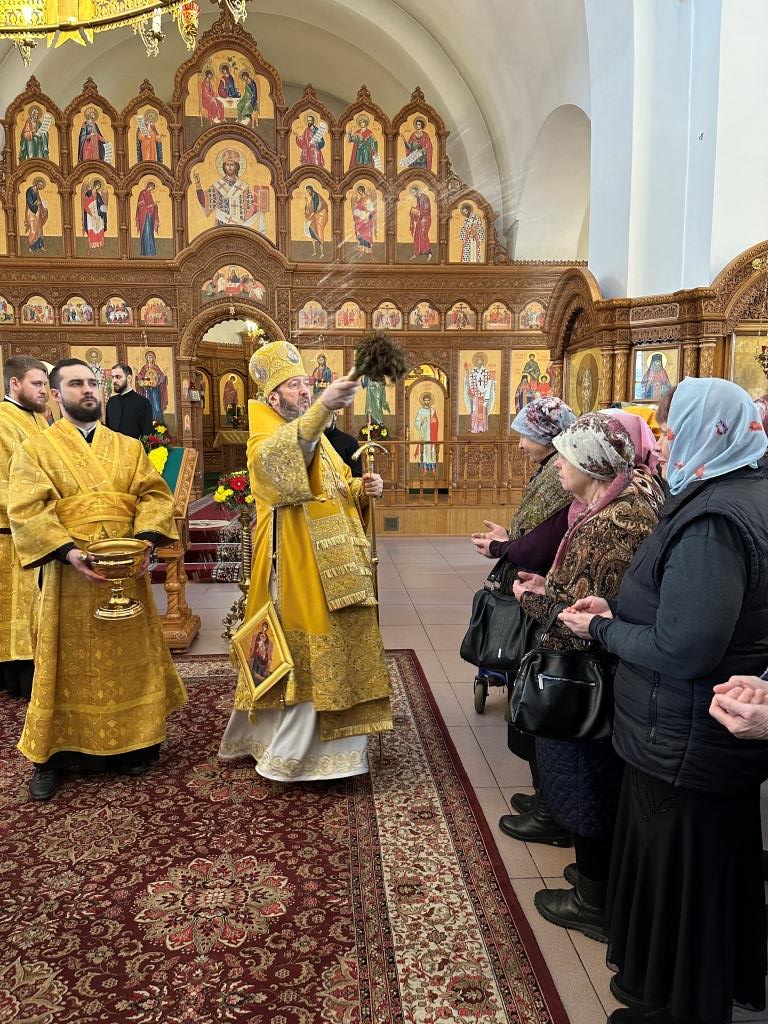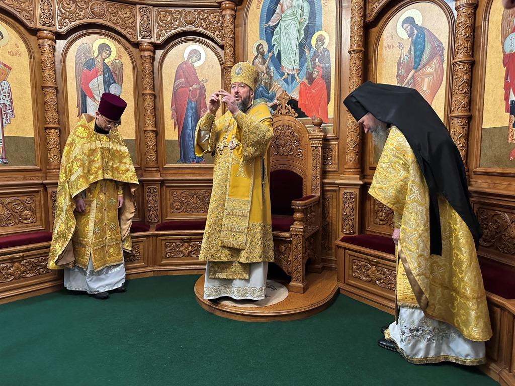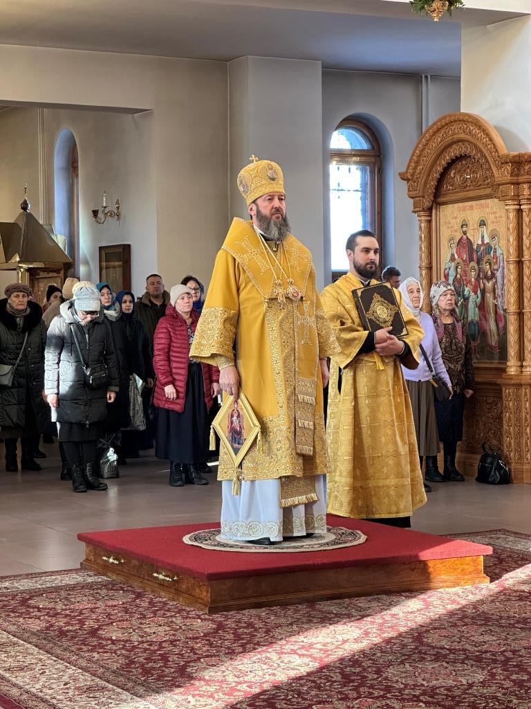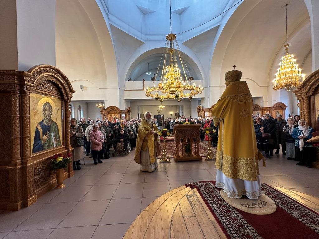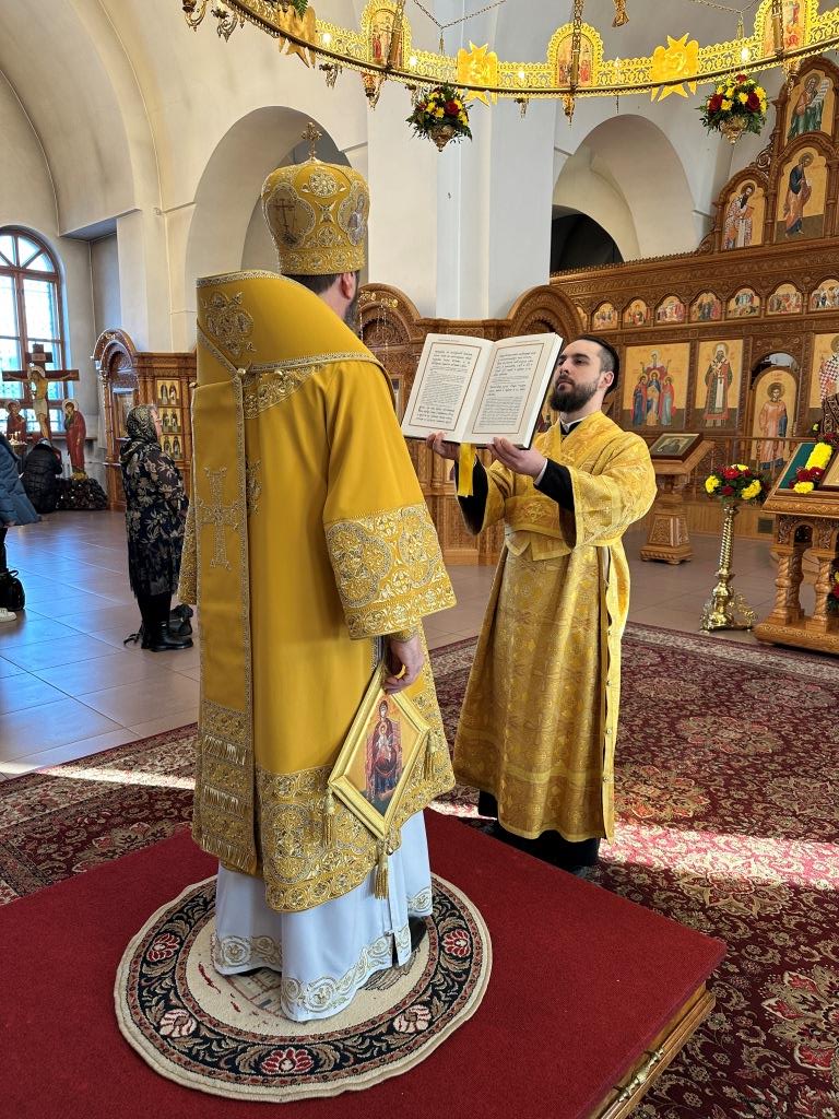 Его Высокопреосвященству сослужили: ключарь кафедрального собора иеромонах Никодим (Авдеев), клирик собора иерей Константин Дьяков, протодиакон Андрей Дудник, секретарь епархии диакон Илия Кван.