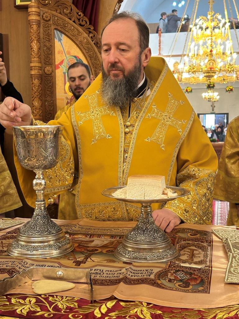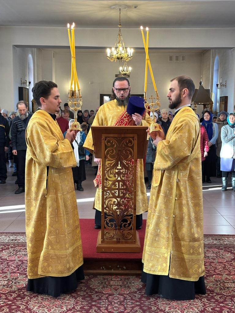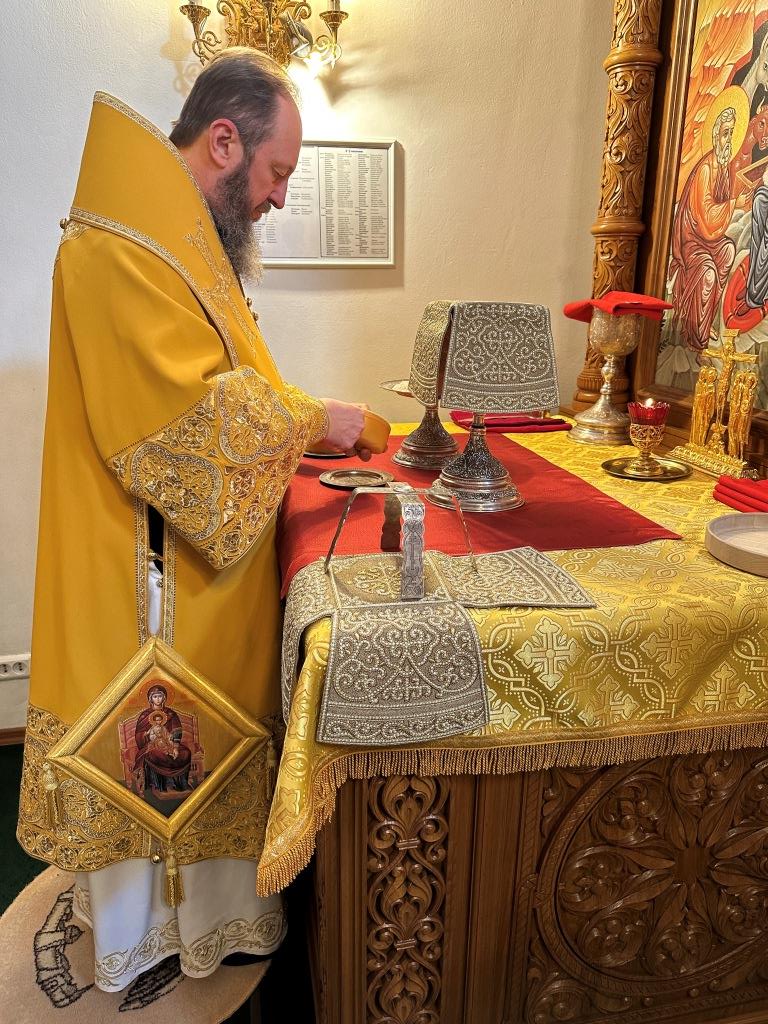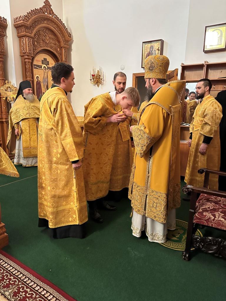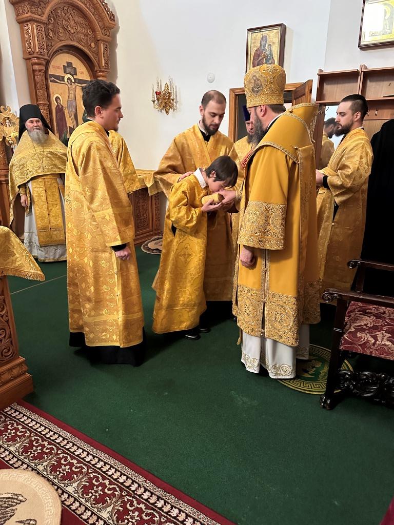 Его Высокопреосвященству сослужили: ключарь кафедрального собора иеромонах Никодим (Авдеев), клирик собора иерей Константин Дьяков, протодиакон Андрей Дудник, секретарь епархии диакон Илия Кван.