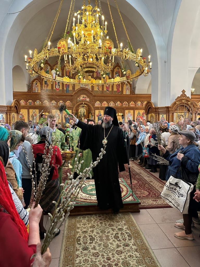 После заамвонной молитвы было совершено славление Господу Иисусу Христу, затем архиепископ Амфилохий окропил ветви верб святой водой и обратился к духовенству и молящимся со словами проповеди.