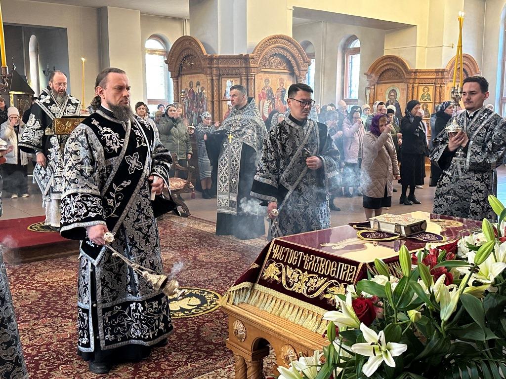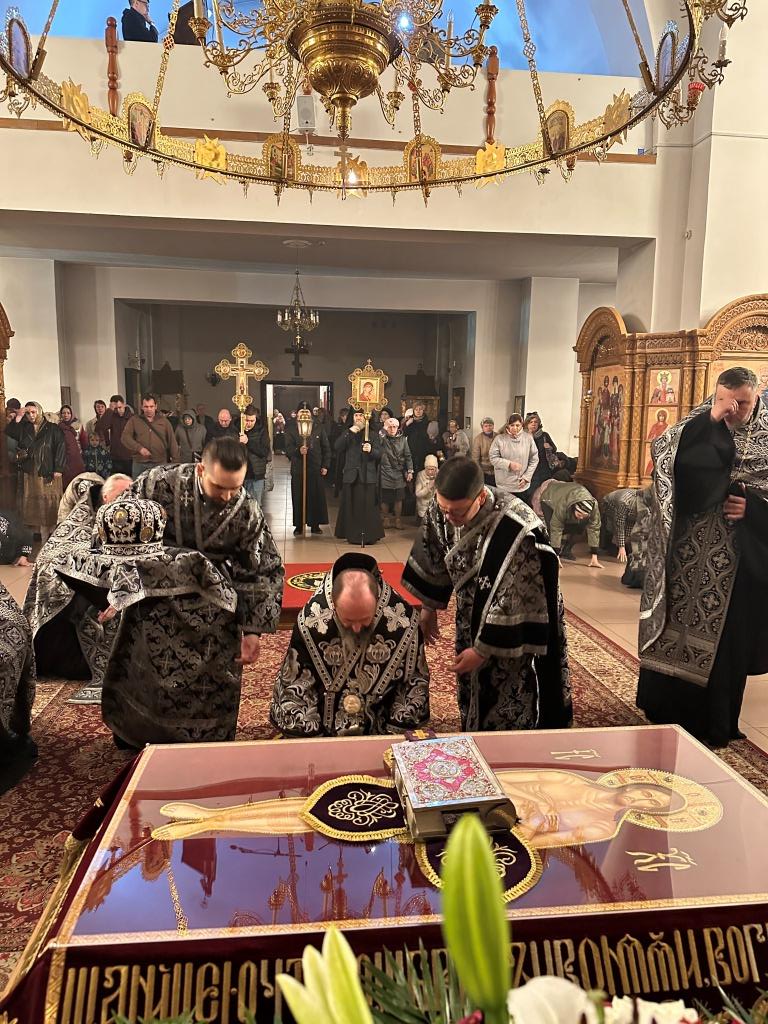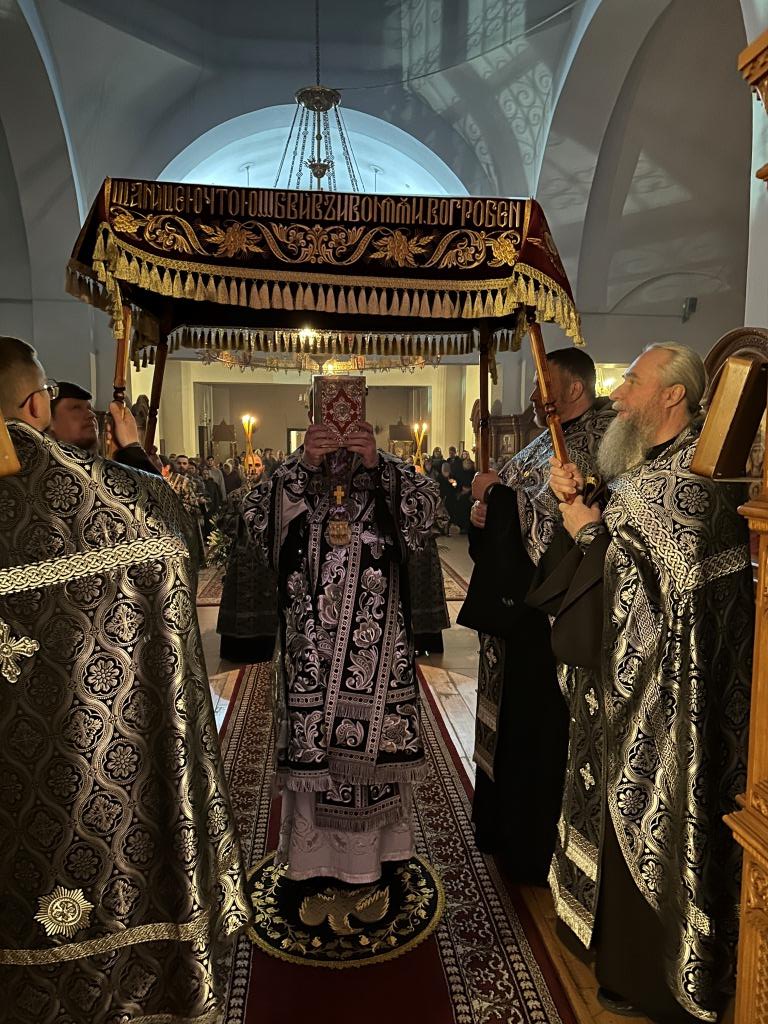 По завершении крестного хода перед Плащаницей были прочитаны пророчество о воскресении из книги пророка Иезекииля (Иез. 37:1-14), чтение из Апостола об искупительной Жертве, принесенной Христом (1 Кор. 6:7-8), после чего архиепископ Амфилохий прочитал евангельское зачало о запечатании гроба Господня и приставлении к нему стражи (Мф. 27:62-66). После богослужения Владыка архиепископ обратился к верующим со словами проповеди.