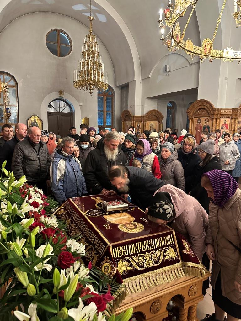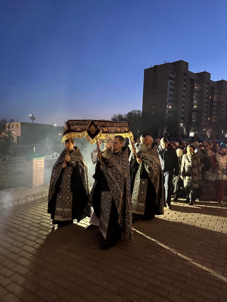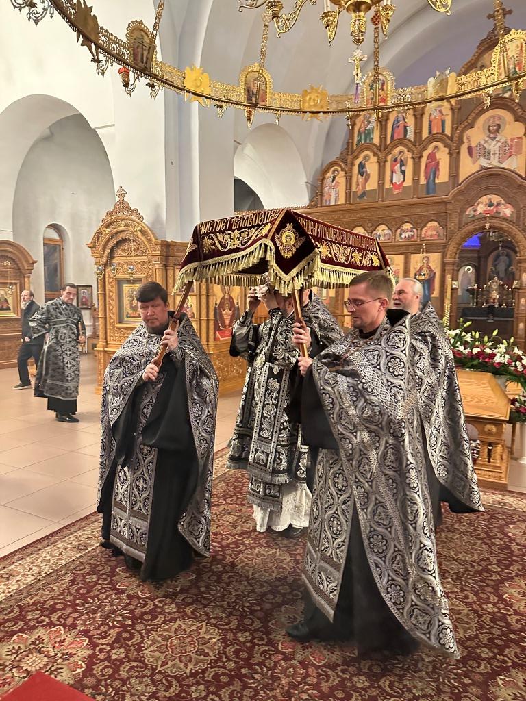 После пения тропарей на «Бог Господь» архиепископ Амфилохий прочитал перед Плащаницей Спасителя стихи 17-й кафизмы, перемежающиеся стихирами о погребении Господа Иисуса Христа. По окончании великого славословия с пением погребального песнопения «Святый Боже» Плащаница была обнесена вокруг храма крестным ходом.