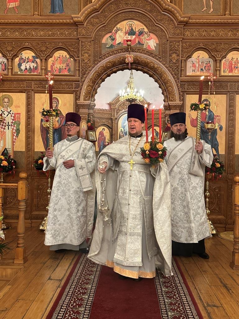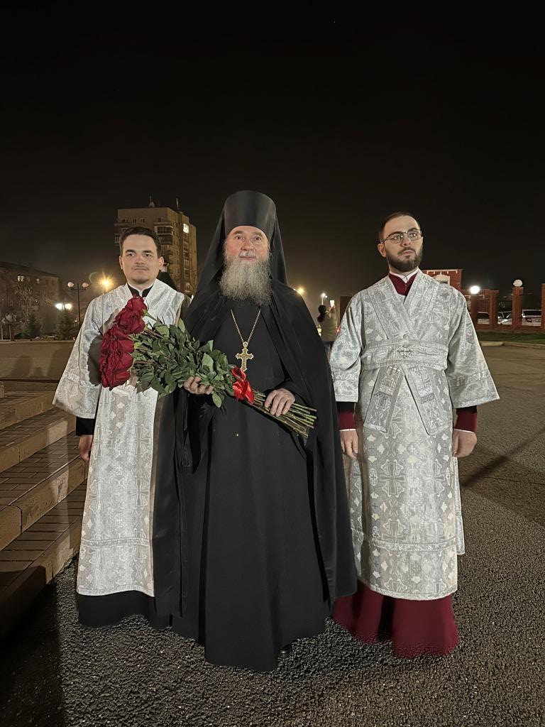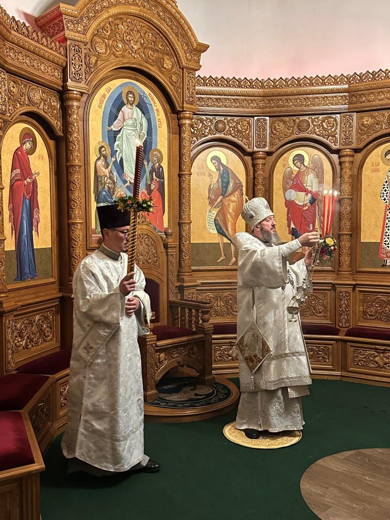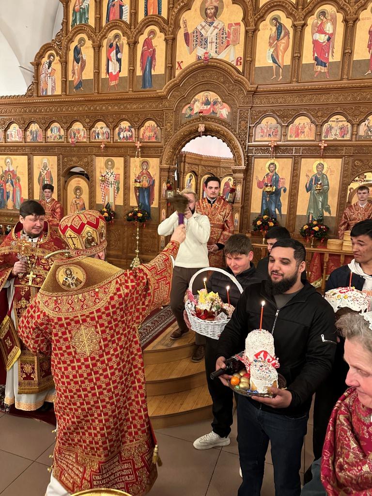 Высокопреосвященнейший архиепископ Усть-Каменогорский и Семипалатинский Амфилохий возглавил полунощницу, крестный ход, Пасхальную заутреню и Божественную литургию святителя Иоанна Златоуста. Высокопреосвященнейшему Владыке сослужили: ключарь Андреевского собора иеромонах Никодим (Авдеев), клирики собора иерей Виталий Адаменков, иерей Роман Подрезов, иерей Константин Дьяков, протодиакон Андрей Дудник, секретарь епархии диакон Илия Кван.