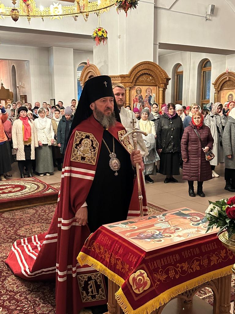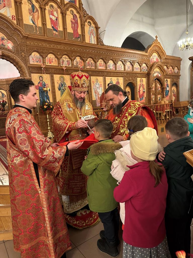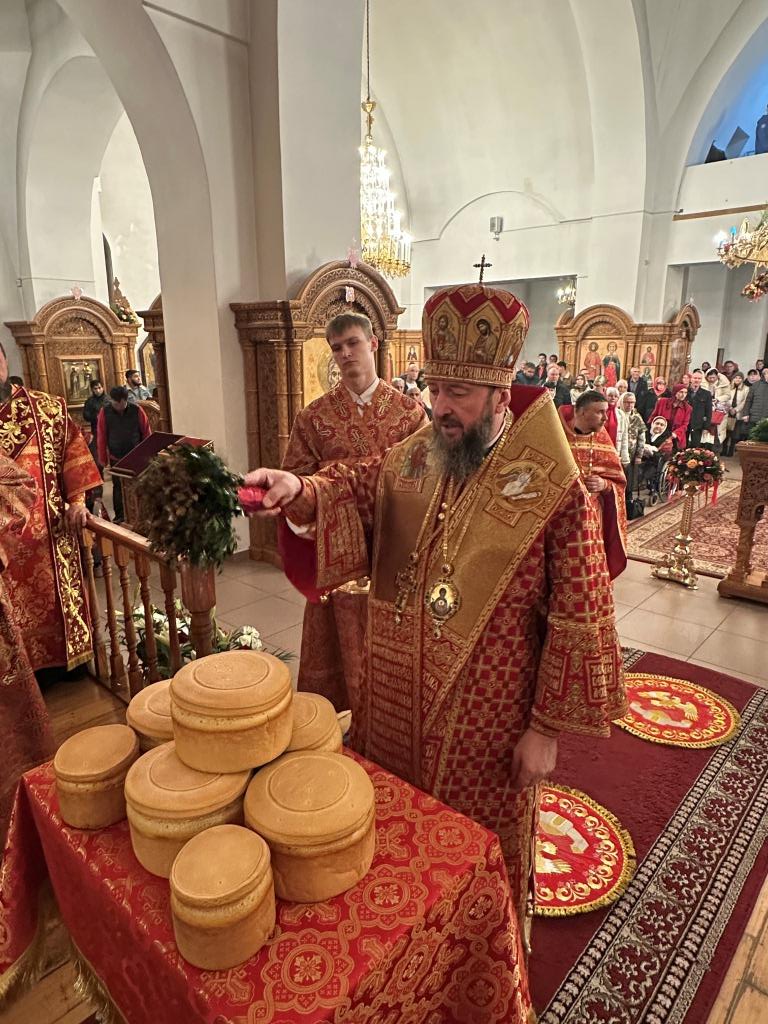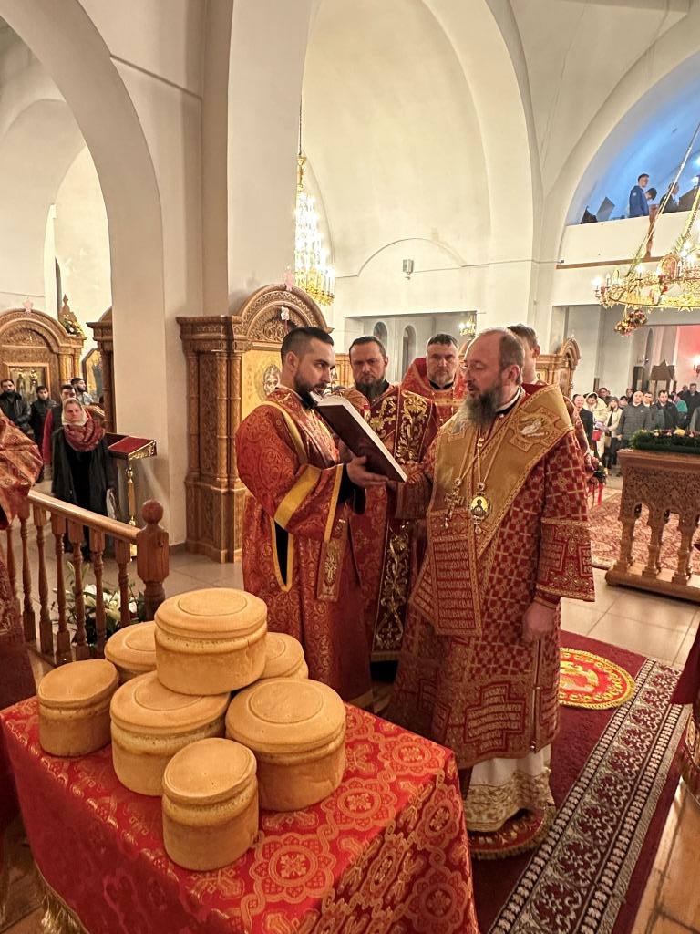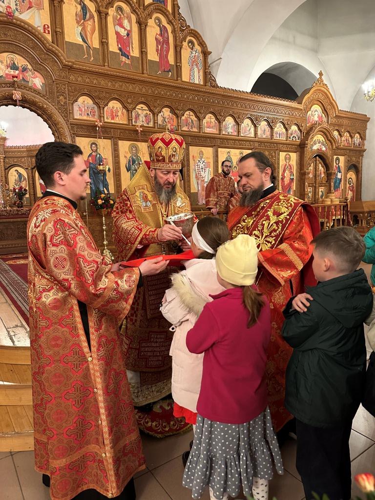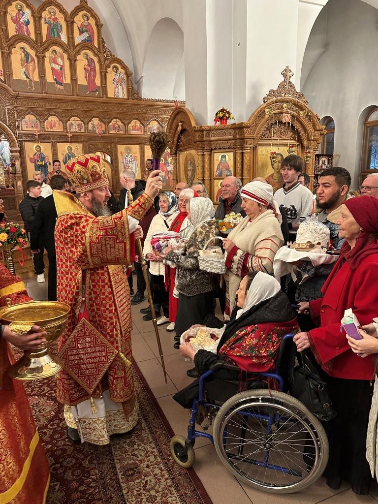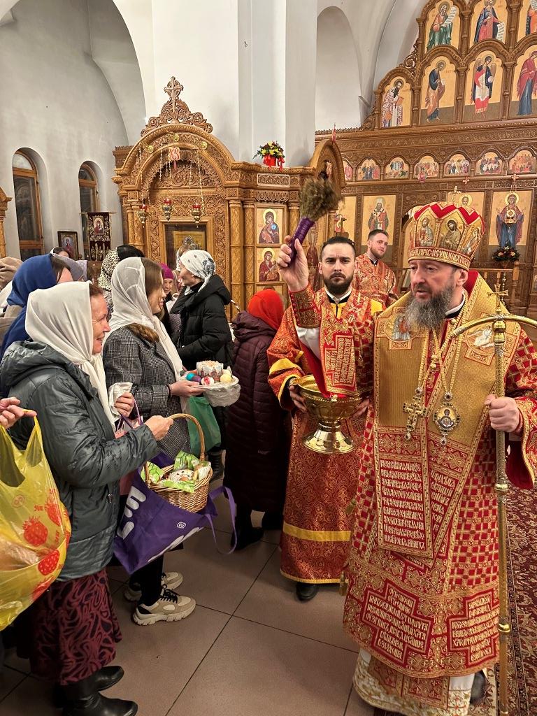 В завершение Богослужения Владыка архиепископ освятил пасхальную трапезу: крашеные яйца, пасхи и куличи.