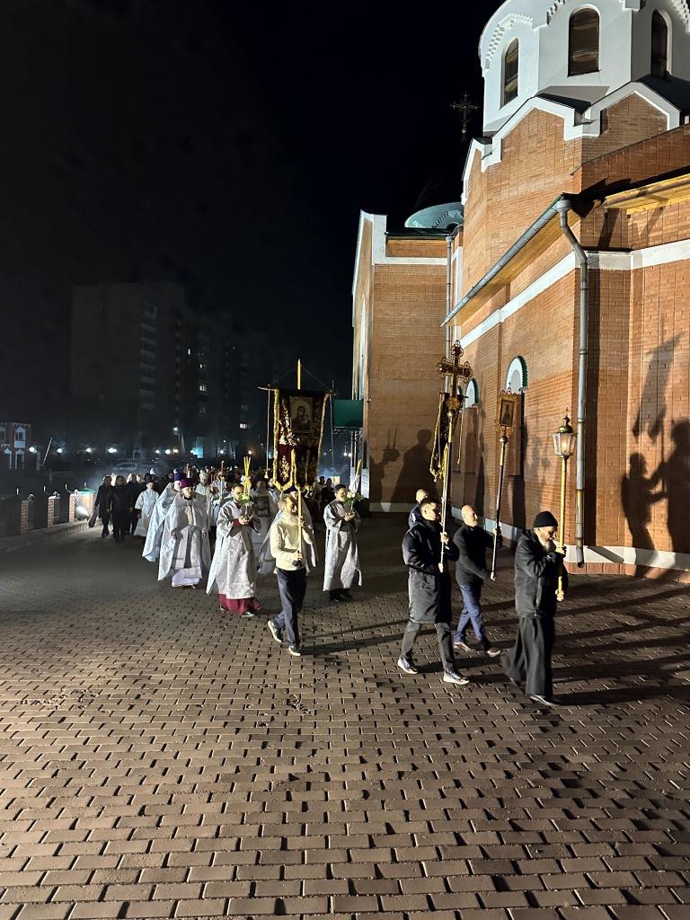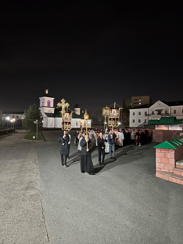 Ровно в полночь, под колокольный звон и пение стихиры «Воскресение Твое, Христе Спасе», был совершен крестный ход. Богослужение продолжилась пением пасхального канона. Пасхальные песнопения исполнял хор кафедрального собора под управлением Н. Романцовой. За богослужением молились прихожане и паломники главного храма Восточного Казахстана, сотрудники епархиального управления, насельники Свято-Троицкого мужского монастыря города Усть-Каменогорска.