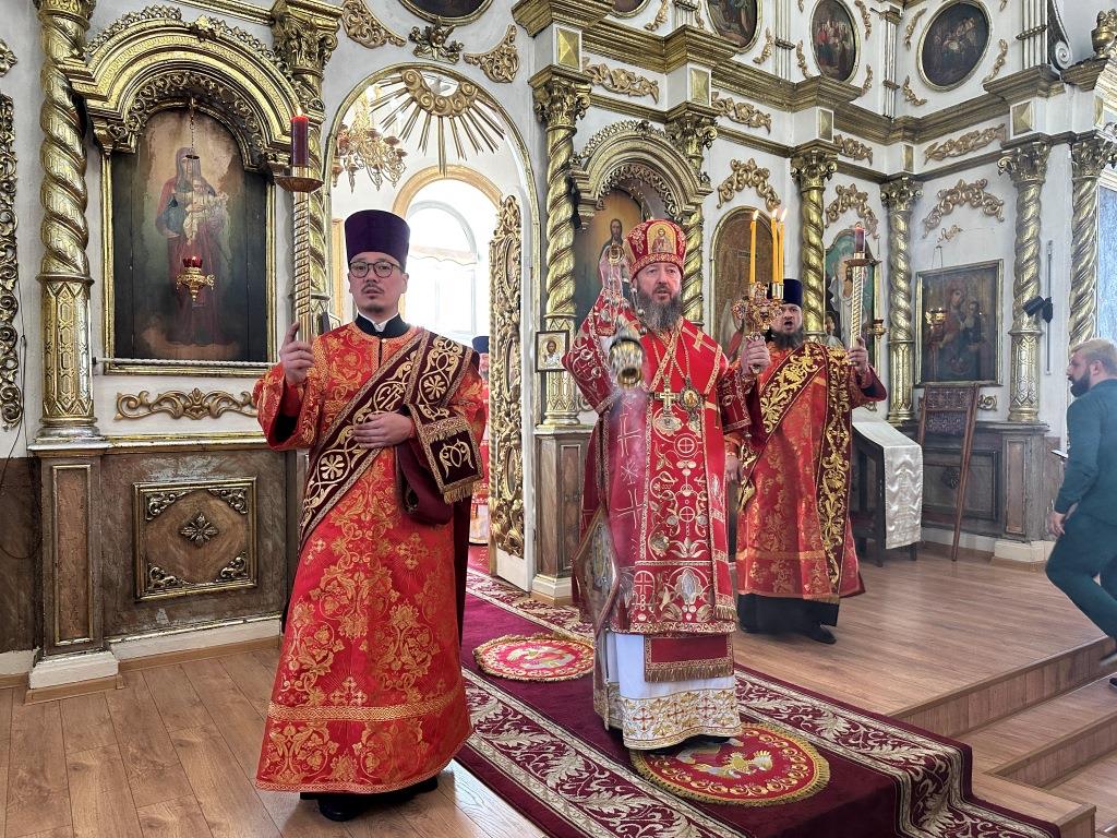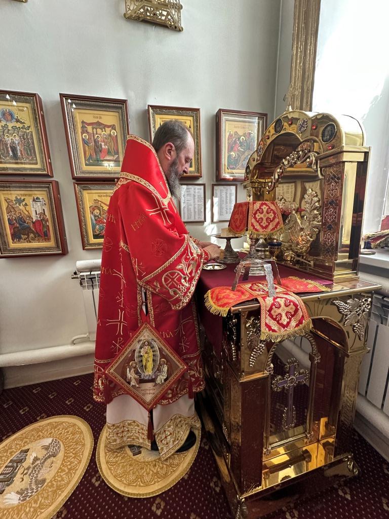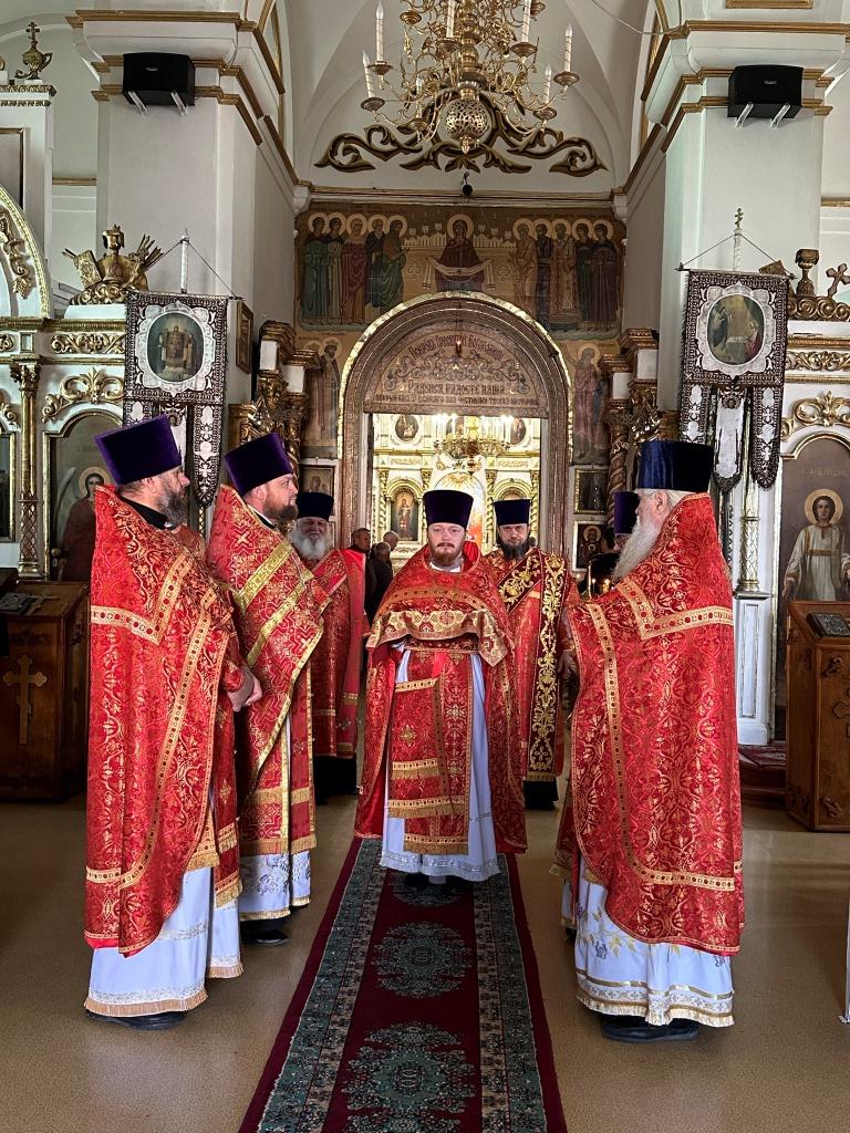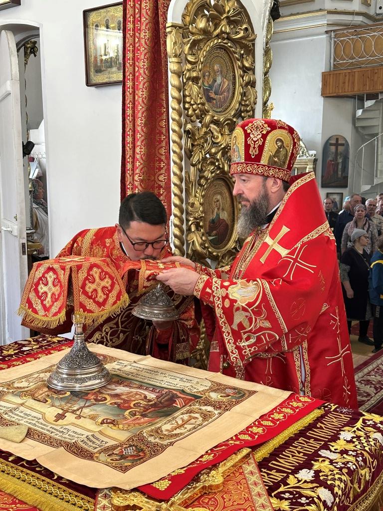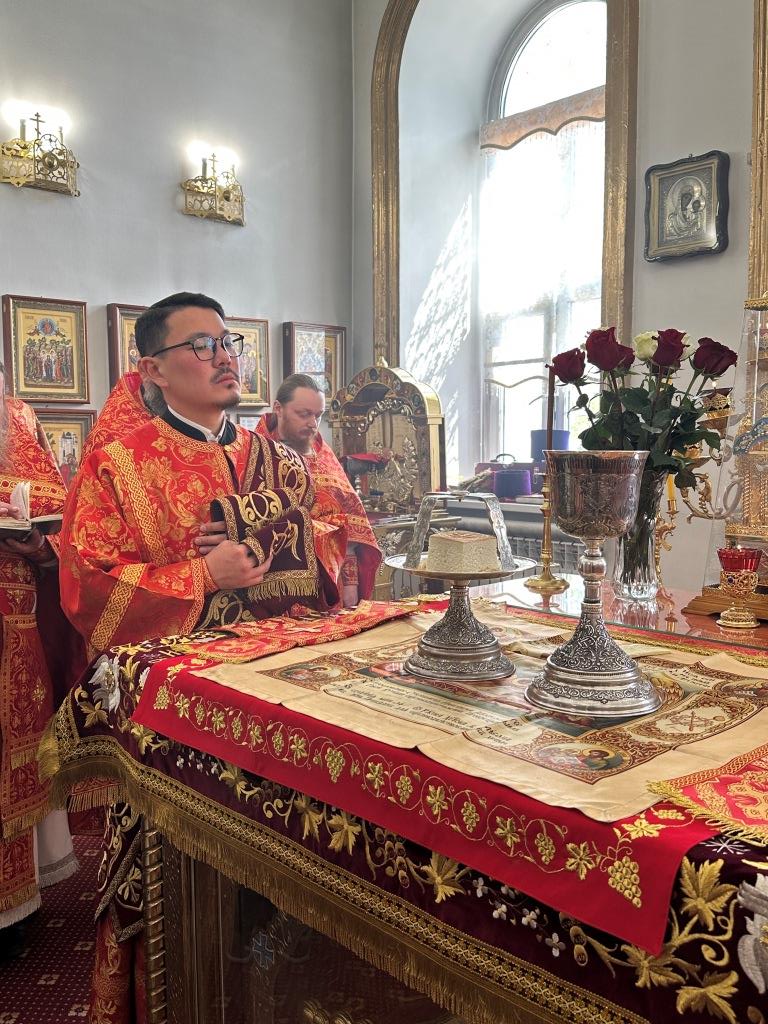 За праздничным богослужением архиепископу Амфилохию сослужили: благочинный Семипалатинского церковного округа протоиерей Евгений Яганов; клирики Воскресенского кафедрального собора протоиерей Александр Юркин, протоиерей Петр Хонин, протоиерей Сергий Жарич, иерей Евгений Хохряков; клирик Никольского храма города Риддера иерей Димитрий Нектеров, настоятель Никольского храма посёлка Бородулиха иерей Виталий Екидин; протодиакон Андрей Дудник и протодиакон Николай Белоконь, секретарь епархии диакон Илия Кван. Песнопения Божественной Литургии и престольного праздника исполнял хор Воскресенского кафедрального собора под управлением Ю. Хохряковой.