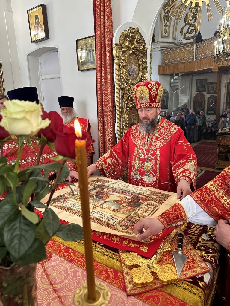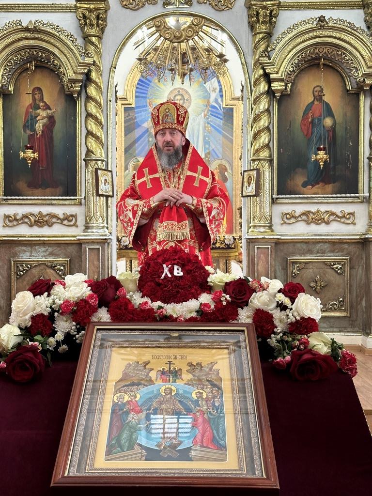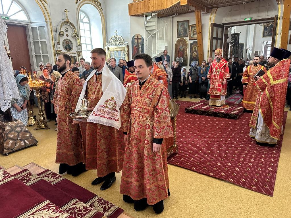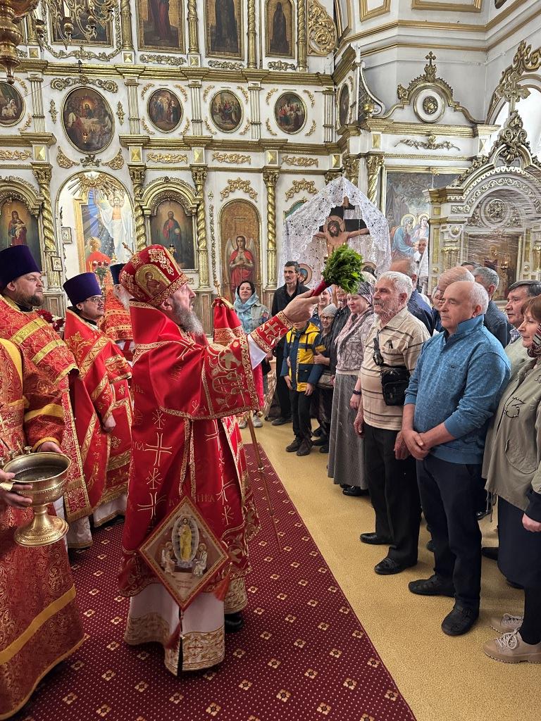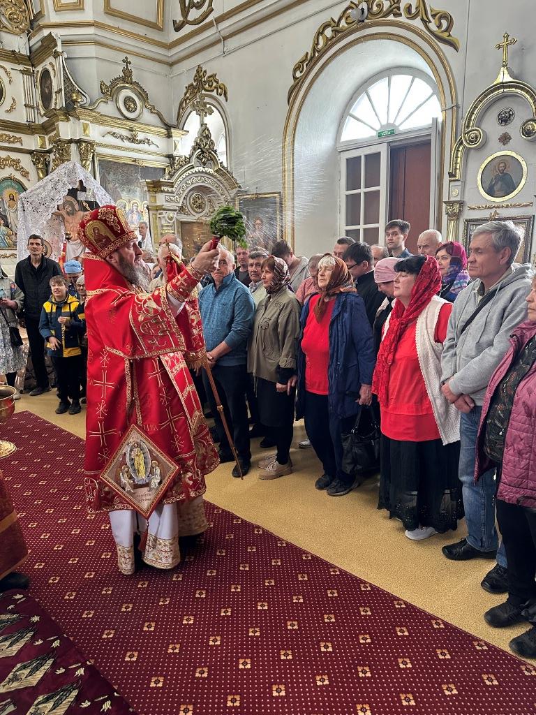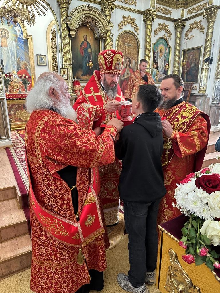 В храме молились и причащались Святых Христовых Таин прихожане Воскресенского собора, преподаватели и воспитанники приходской воскресной школы, паломники с городских приходов и окрестных населённых пунктов. После заамвонной молитвы Архипастырь с клириками и народом Божиим совершил крестный ход вокруг храма и славление Воскресшему Христу. Завершая престольное торжество, Владыка архиепископ поздравил собравшихся с великим праздником Пасхи Христовой и произнёс слова наставления.