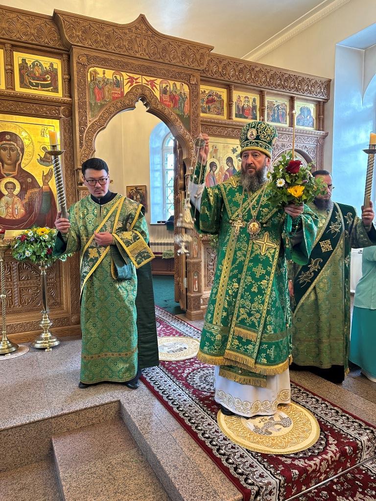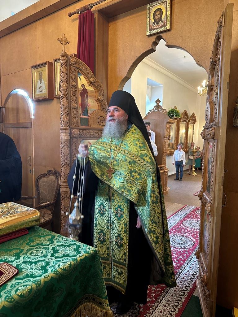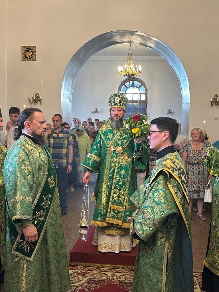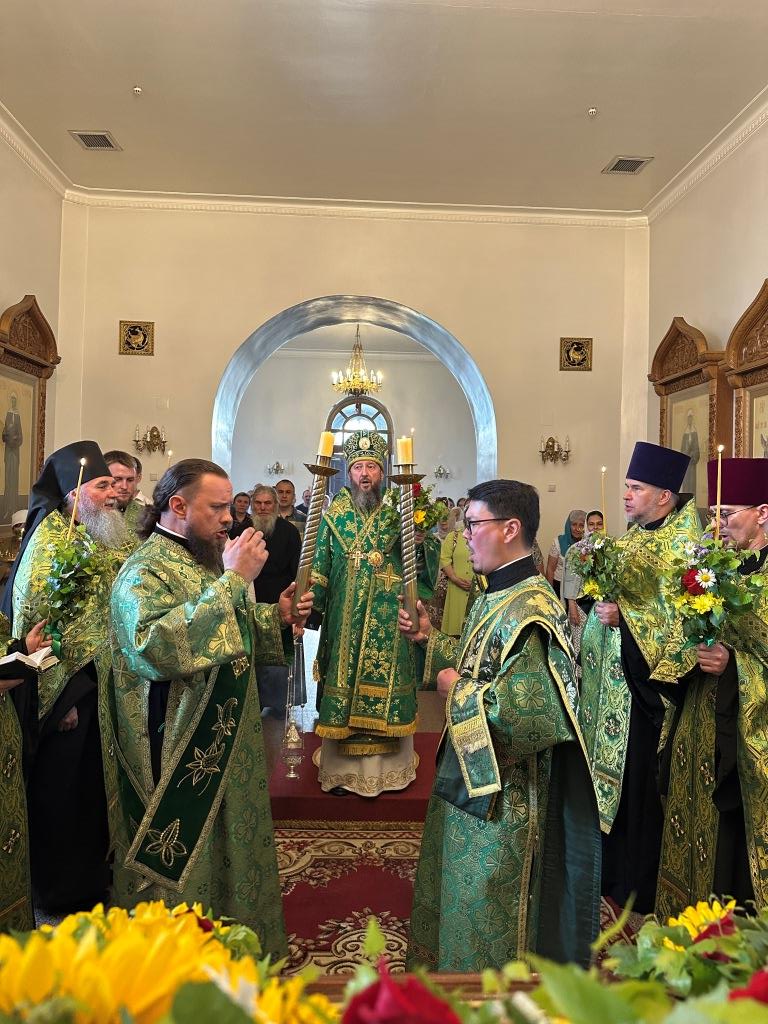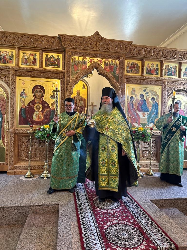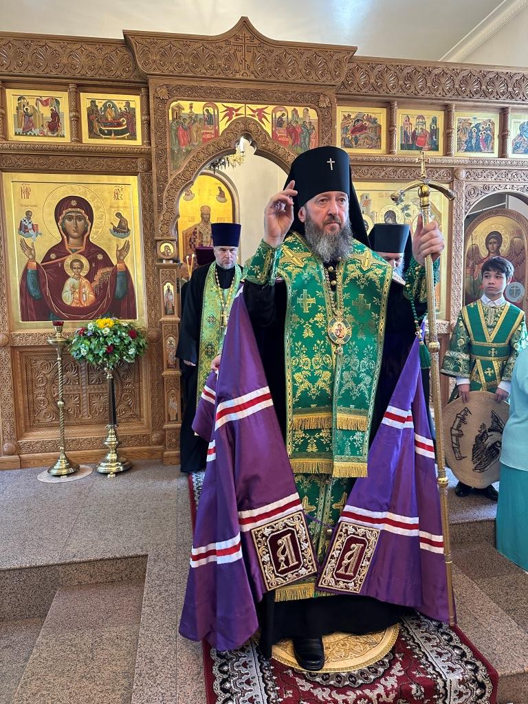 07 июня 2025 года, суббота. Седмица 7-я по Пасхе. Накануне двунадесятого праздника Святой Пятидесятницы Управляющий Усть-Каменогорской и Семипалатинской епархией Высокопреосвященнейший архиепископ Амфилохий возглавил служение Всенощного бдения в храме во имя Святой Троицы города Усть-Каменогорска.