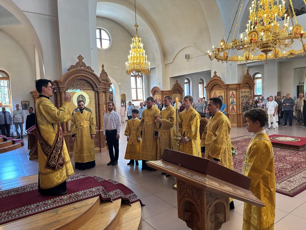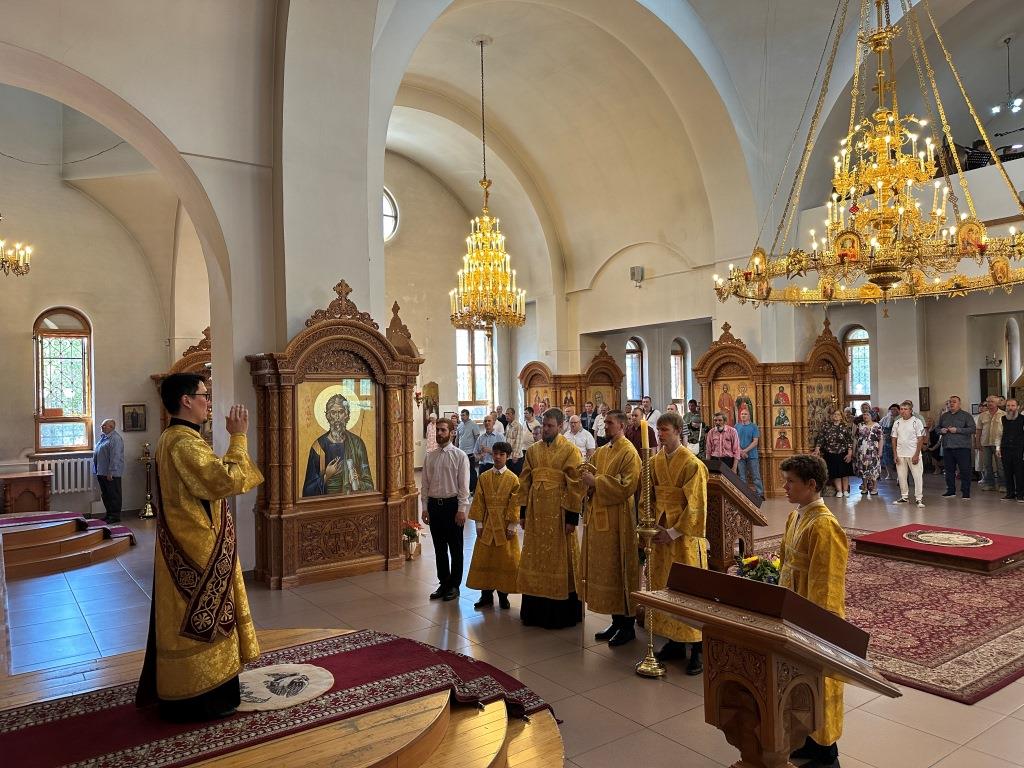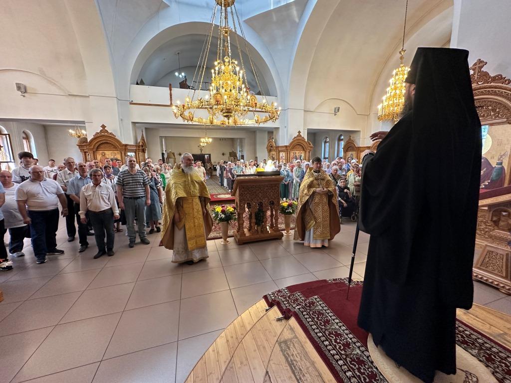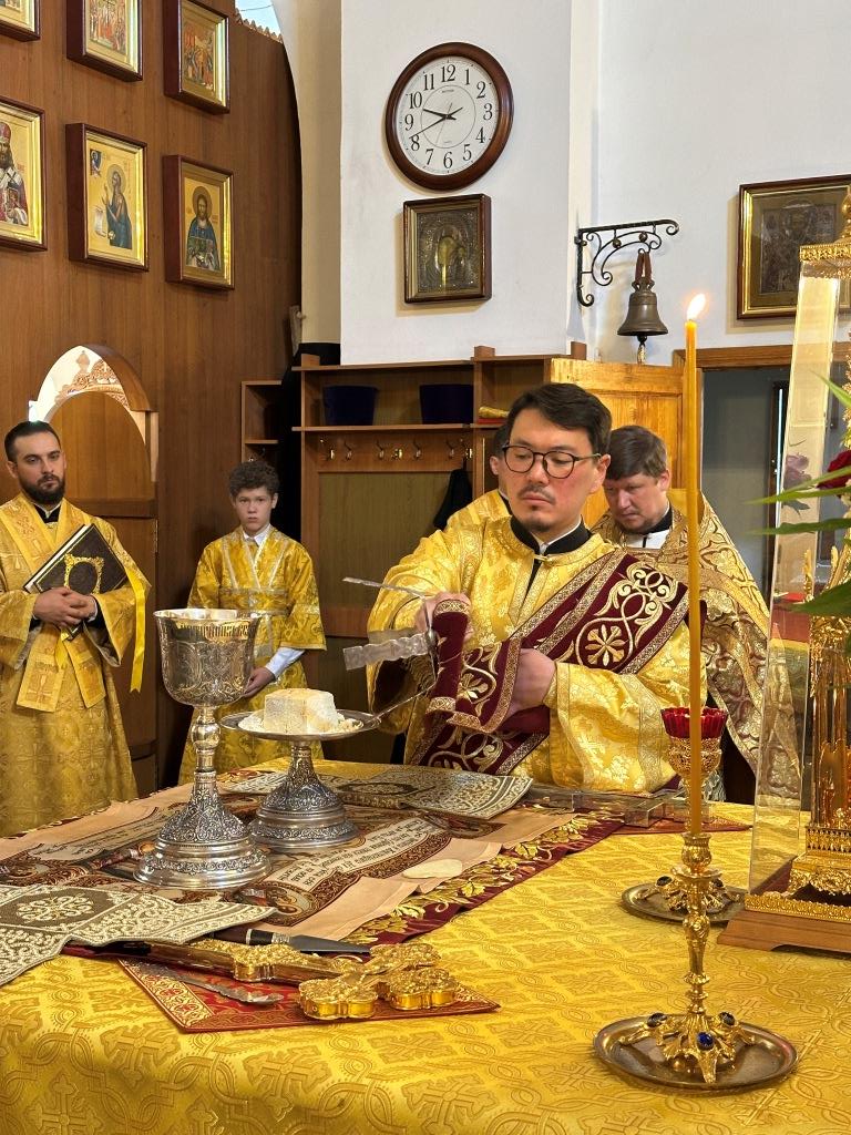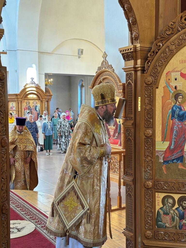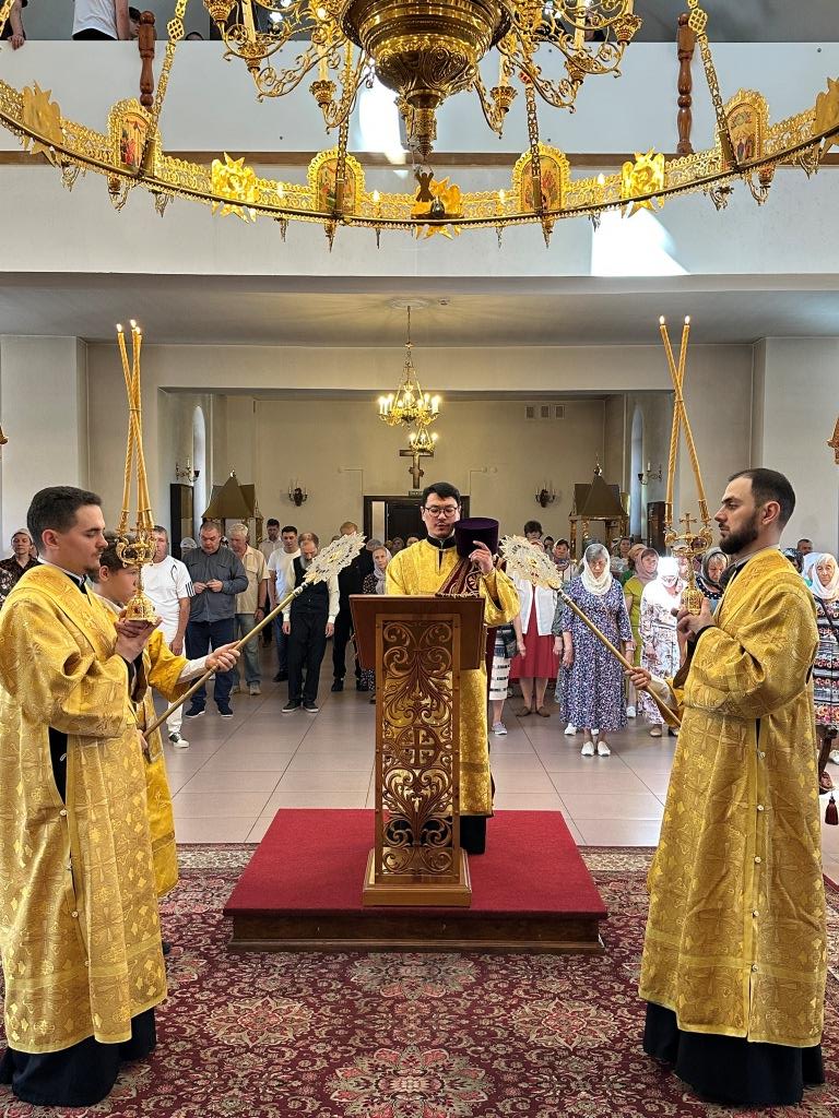 За воскресным богослужением молились насельники Свято-Троицкого мужского монастыря города Усть-Каменогорска, сотрудники епархиального управления, прихожане главного храма епархии, преподаватели и воспитанники приходской воскресной школы. Песнопения Божественной Литургии исполнял хор Андреевского кафедрального собора, регент Н. Романцова. Перед причастием мирян проповедовал священник Роман Подрезов.