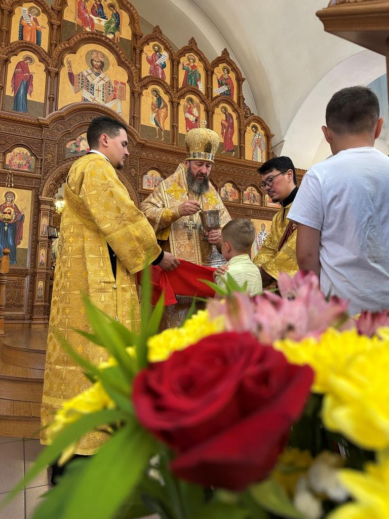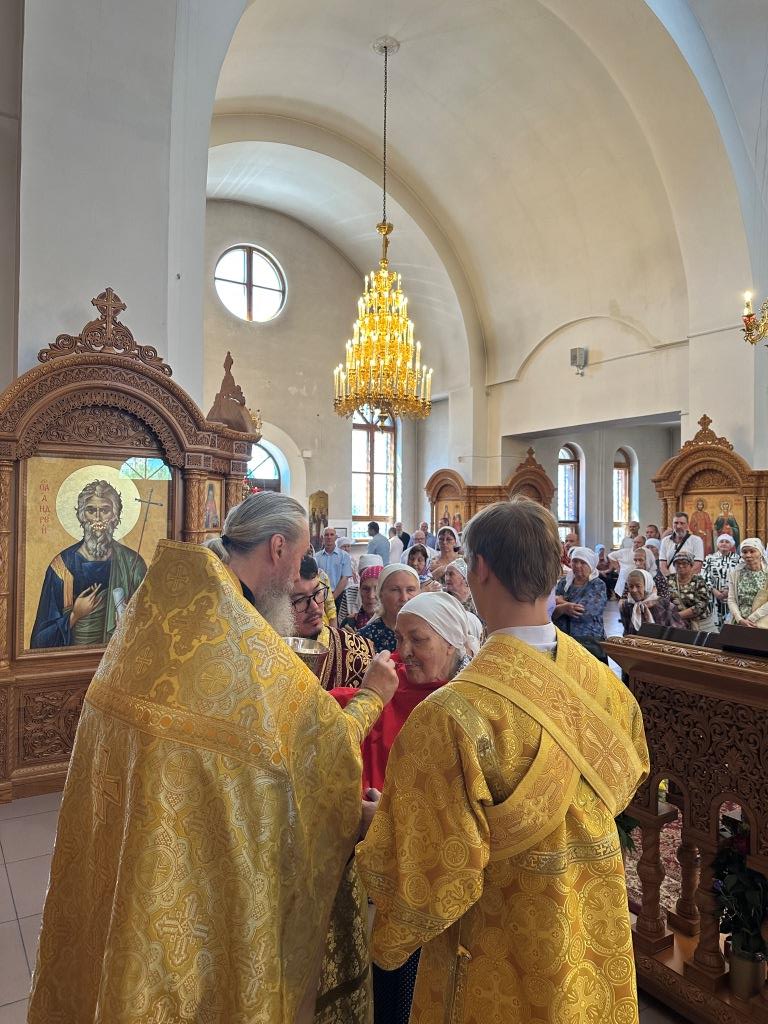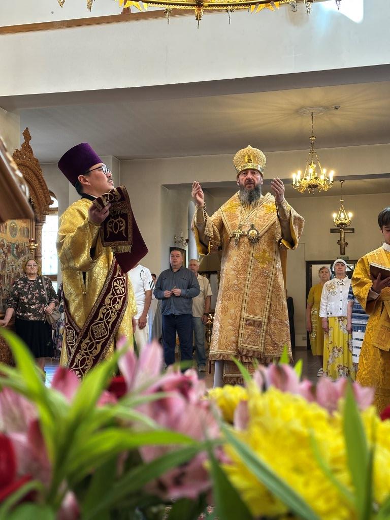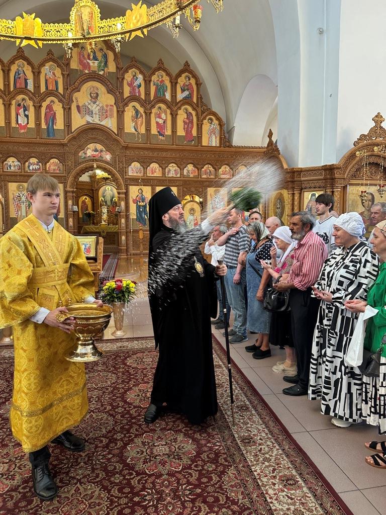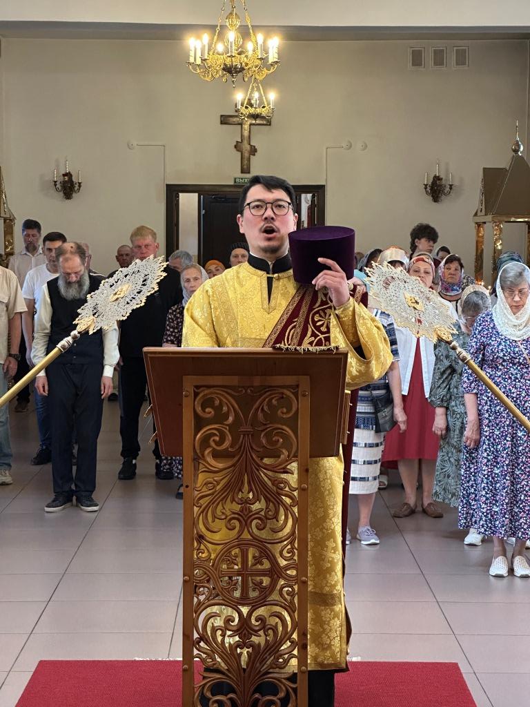 За воскресным богослужением молились насельники Свято-Троицкого мужского монастыря города Усть-Каменогорска, сотрудники епархиального управления, прихожане главного храма епархии, преподаватели и воспитанники приходской воскресной школы. Песнопения Божественной Литургии исполнял хор Андреевского кафедрального собора, регент Н. Романцова. Перед причастием мирян проповедовал священник Роман Подрезов.