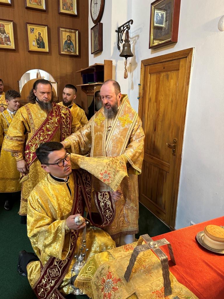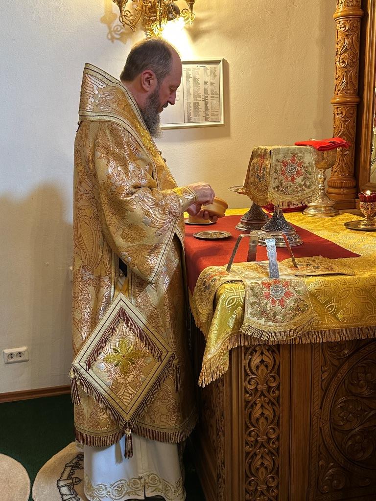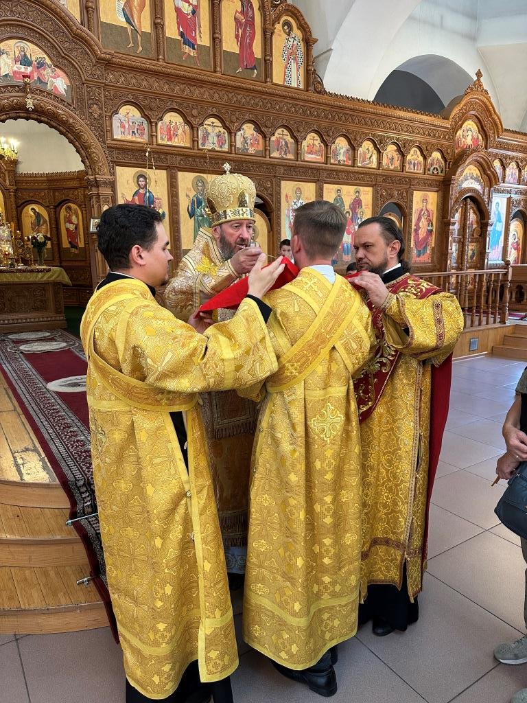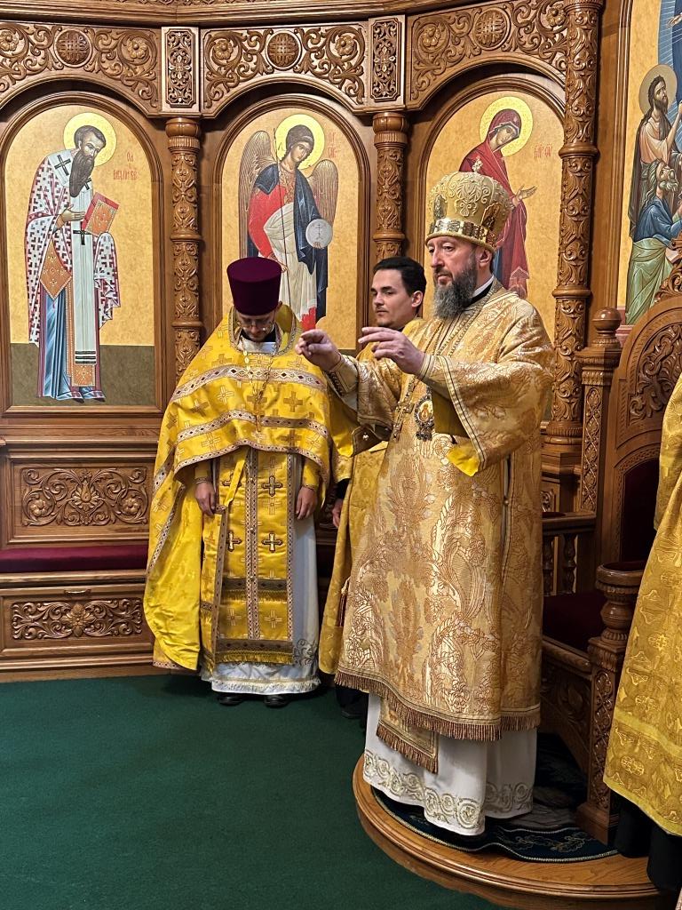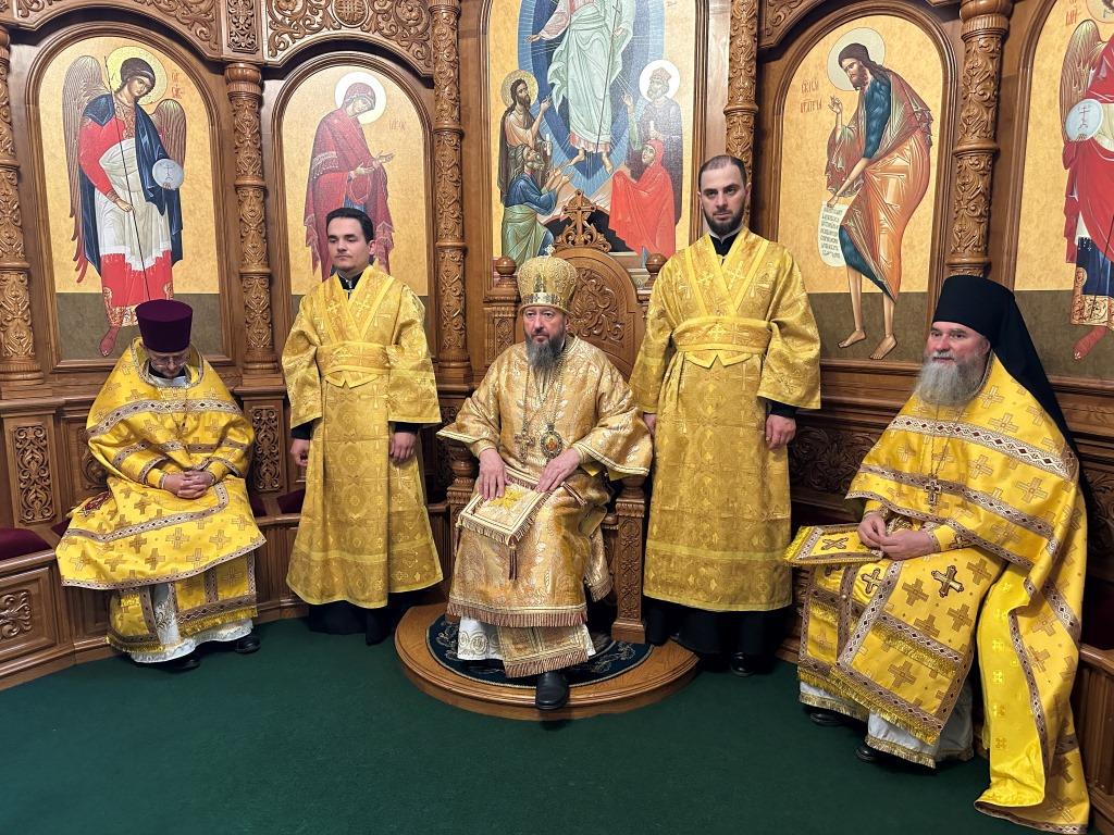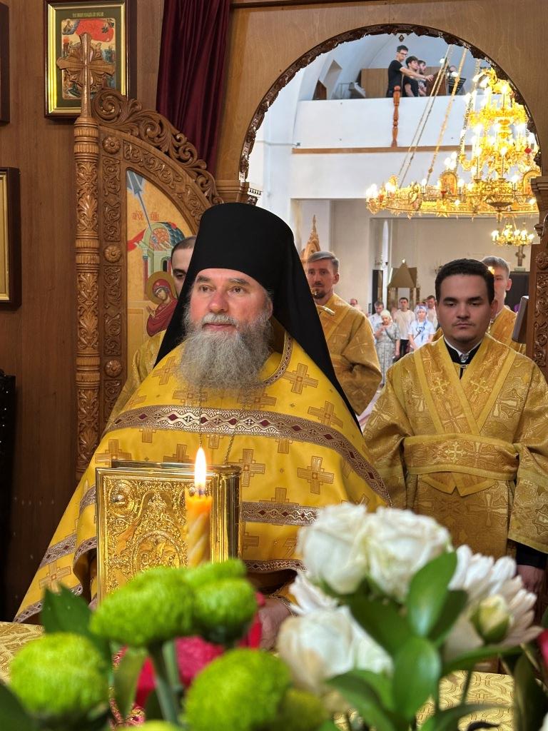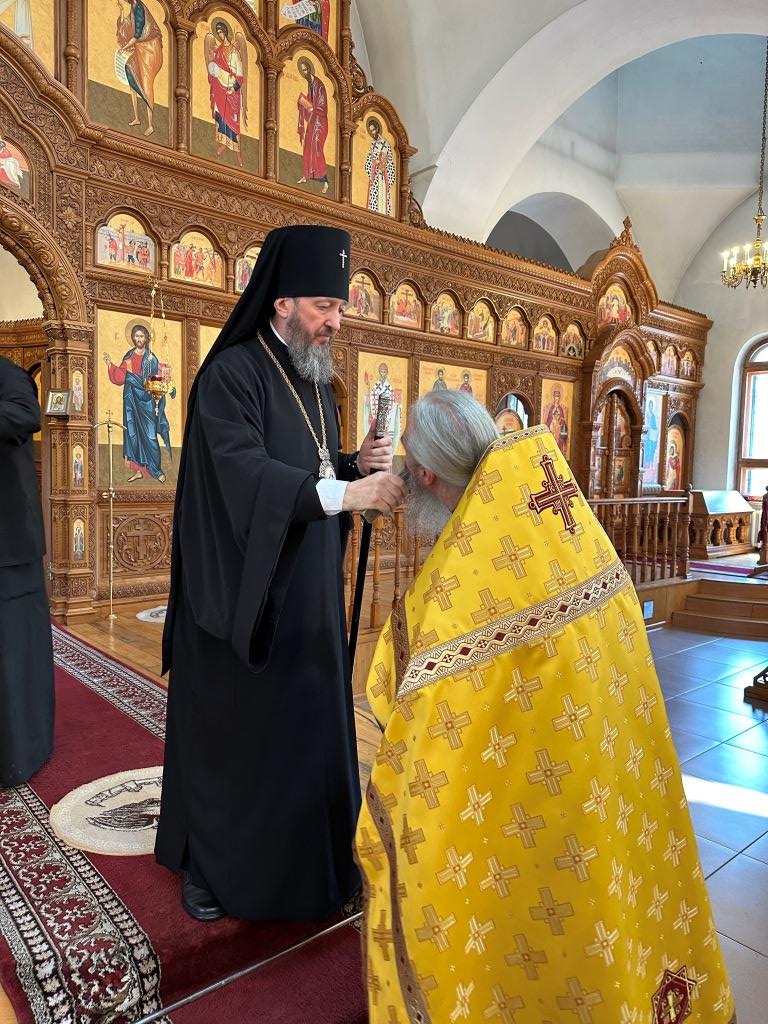 За богослужением архиепископ Амфилохий поздравил духовника Свято-Троицкого мужского монастыря, ключаря Андреевского кафедрального собора иеромонаха Никодима (Авдеева) с днём Тезоименитства.