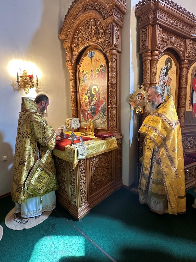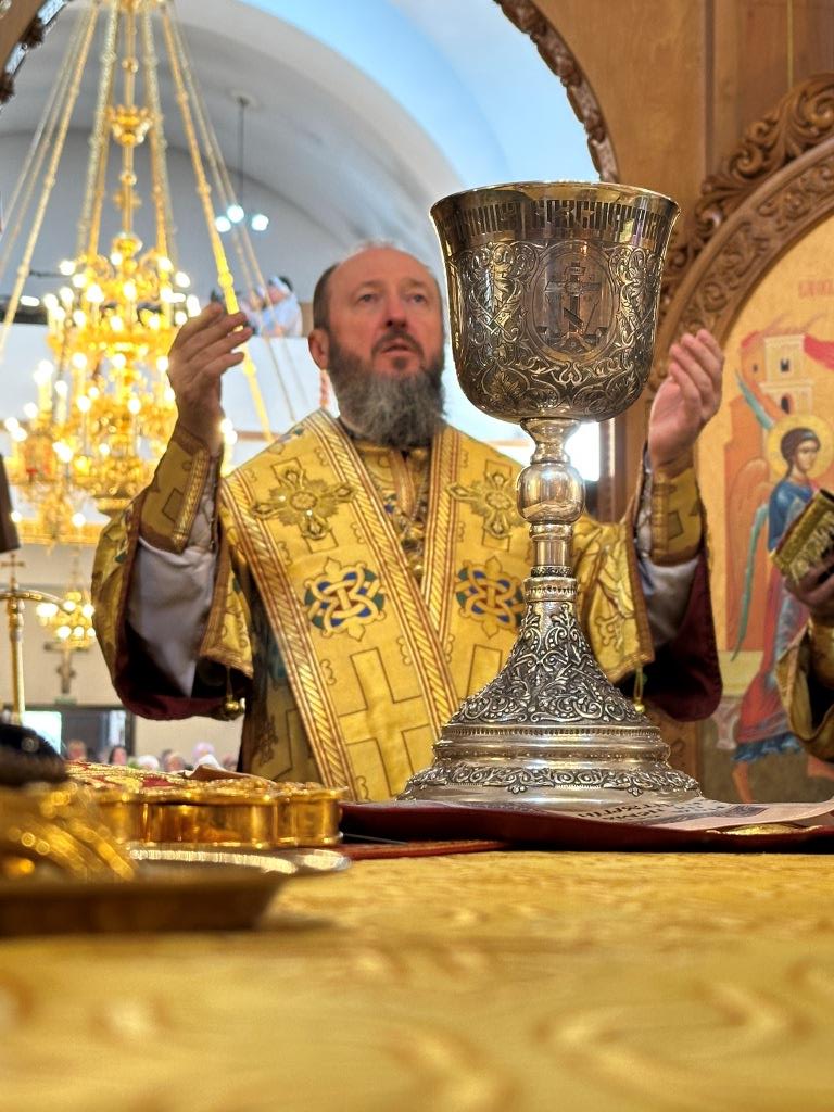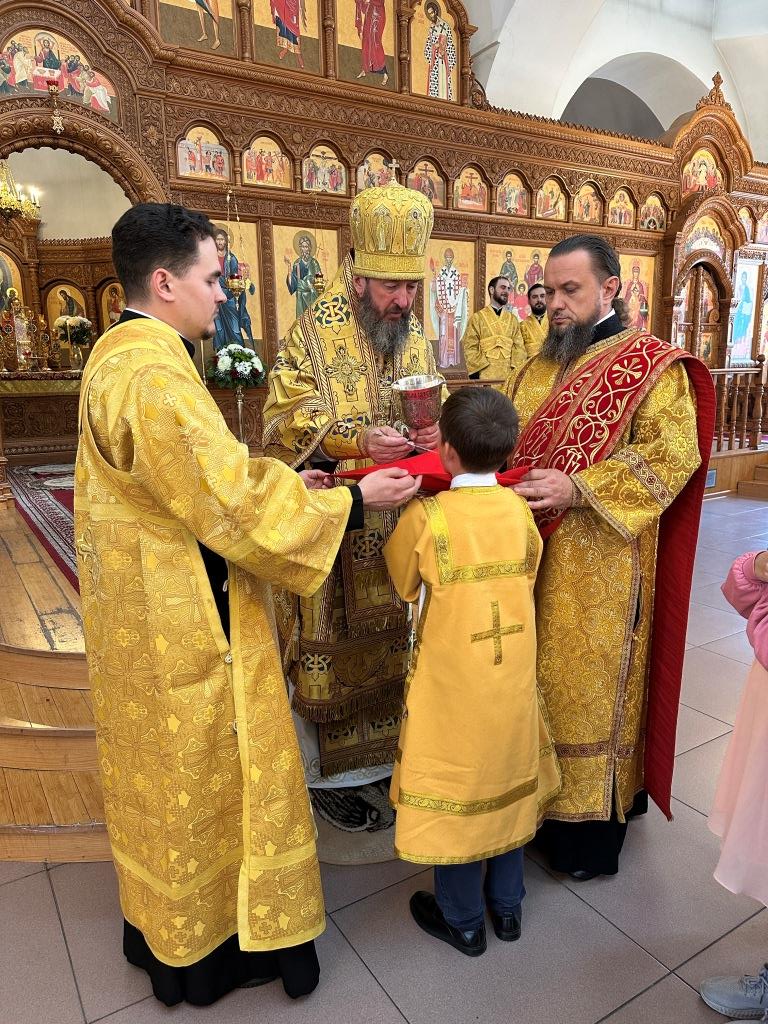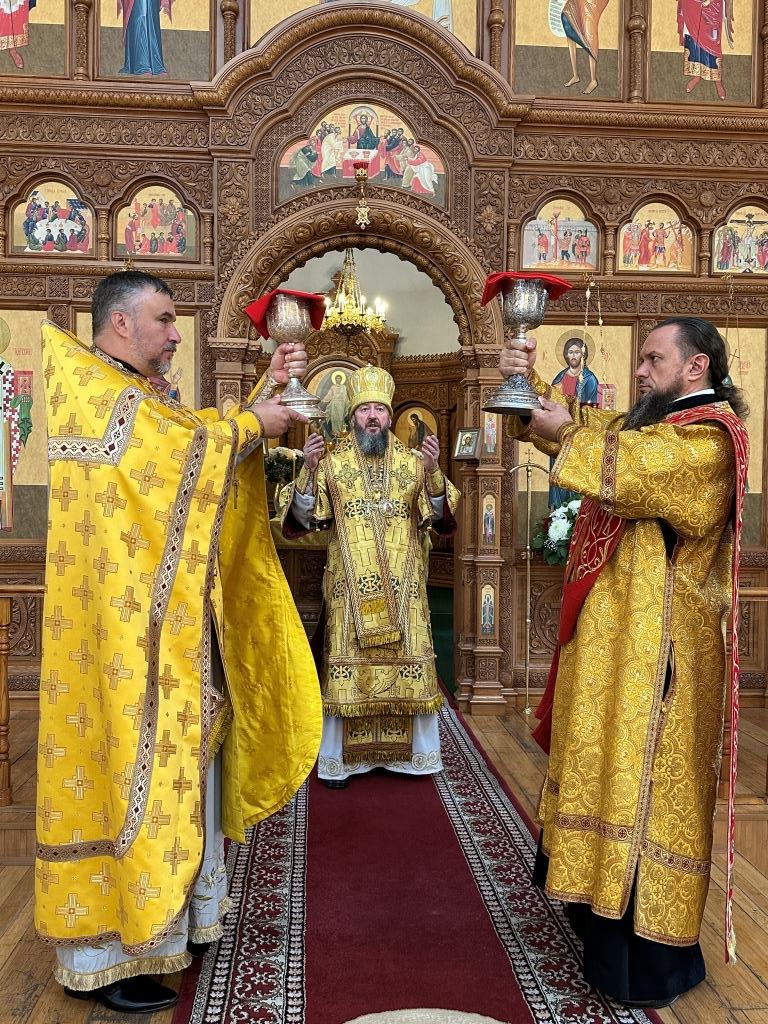 Его Высокопреосвященству сослужили: ключарь Андреевского собора иеромонах Никодим (Авдеев), клирик собора иерей Виталий Адаменков, протодиакон Андрей Дудник, секретарь епархии диакон Илия Кван. Хор род управлением регента Н. Романцовой исполнял богослужебные песнопения. Проповедь на запричастном стихе произнес иерей Виталий Адаменков.