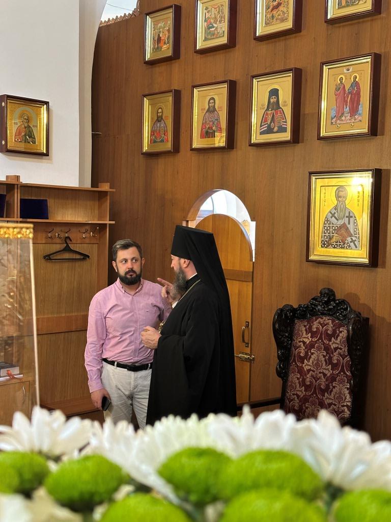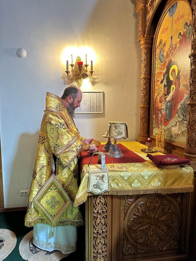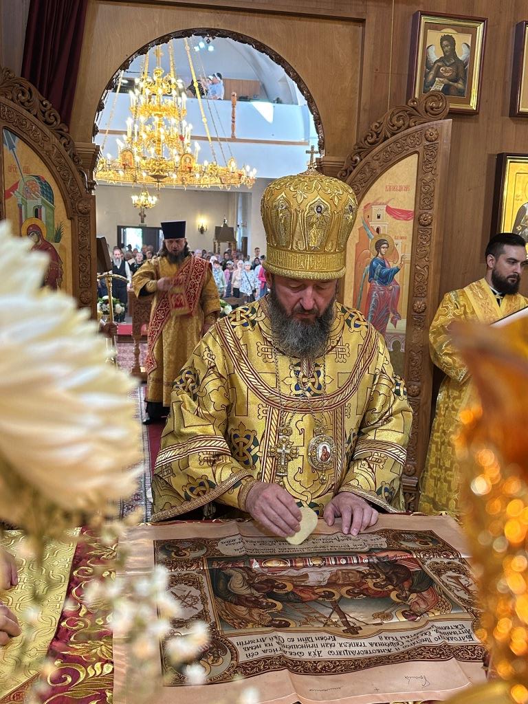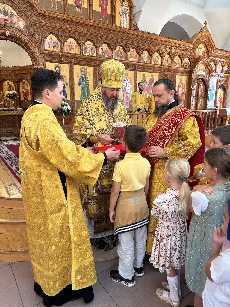 Его Высокопреосвященству сослужили: ключарь Андреевского собора иеромонах Никодим (Авдеев), клирик собора иерей Виталий Адаменков, протодиакон Андрей Дудник, секретарь епархии диакон Илия Кван. Хор род управлением регента Н. Романцовой исполнял богослужебные песнопения. Проповедь на запричастном стихе произнес иерей Виталий Адаменков.