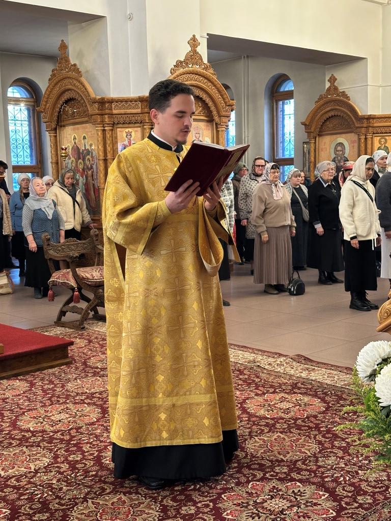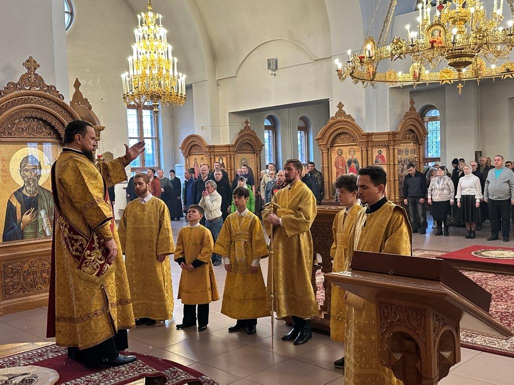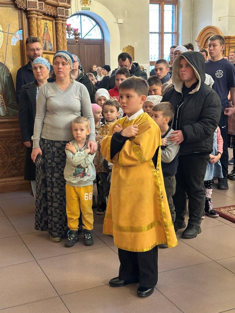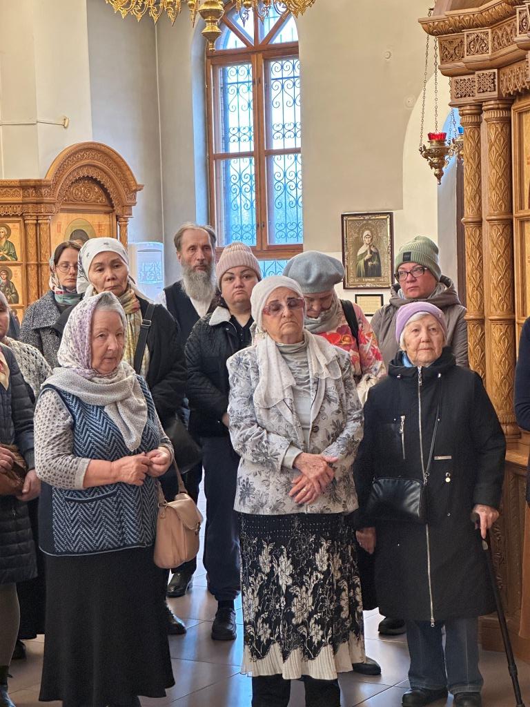 Песнопения воскресного дня и Божественной Литургии исполнял хор кафедрального собора, регент Н. Романцова. За Богослужением молились сотрудники епархиального управления, насельники Свято-Троицкого мужского монастыря города Усть-Каменогорска, преподаватели и воспитанники Центральной воскресной школы, прихожане главного храма епархии.
