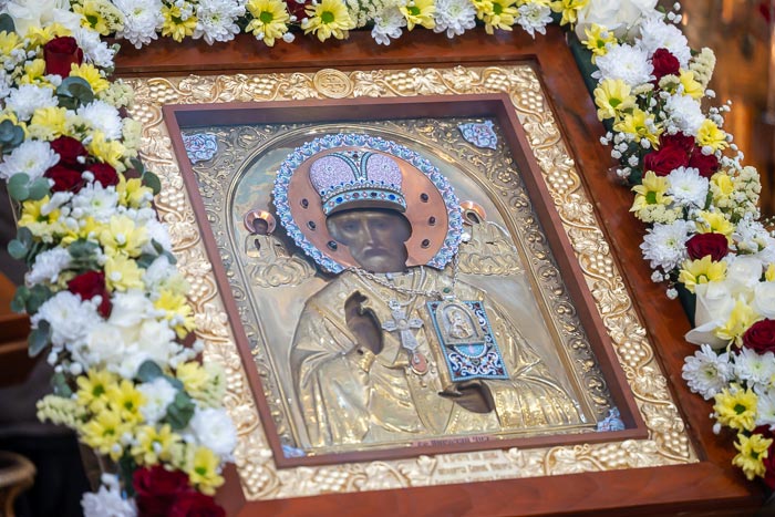 Перед началом Литургии для молитвенного поклонения и духовного укрепления верующих из алтаря собора был изнесен ковчег с мощами святителя и чудотворца Николая.