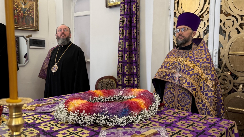Богослужебные песнопения исполнял хор кафедрального собора (регент Ю. Хохрякова). В храме молились прихожане Воскресенского собора и православные христиане города Семипалатинска. По традиции, полиелей совершался в алтаре. После Великого славословия архиепископ Амфилохий совершил Чин изнесения из алтаря Честных Древ Креста Господня. Святыня была положена на праздничный аналой в центре храма, после чего Владыка архиепископ, духовенство и все молящиеся поклонились Кресту Господню. Затем архиепископ Амфилохий помазал клир и народ Божий освященным елеем.
