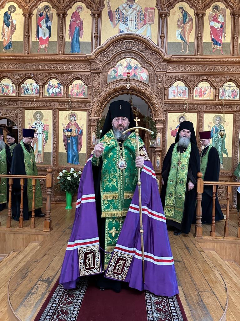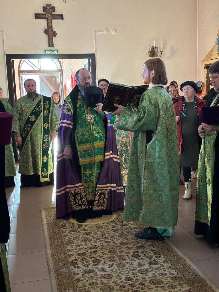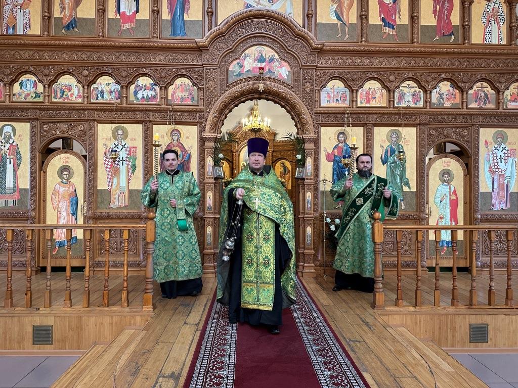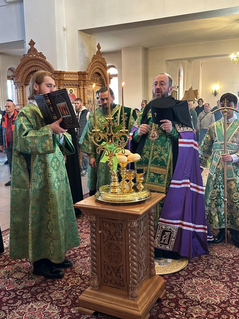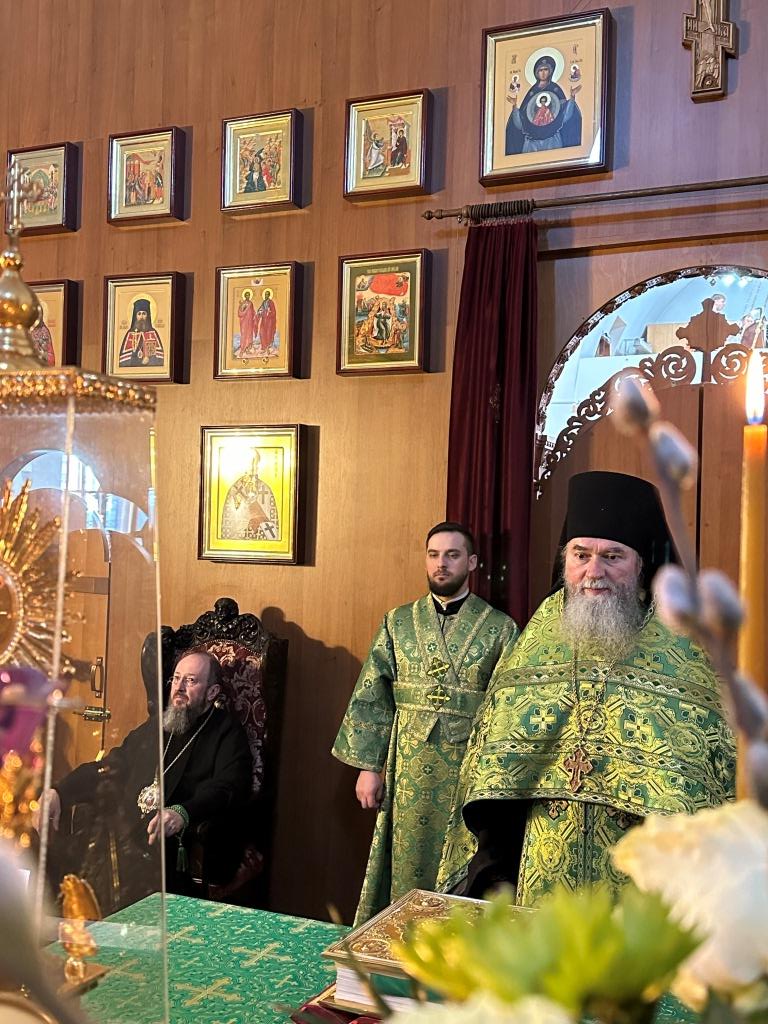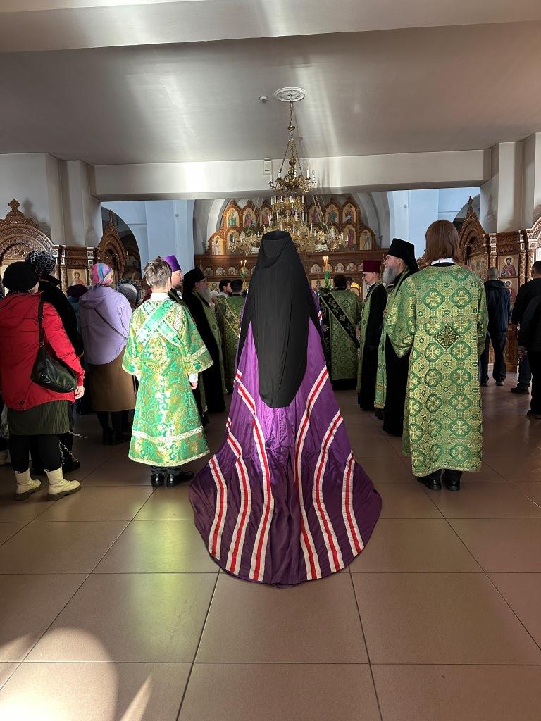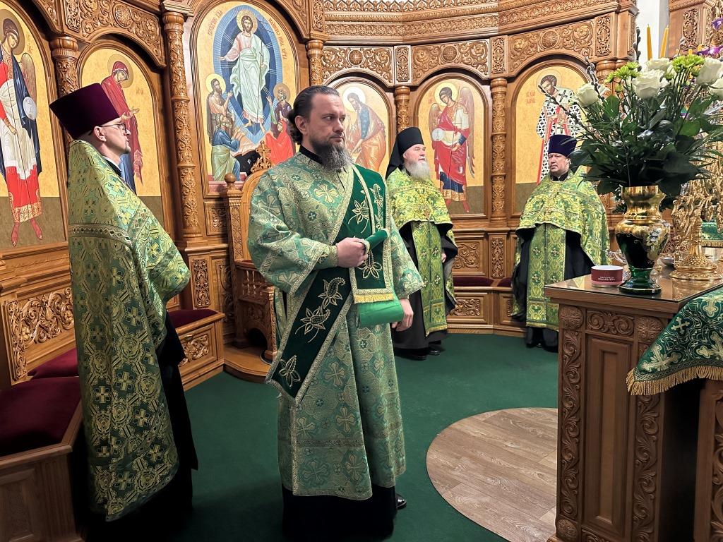 Его Высокопреосвященству сослужили: ключарь Андреевского собора иеромонах Никодим (Авдеев), клирики собора иерей Роман Подрезов, иерей Константин Дьяков, иеромонах Рафаил (Юстус); протодиакон Андрей Дудник, секретарь епархии диакон Илия Кван, диакон Кирилл Рамазанов. Хор под управлением регента Н. Романцовой исполнял богослужебные песнопения Всенощного бдения и праздника. За богослужением совершалась лития – сугубое моление с освящением хлеба, пшеницы, вина и елея.