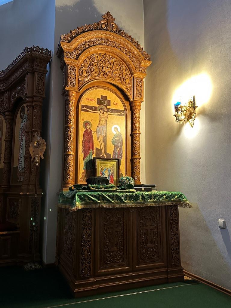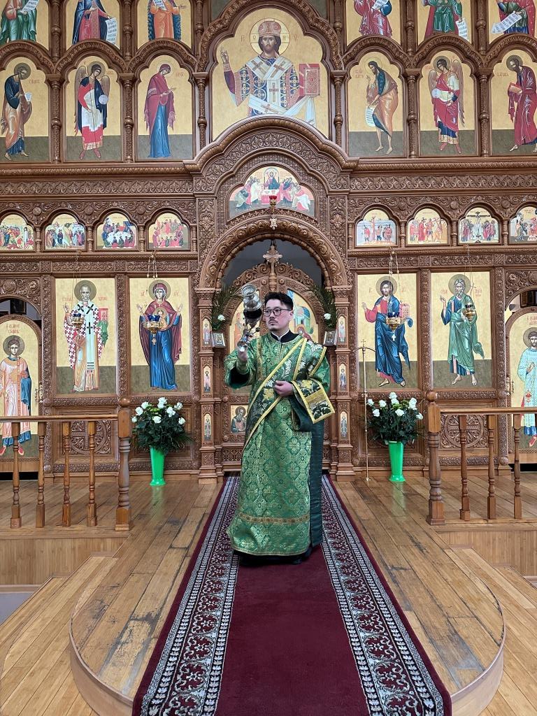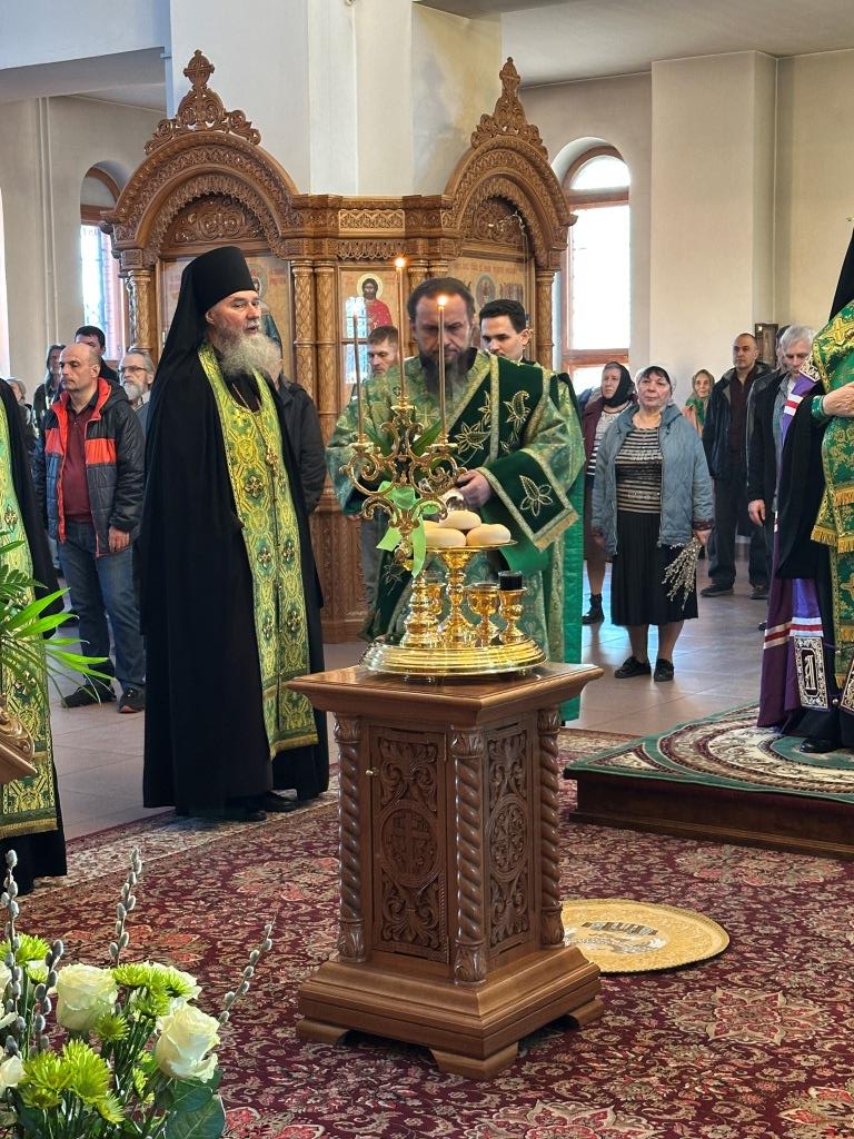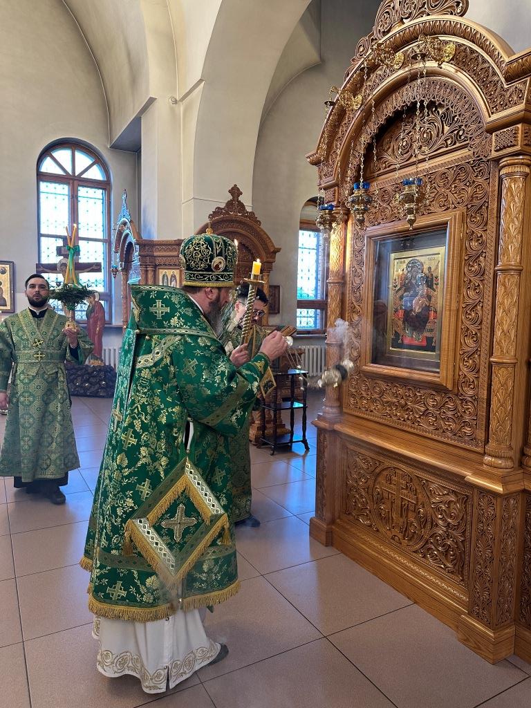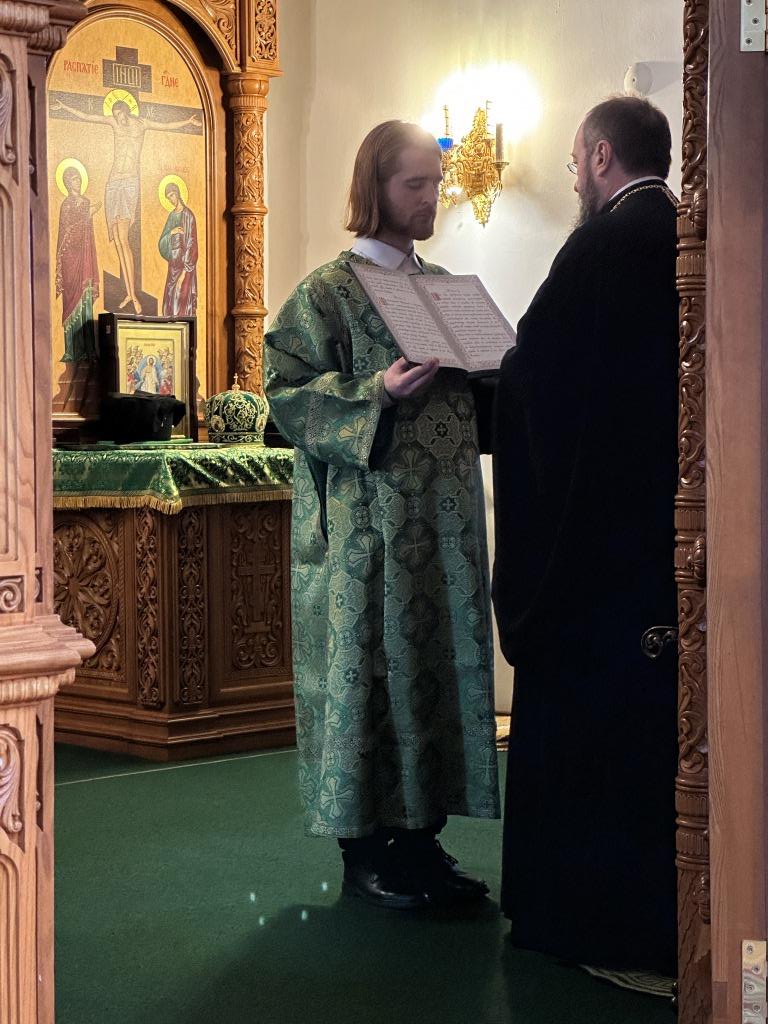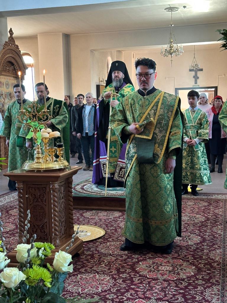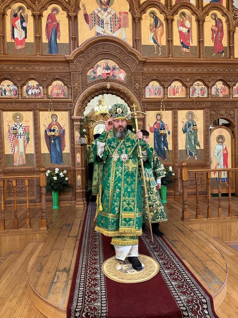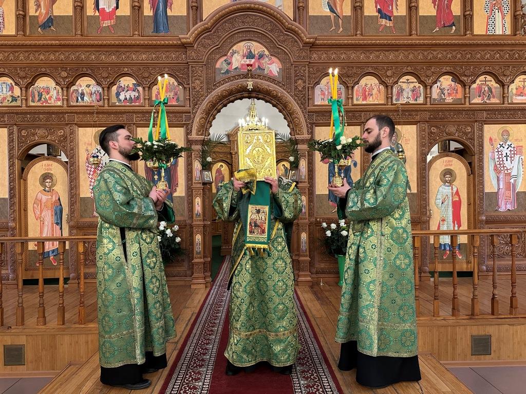 Его Высокопреосвященству сослужили: ключарь Андреевского собора иеромонах Никодим (Авдеев), клирики собора иерей Роман Подрезов, иерей Константин Дьяков, иеромонах Рафаил (Юстус); протодиакон Андрей Дудник, секретарь епархии диакон Илия Кван, диакон Кирилл Рамазанов. Хор под управлением регента Н. Романцовой исполнял богослужебные песнопения Всенощного бдения и праздника. За богослужением совершалась лития – сугубое моление с освящением хлеба, пшеницы, вина и елея.