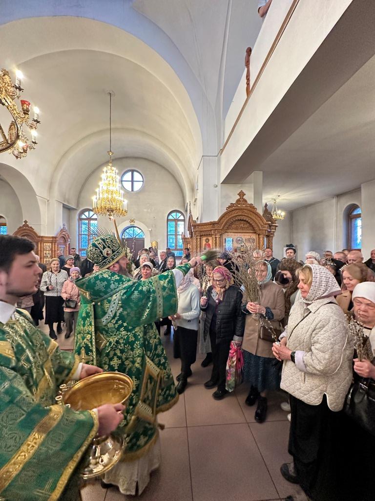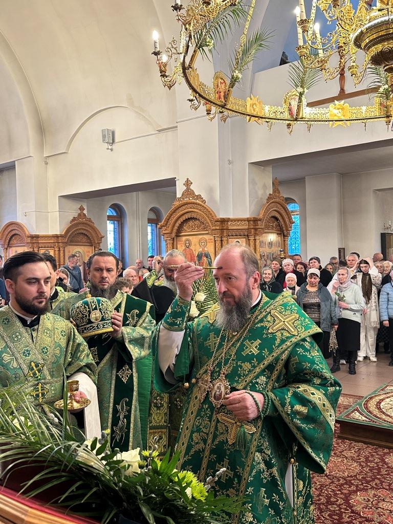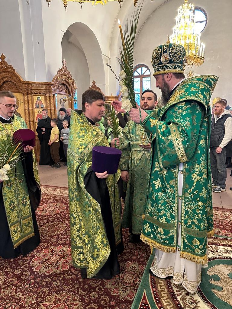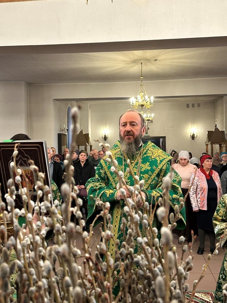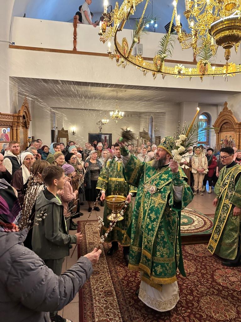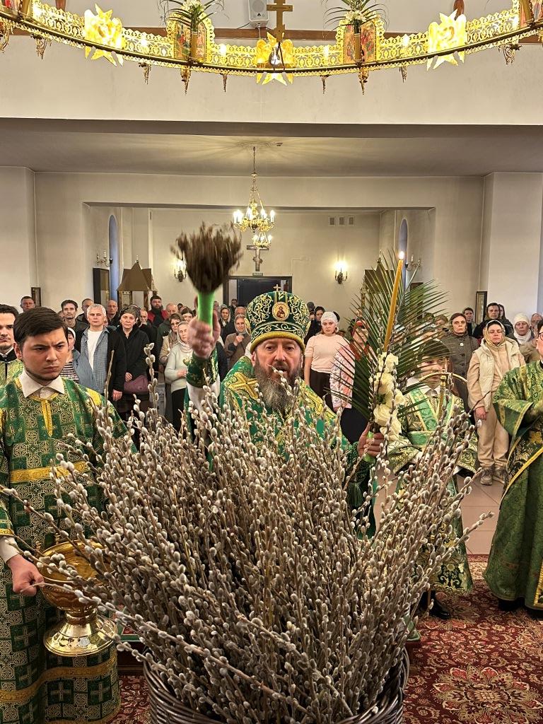 На полиелее читался отрывок из Евангелия от Матфея, повествующий о торжественном входе Господа Иисуса Христа в Иерусалим на осленке. После чтения Евангелия и 50-го псалма Владыка архиепископ вознес особую молитву и окропил ветви верб святой водой, после чего помазал клир и паству освященным елеем.