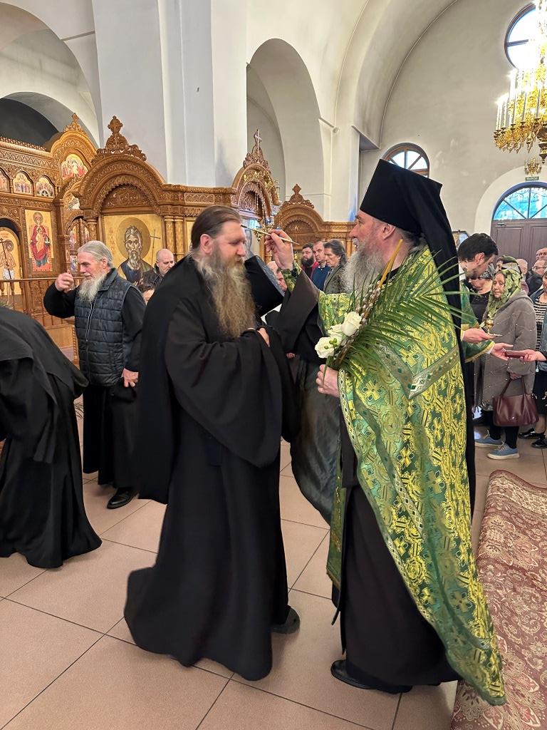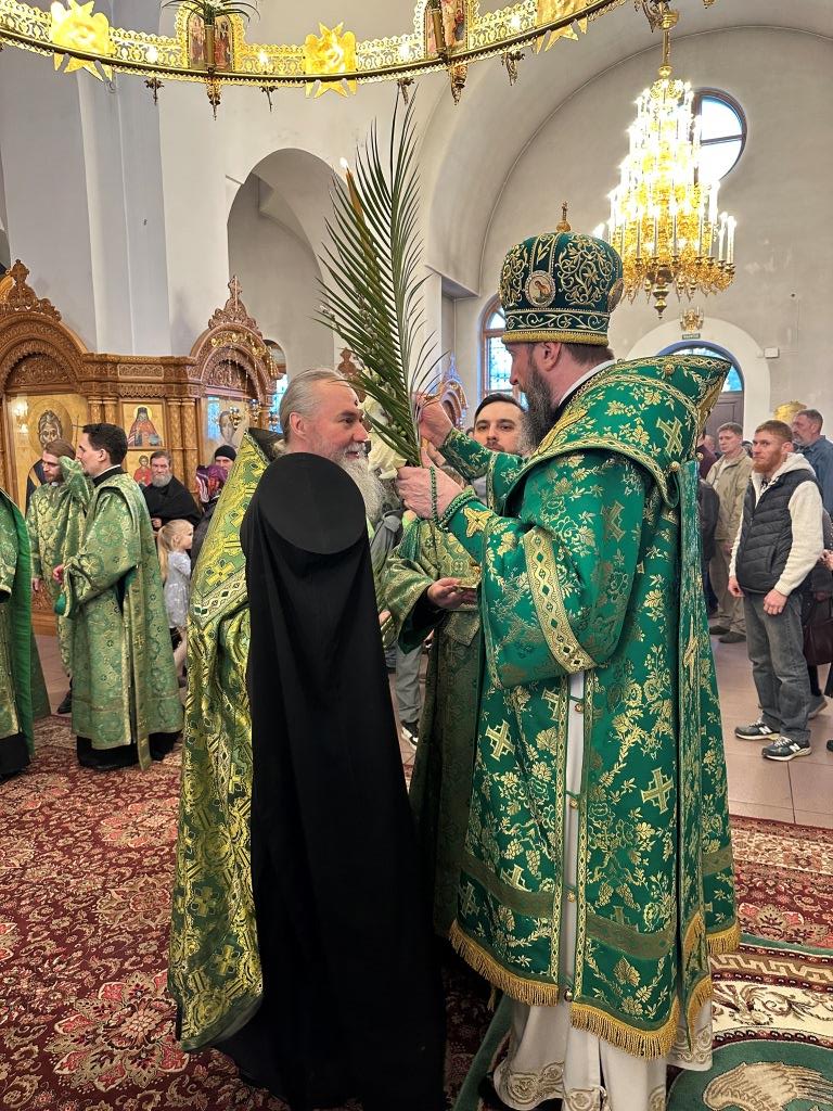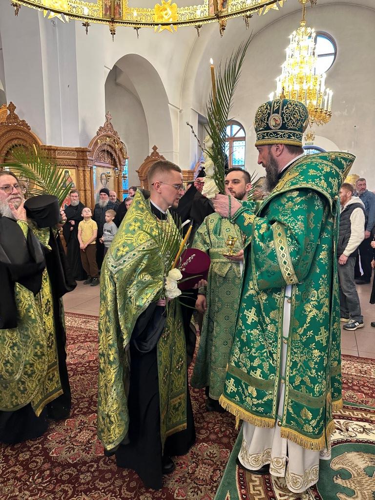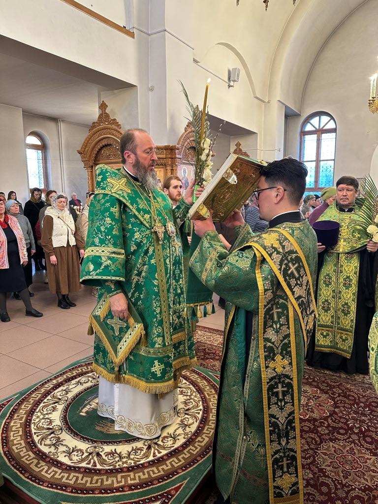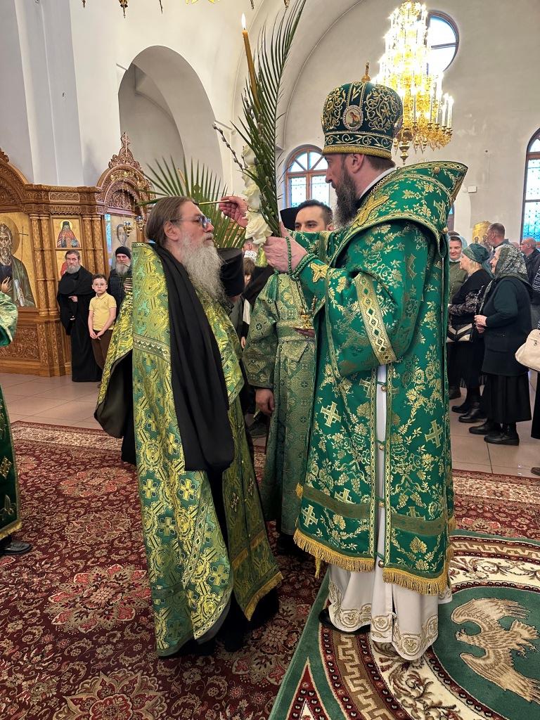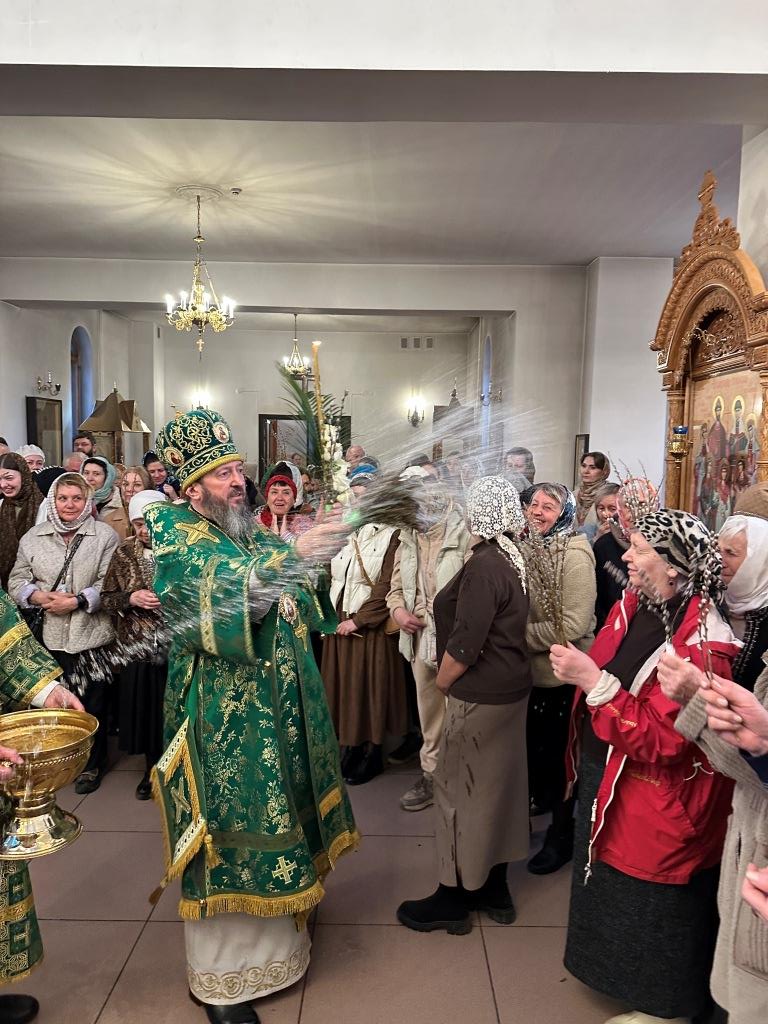 На полиелее читался отрывок из Евангелия от Матфея, повествующий о торжественном входе Господа Иисуса Христа в Иерусалим на осленке. После чтения Евангелия и 50-го псалма Владыка архиепископ вознес особую молитву и окропил ветви верб святой водой, после чего помазал клир и паству освященным елеем.