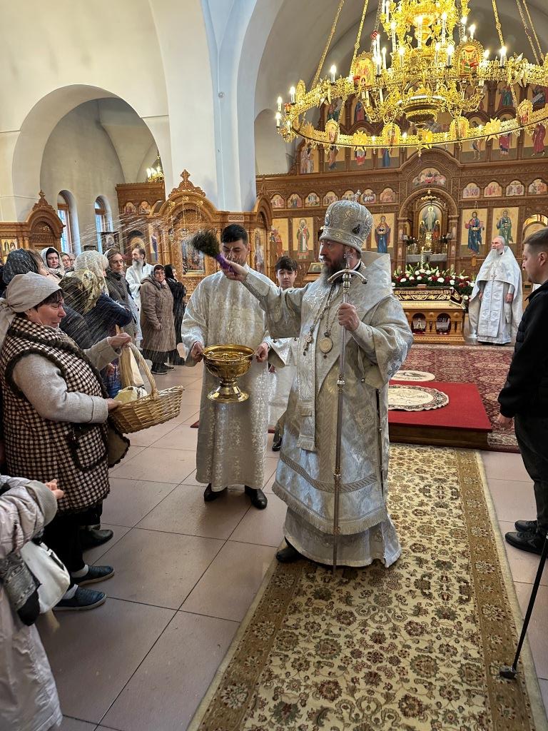 После богослужения Архипастырь призвал на молящихся Божие благословение и совершил первое освящение пасхальной снеди.