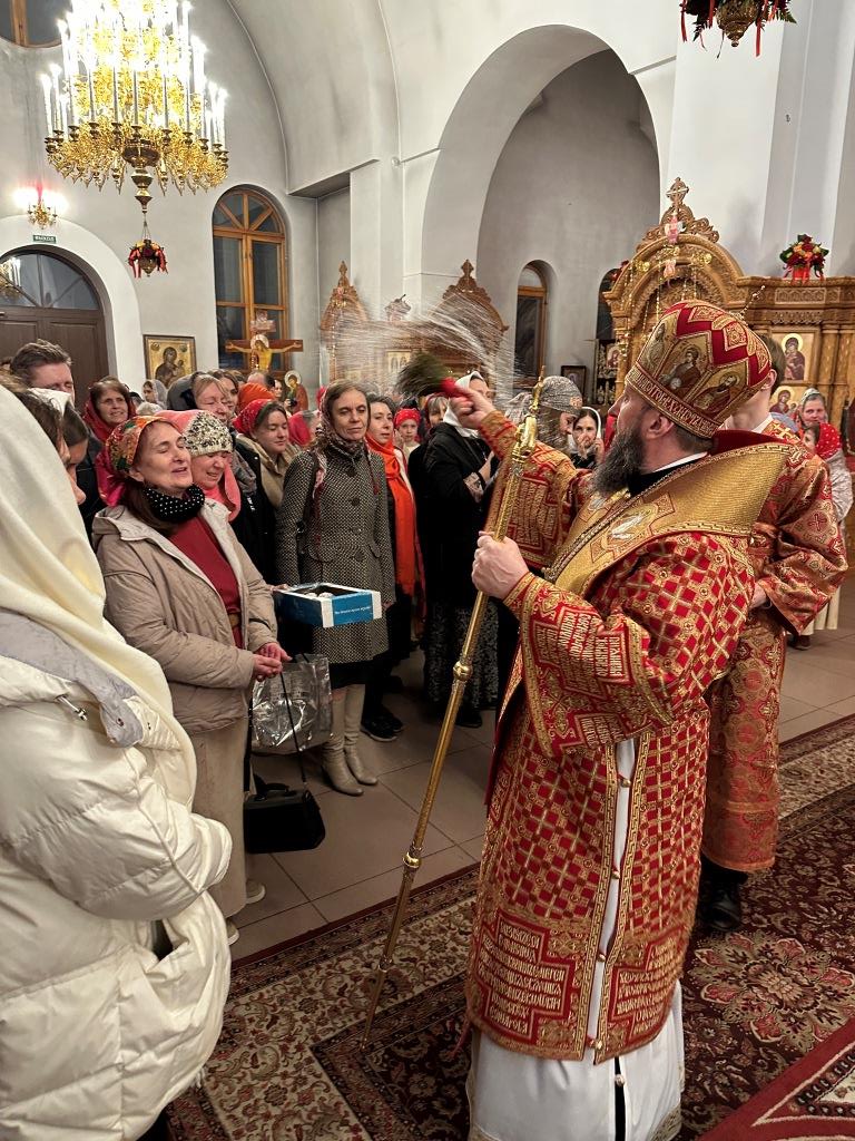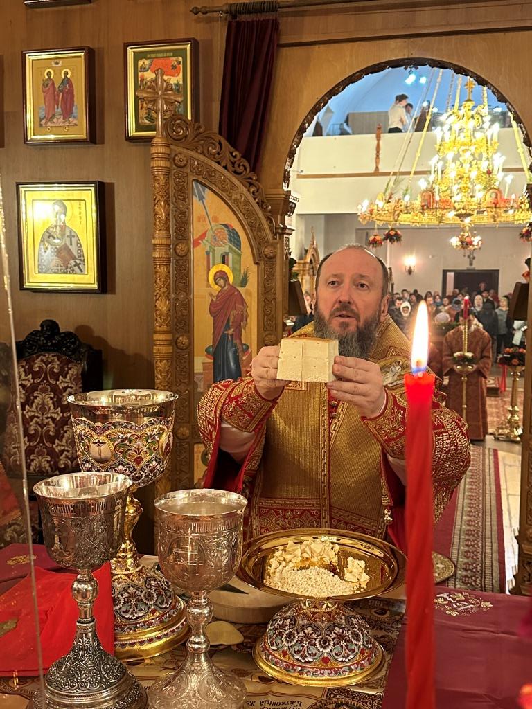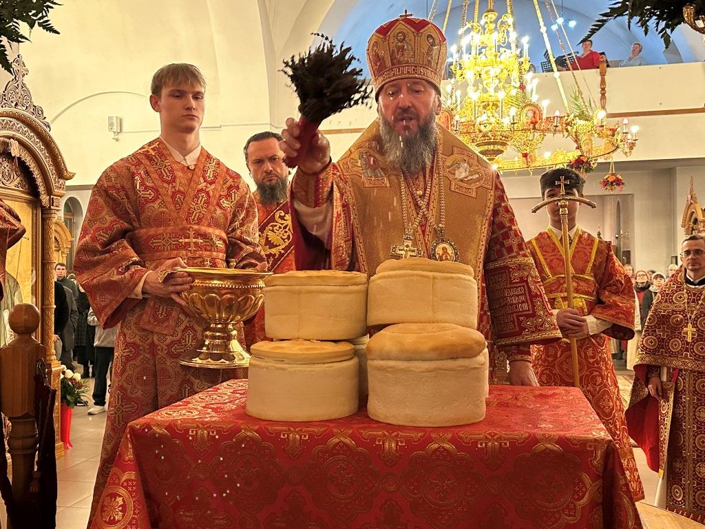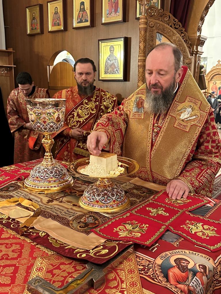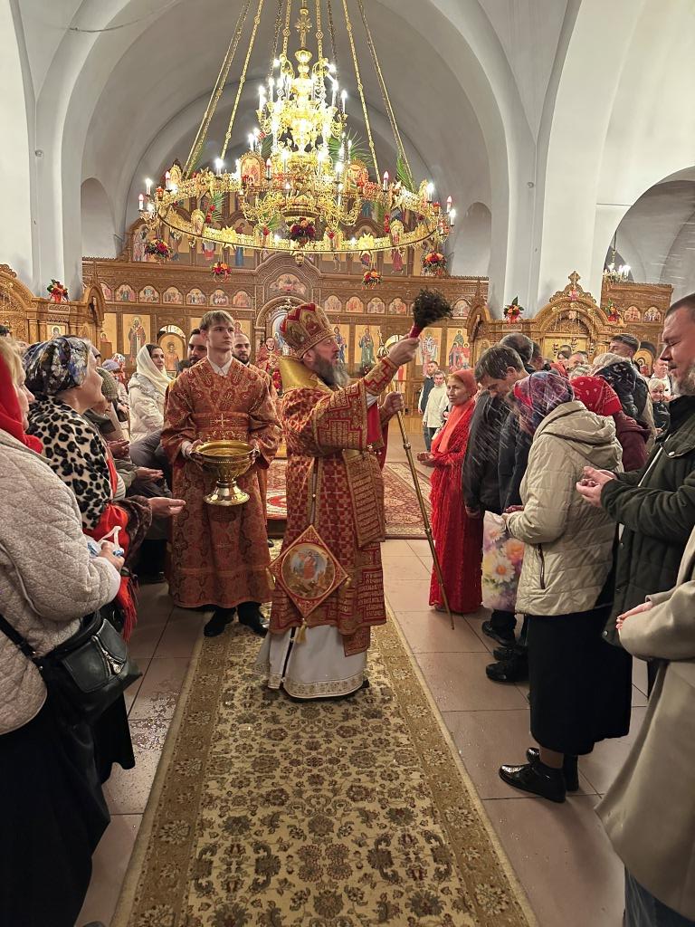 В завершение Богослужения Владыка Амфилохий освятил пасхальную трапезу: крашеные яйца, пасхи и куличи.