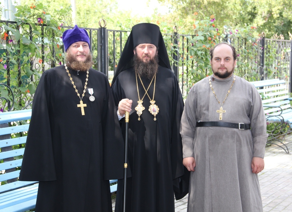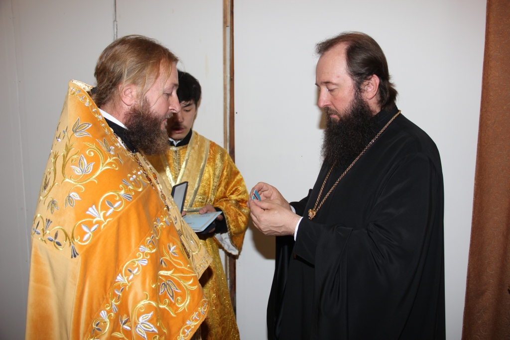 В день праздника Владыка Амфилохий во внимание за усердные труды на благо Святой Православной Церкви наградил иерея Евгения Яганова юбилейной медалью в честь 10-летия учреждения Митрополичьего Округа в Республике Казахстан.